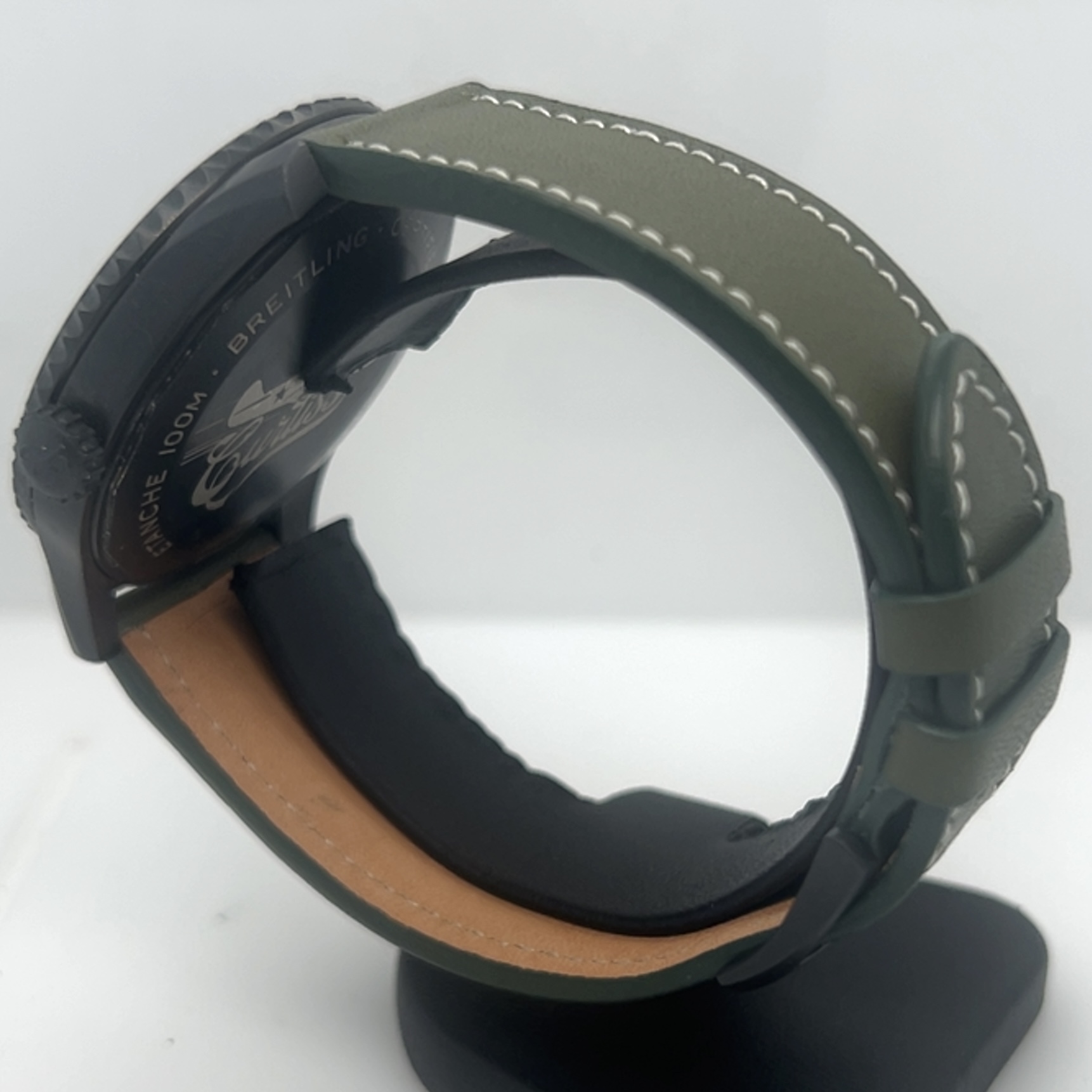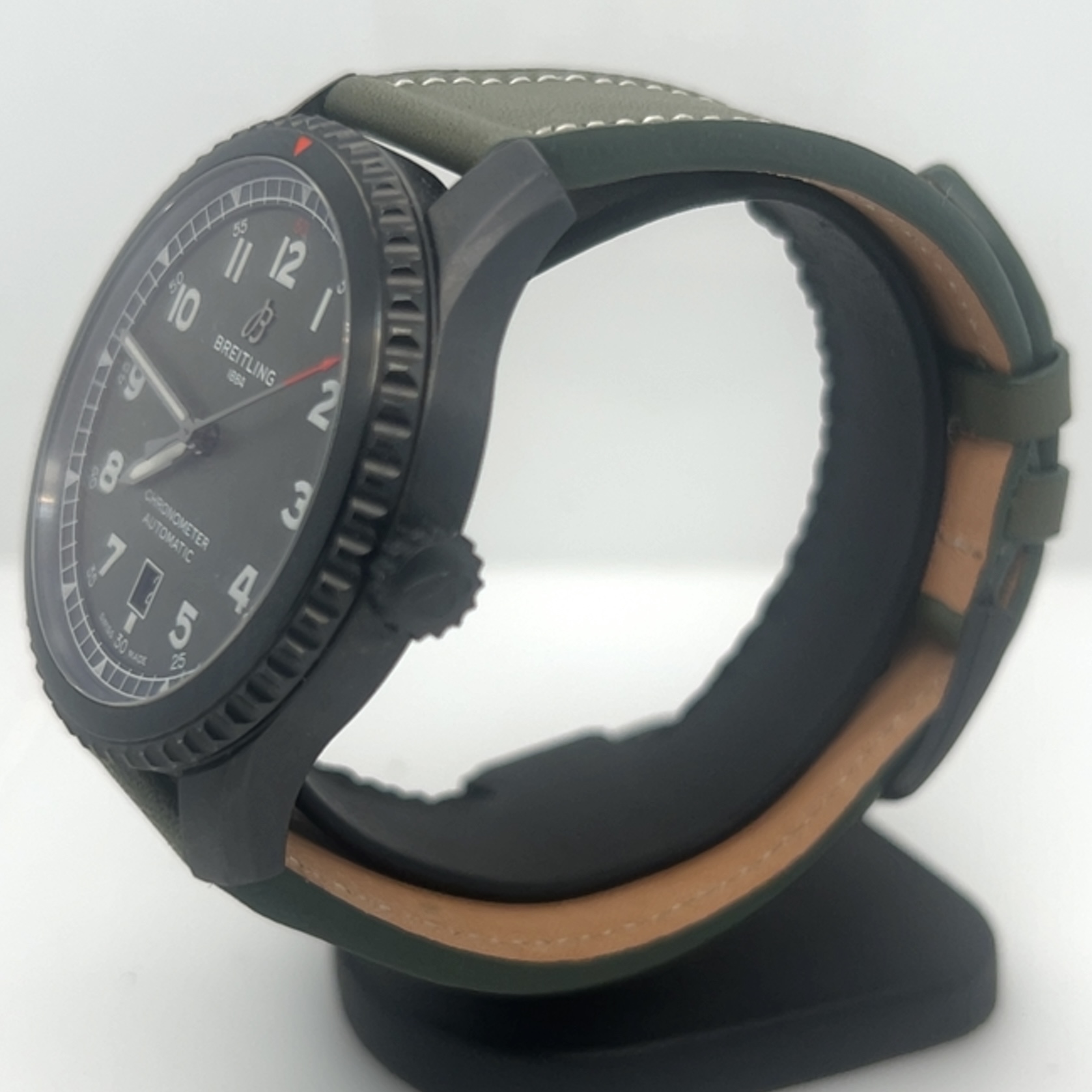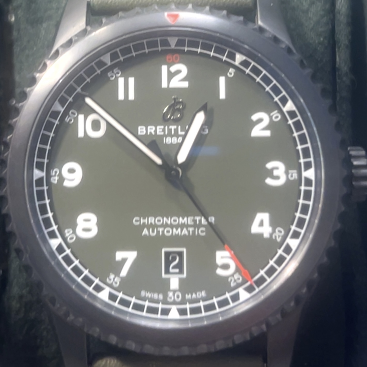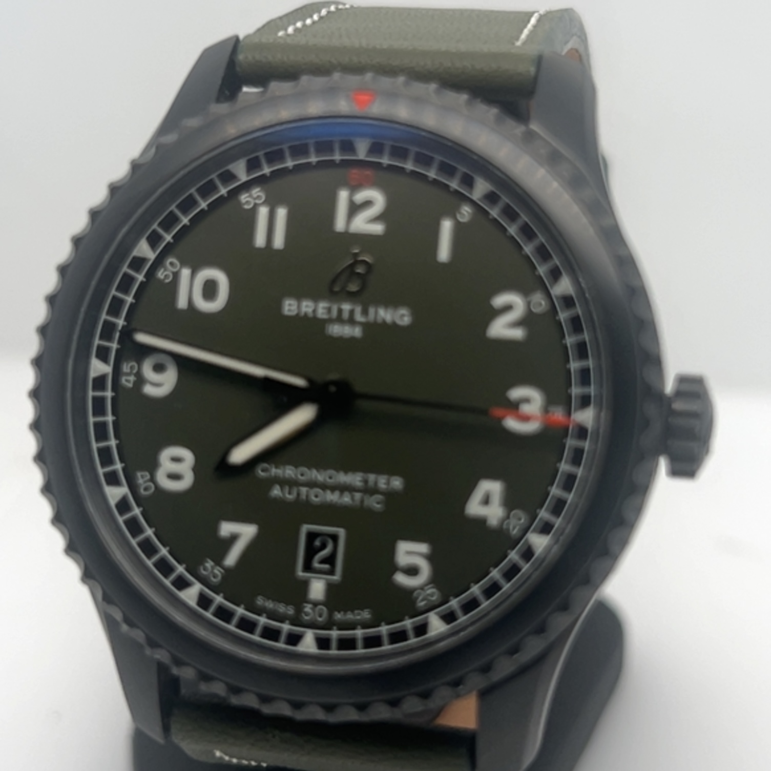 Prachtige Breitling Aviator 8 automatic 41 black steel (Curtiss Warhawk), zwart stalen kast (DLC -coating ) 41 mm ,donkere groene militaire wijzerplaat ,arabische cijfers met super-luminova ,Automatisch uurwerk Breitling caliber 17 (COSC gecertificeerd) 38-40 uur gangreserve ,Bol saffier glas met dubbele antireflectie coating ,water dicht tot 10 bar .Dit ontwerp is een eerbetoon aan de curtiss P-40 warhawk -vliegtuigen .Helaas geen certificaat maar wel 18 maanden garantie voor de prijs van 2.999 euro
