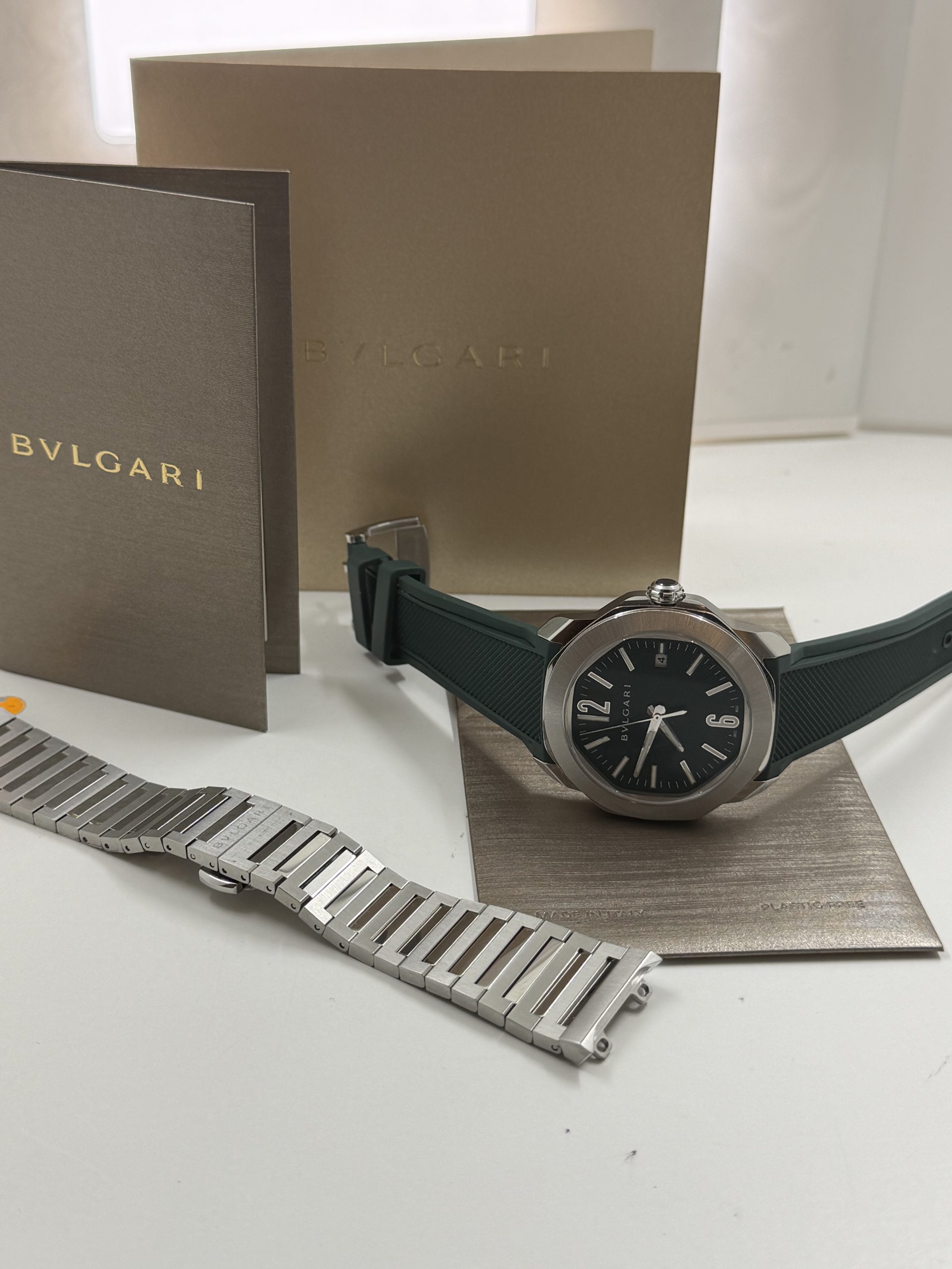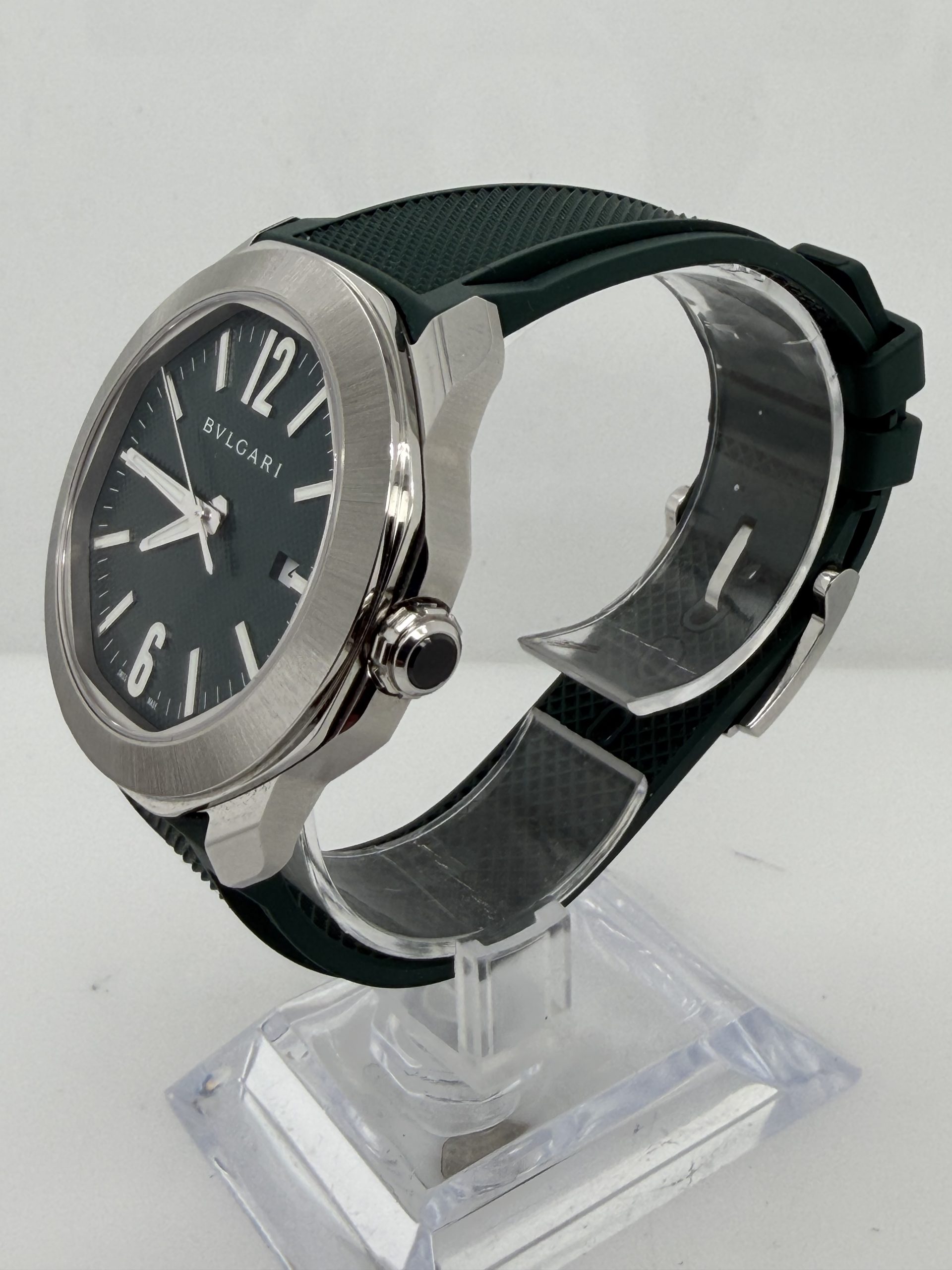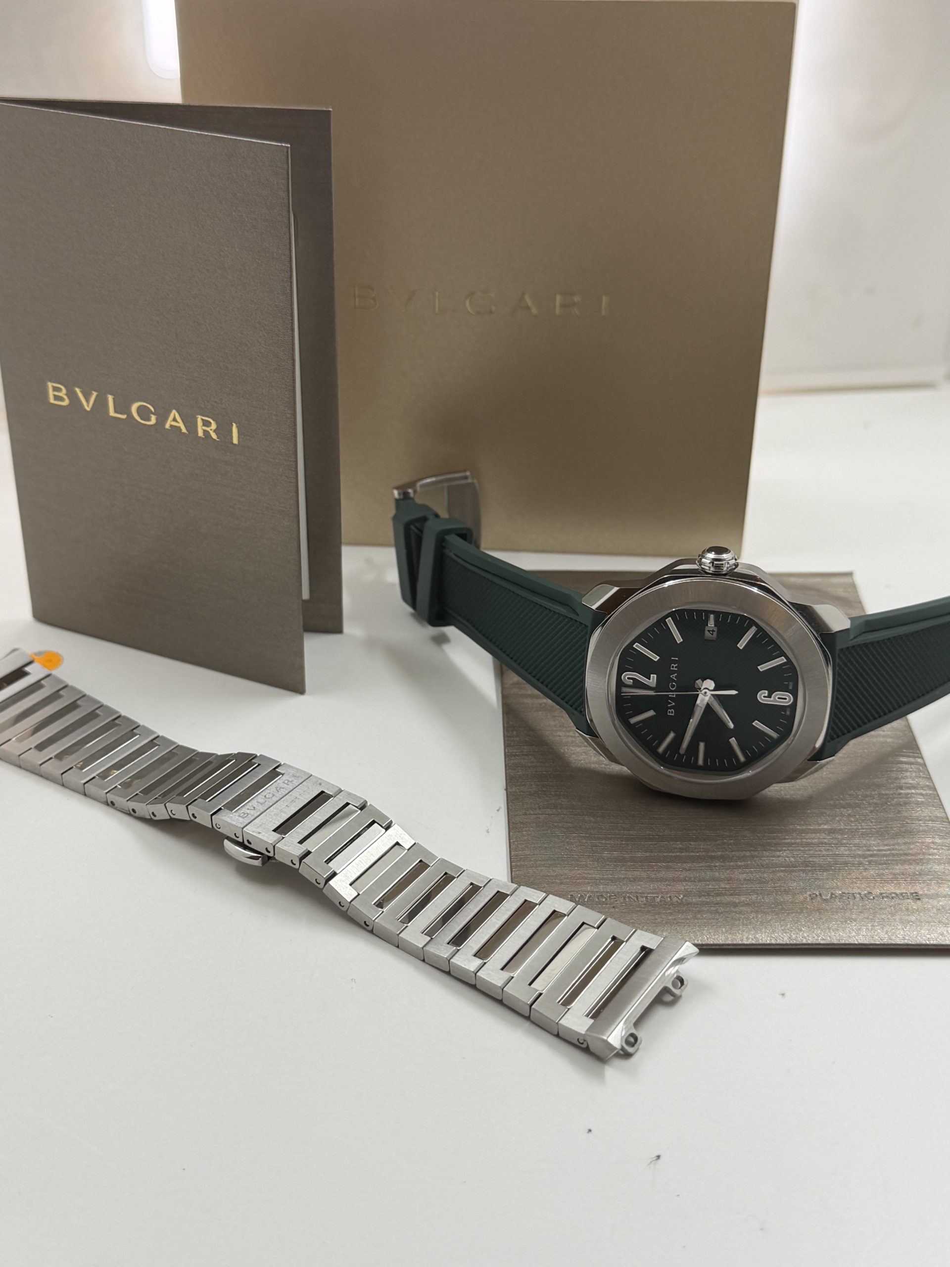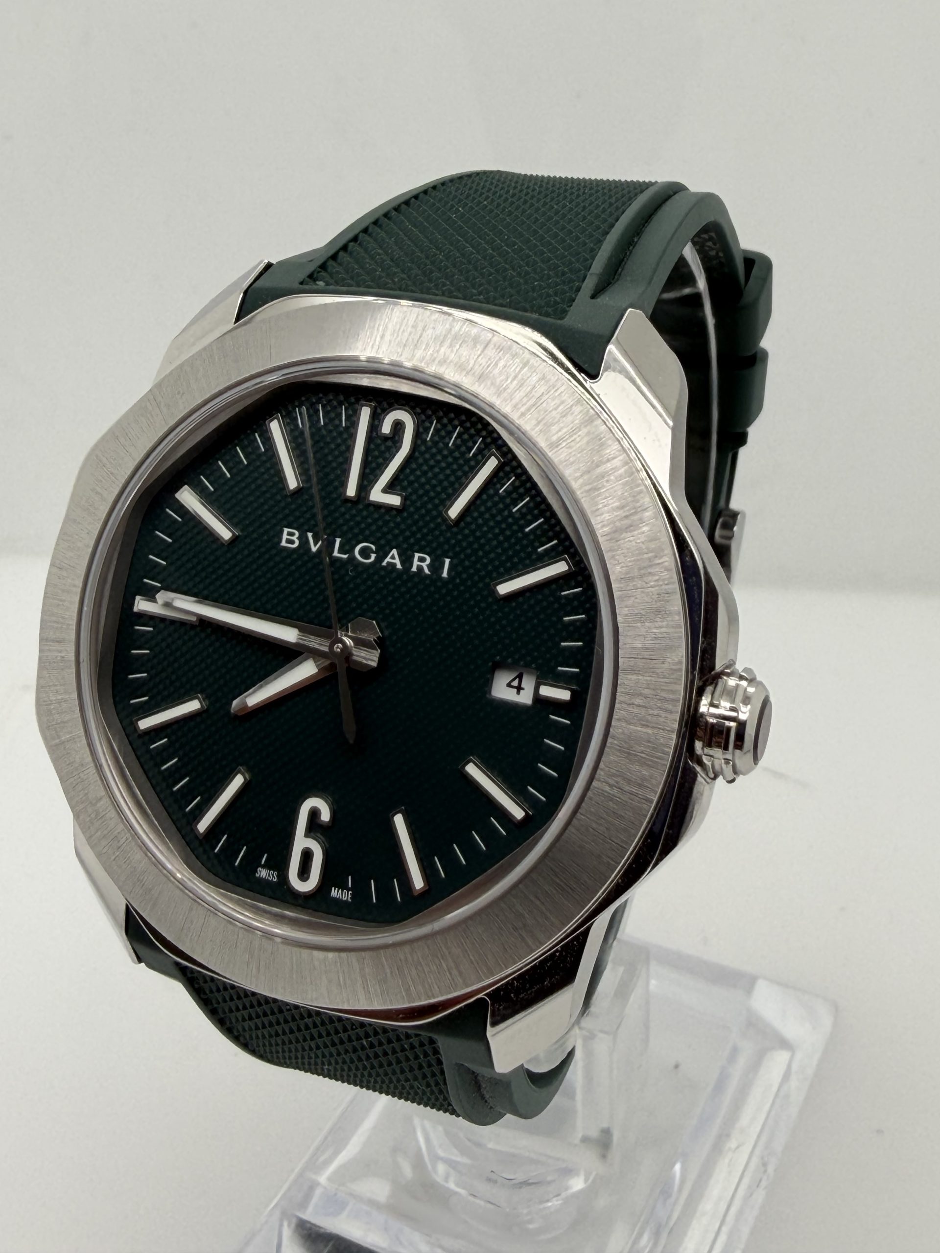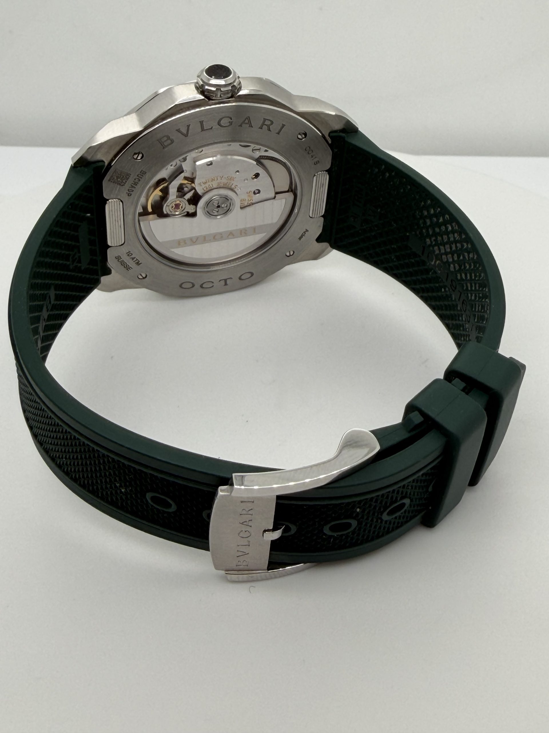 Prachtig en modern herenhorloge van het luxe Italiaanse merk Bvlgari uit de iconische Octo Roma collectie .Dit model combineert Romeinse architectuur met Zwitserse horlogetechniek en heeft de kenmerkende octagonale kast die direct herkenbaar is .Het horloge heeft een 41mm roestvrijstalen kast met een stijlvolle groene ‘clous de Paris’ wijzerplaat ,automatisch uurwerk BVL191 manufactuur met een gangreserve van ~42 uur ,waterbestendig tot 100 meter , groene rubberen band met gespsluiting met een extra stalenband , komt met het certificaat voor de prijs van € 5450