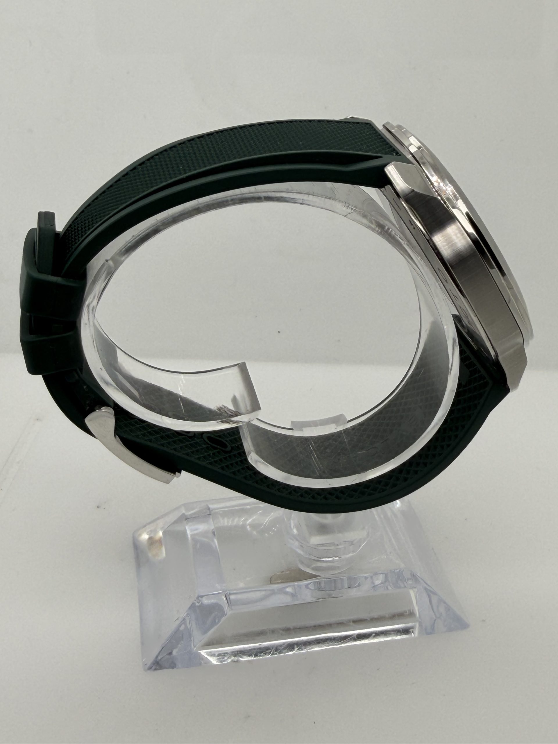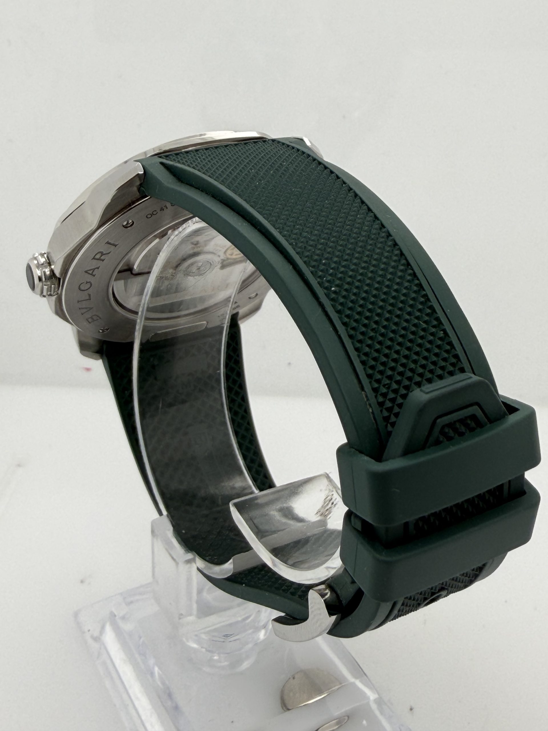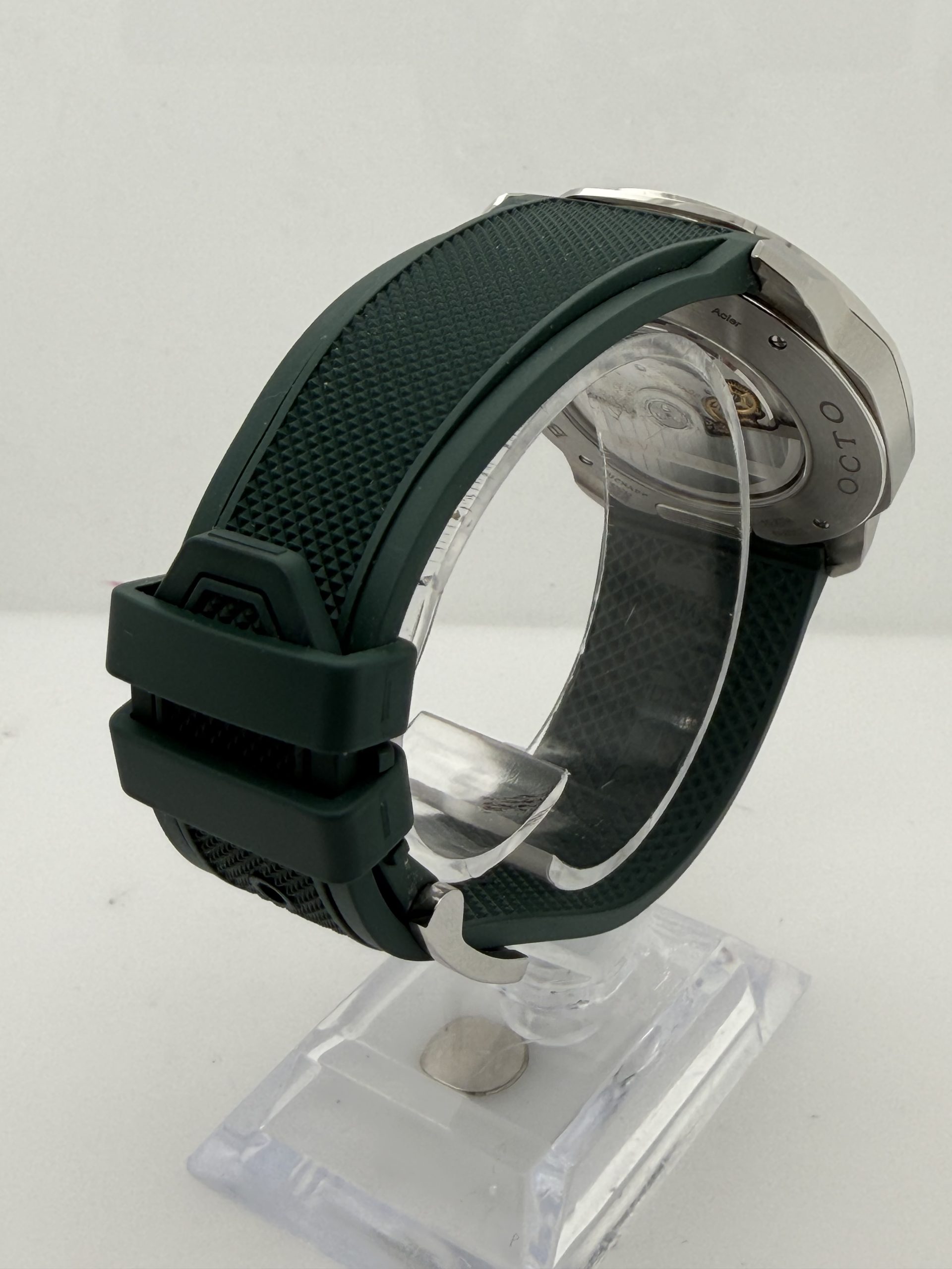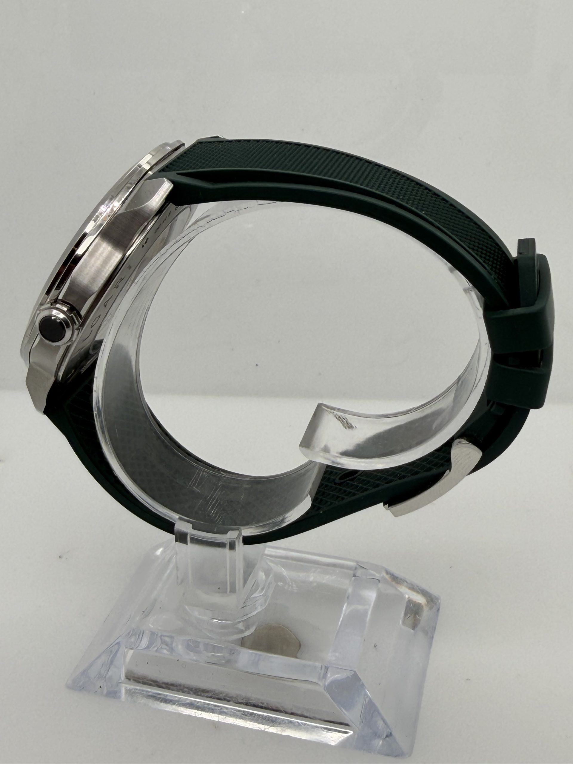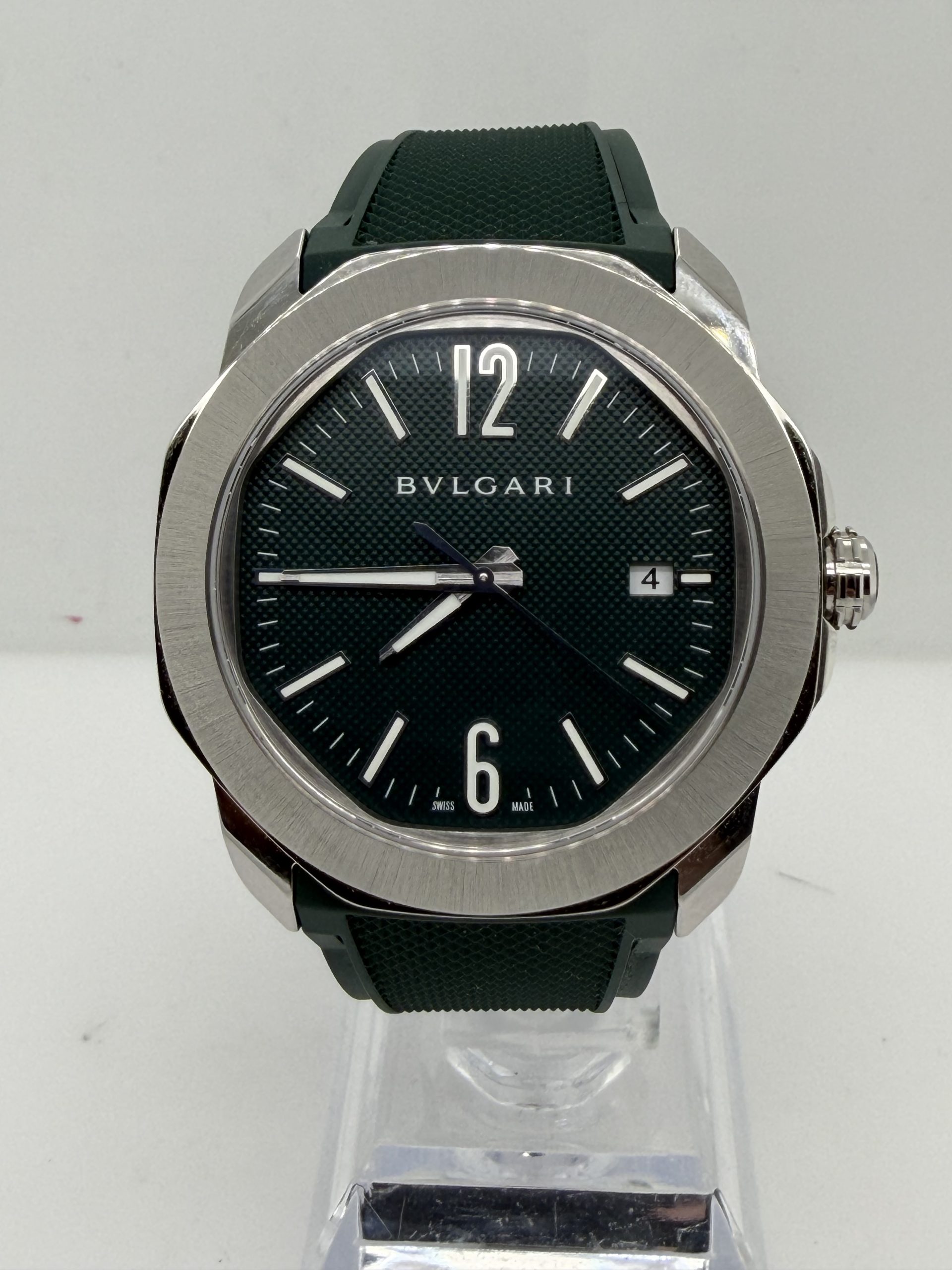 Prachtig en modern herenhorloge van het luxe Italiaanse merk Bvlgari uit de iconische Octo Roma collectie .Dit model combineert Romeinse architectuur met Zwitserse horlogetechniek en heeft de kenmerkende octagonale kast die direct herkenbaar is .Het horloge heeft een 41mm roestvrijstalen kast met een stijlvolle groene ‘clous de Paris’ wijzerplaat ,automatisch uurwerk BVL191 manufactuur met een gangreserve van ~42 uur ,waterbestendig tot 100 meter , groene rubberen band met gespsluiting met een extra stalenband , komt met het certificaat voor de prijs van € 5450