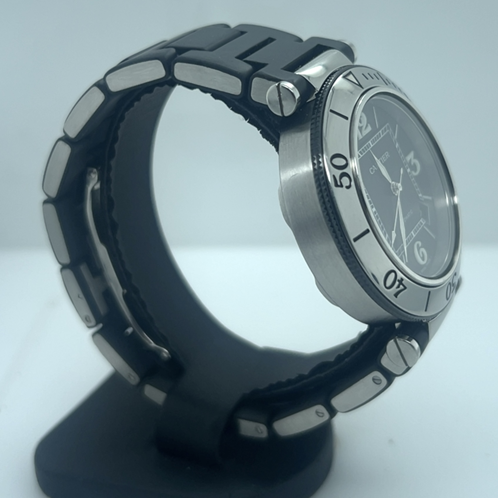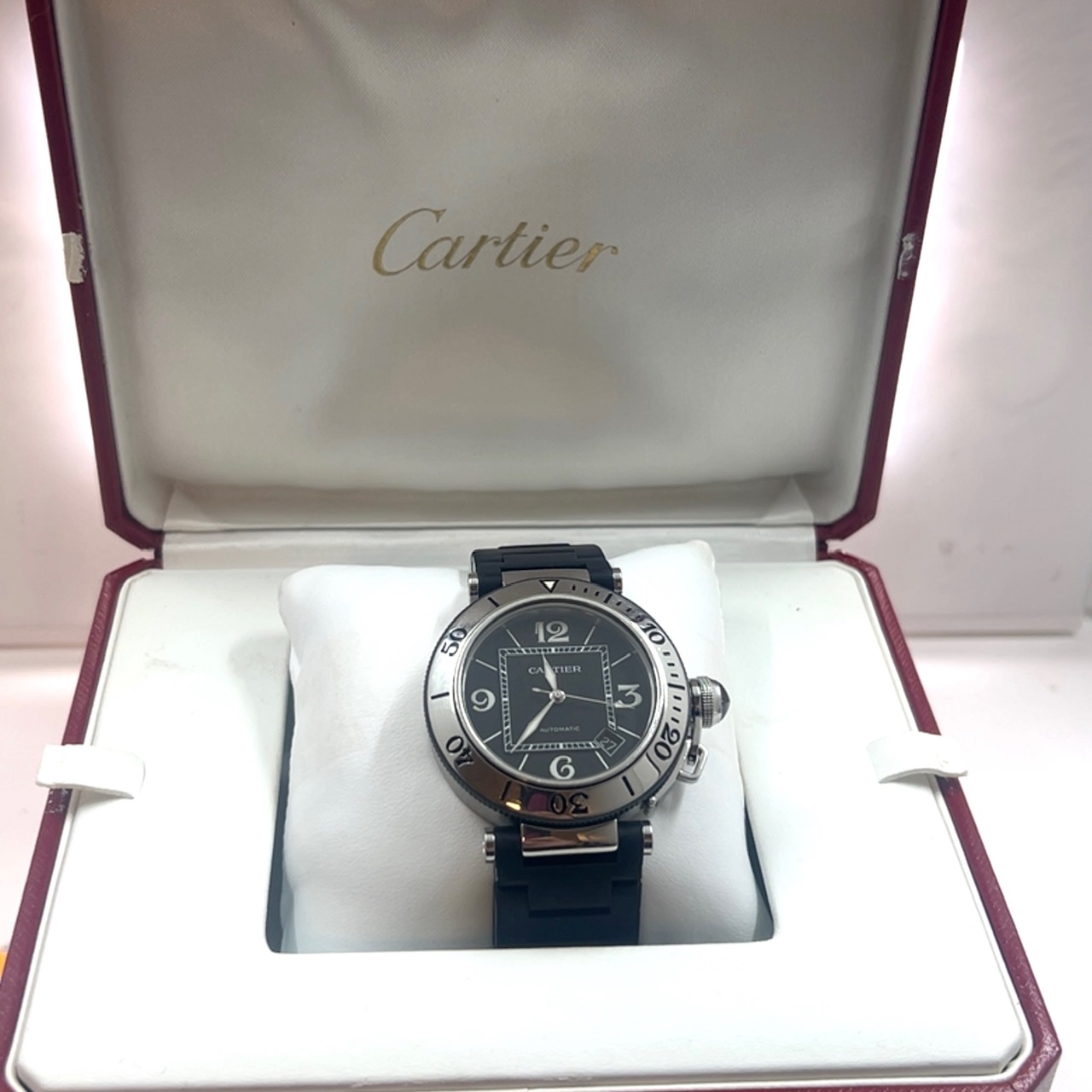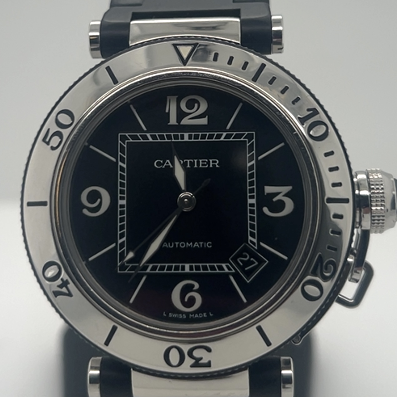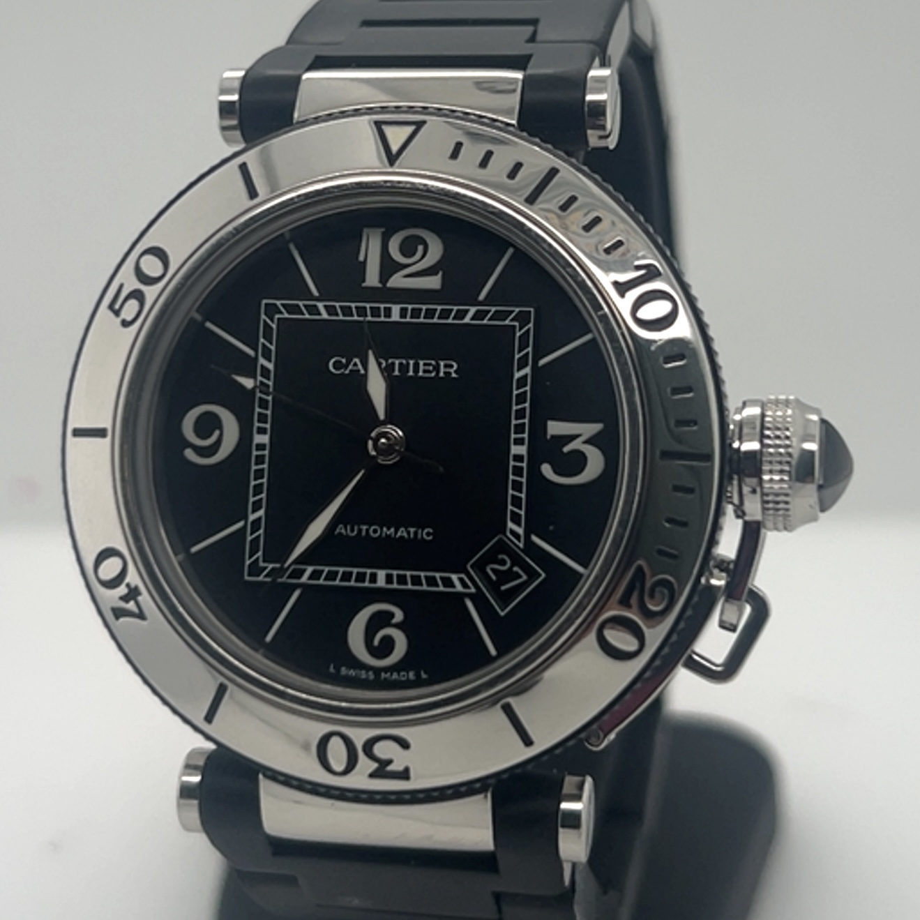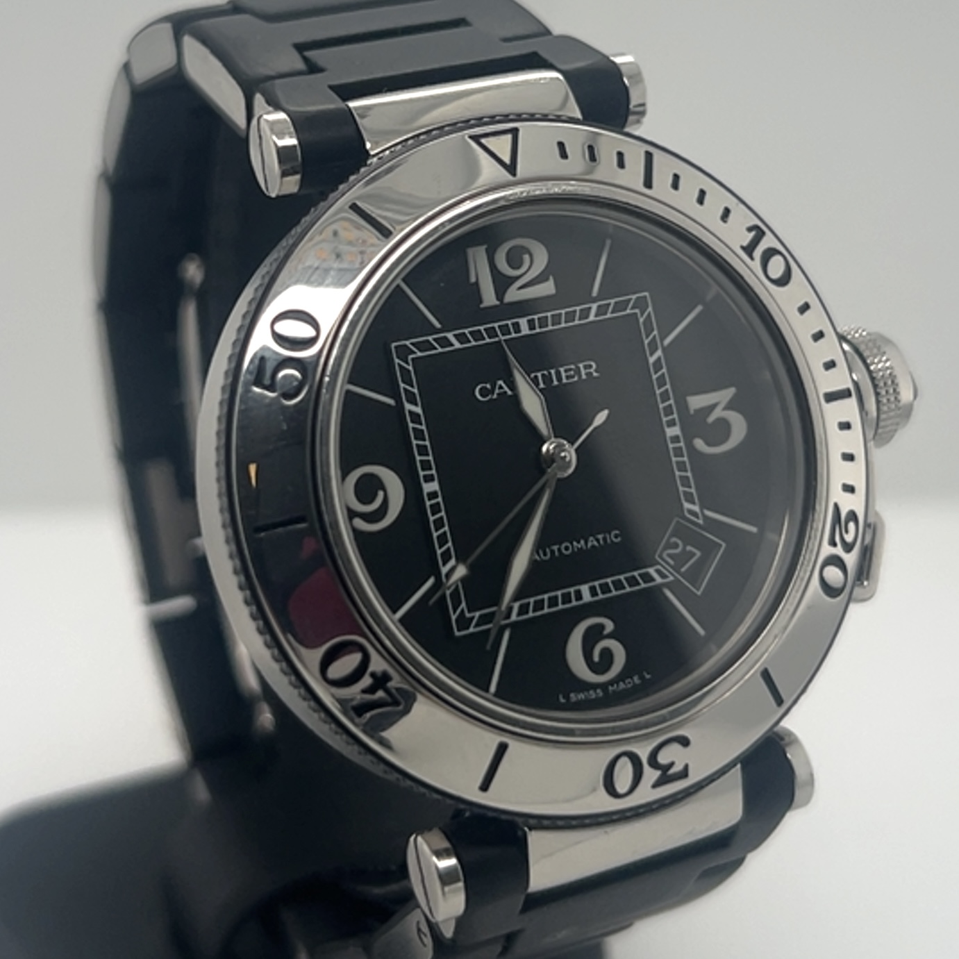 Cartier Pasha Seatimer met referentie 2790 heeft een roestvrij stalen kast van 40 mm en een dikte van 12 mm ,unidirectioneel roterende stalen bezel (sportieve duik/sport- look), zwarte wijzerplaat met arabische cijfers op 3-6-9-12 en indexmarkeringen ,luminieuze wijzers en markeringen voor zichtbaarheid in het donker ,saffierglas , Zwart rubberstrap (Caoutchouc Strap) met verborgen vlindersluiting , automatisch uurwerk (Cartier Calibre 049 met een power reserve circa~42 uur, datum aanduiding tussen 4-5 uur . Komt met onze winkelgarantie en factuur voor de prijs van 2.491 euro