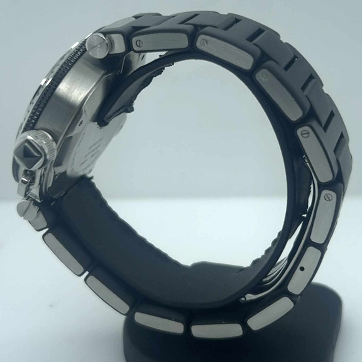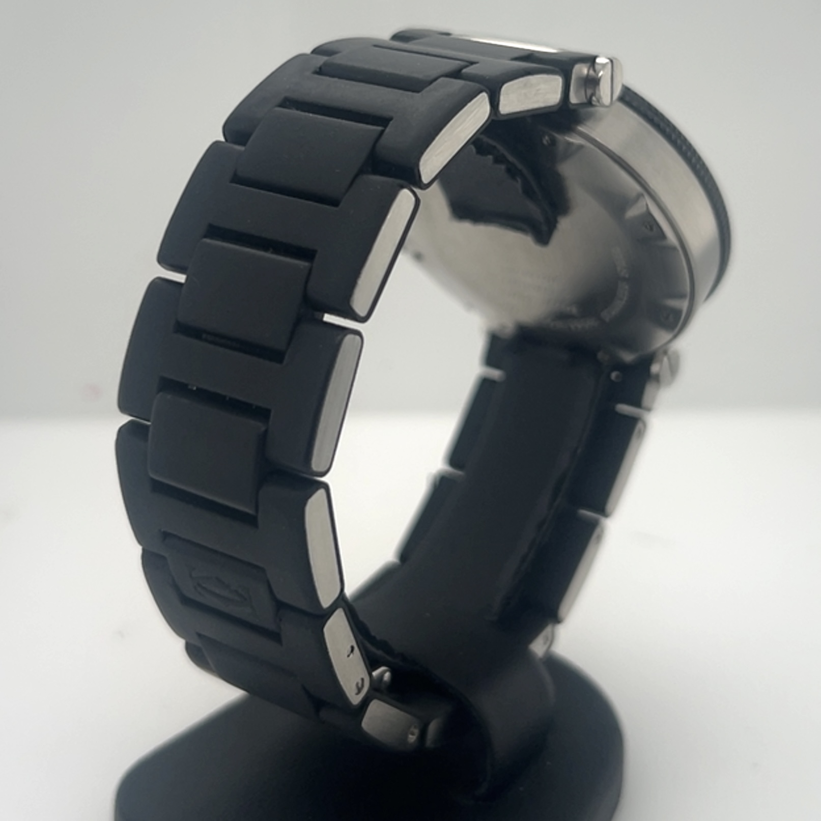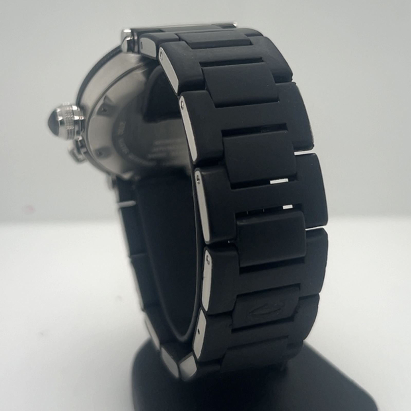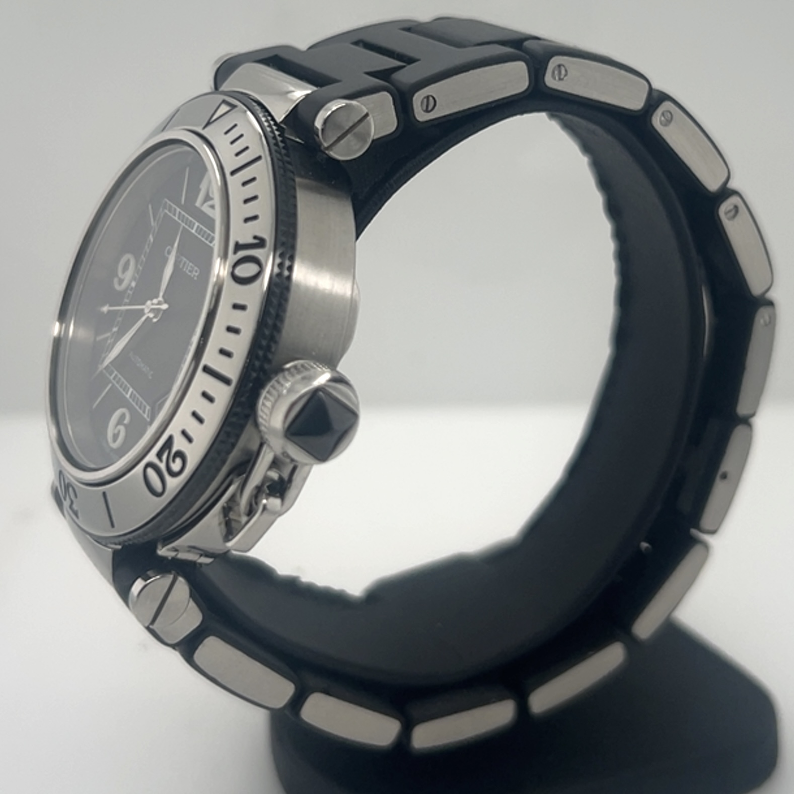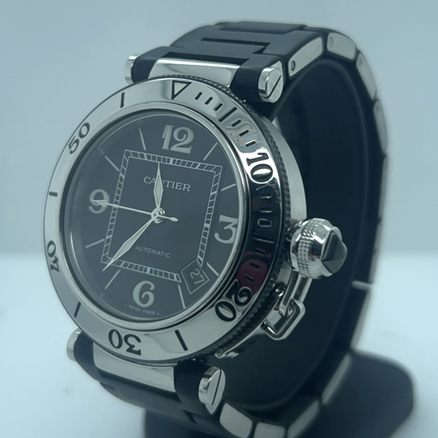 Cartier Pasha Seatimer met referentie 2790 heeft een roestvrij stalen kast van 40 mm en een dikte van 12 mm ,unidirectioneel roterende stalen bezel (sportieve duik/sport- look), zwarte wijzerplaat met arabische cijfers op 3-6-9-12 en indexmarkeringen ,luminieuze wijzers en markeringen voor zichtbaarheid in het donker ,saffierglas , Zwart rubberstrap (Caoutchouc Strap) met verborgen vlindersluiting , automatisch uurwerk (Cartier Calibre 049 met een power reserve circa~42 uur, datum aanduiding tussen 4-5 uur . Komt met onze winkelgarantie en factuur voor de prijs van 2.491 euro