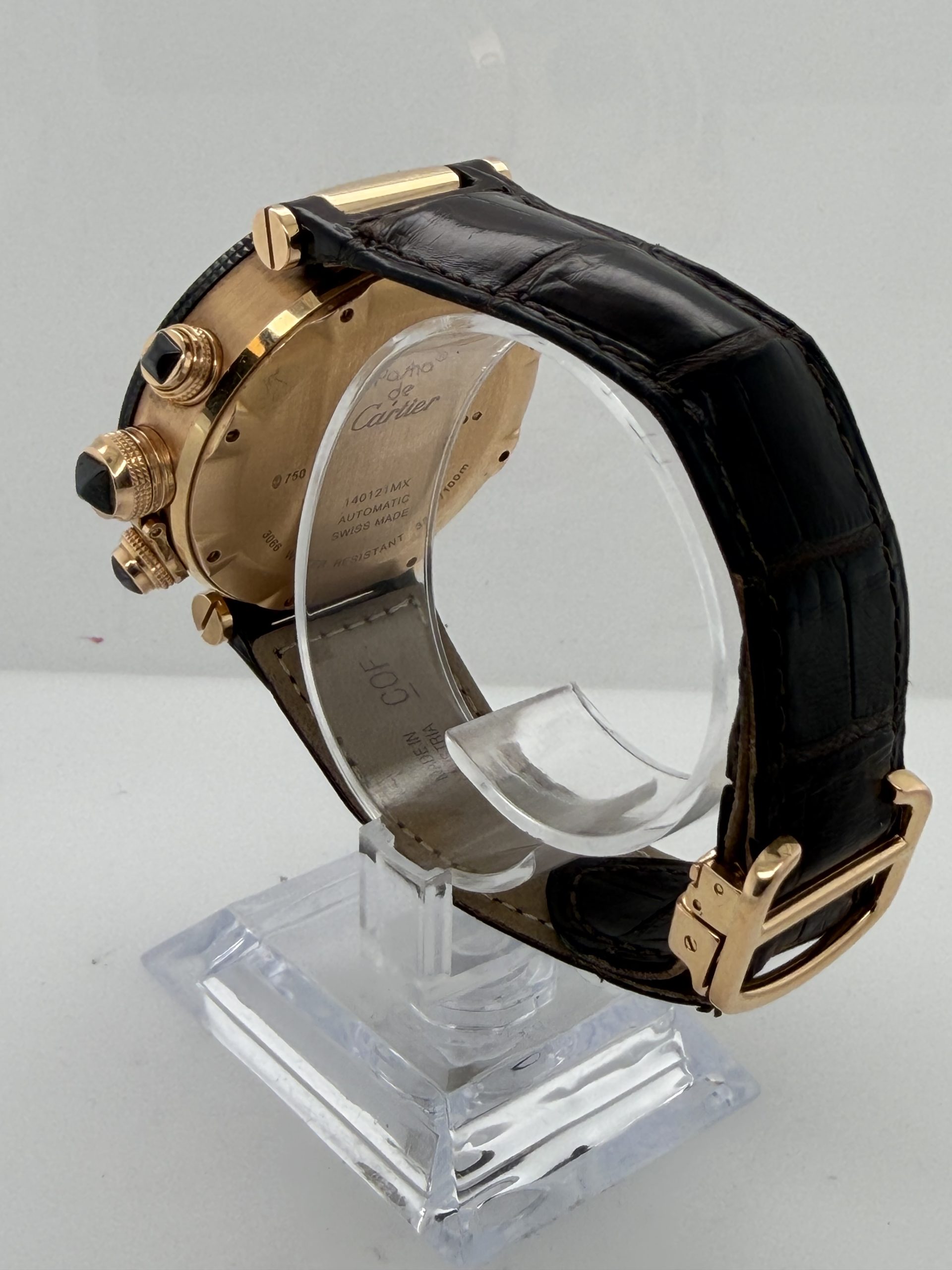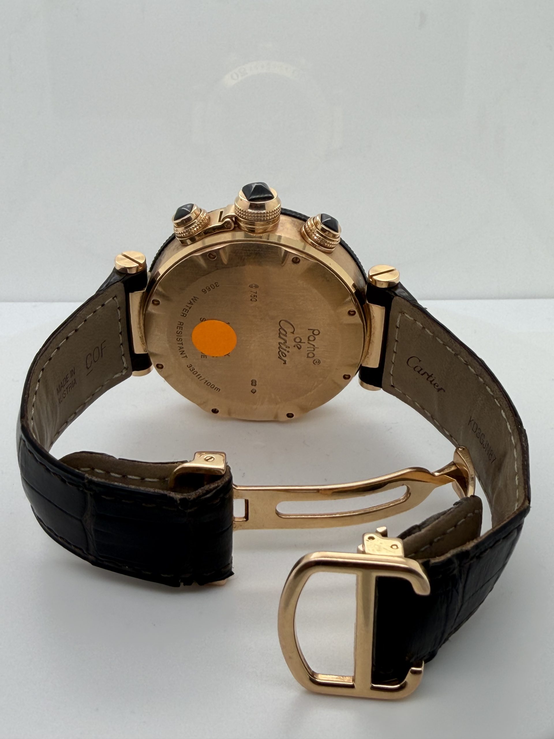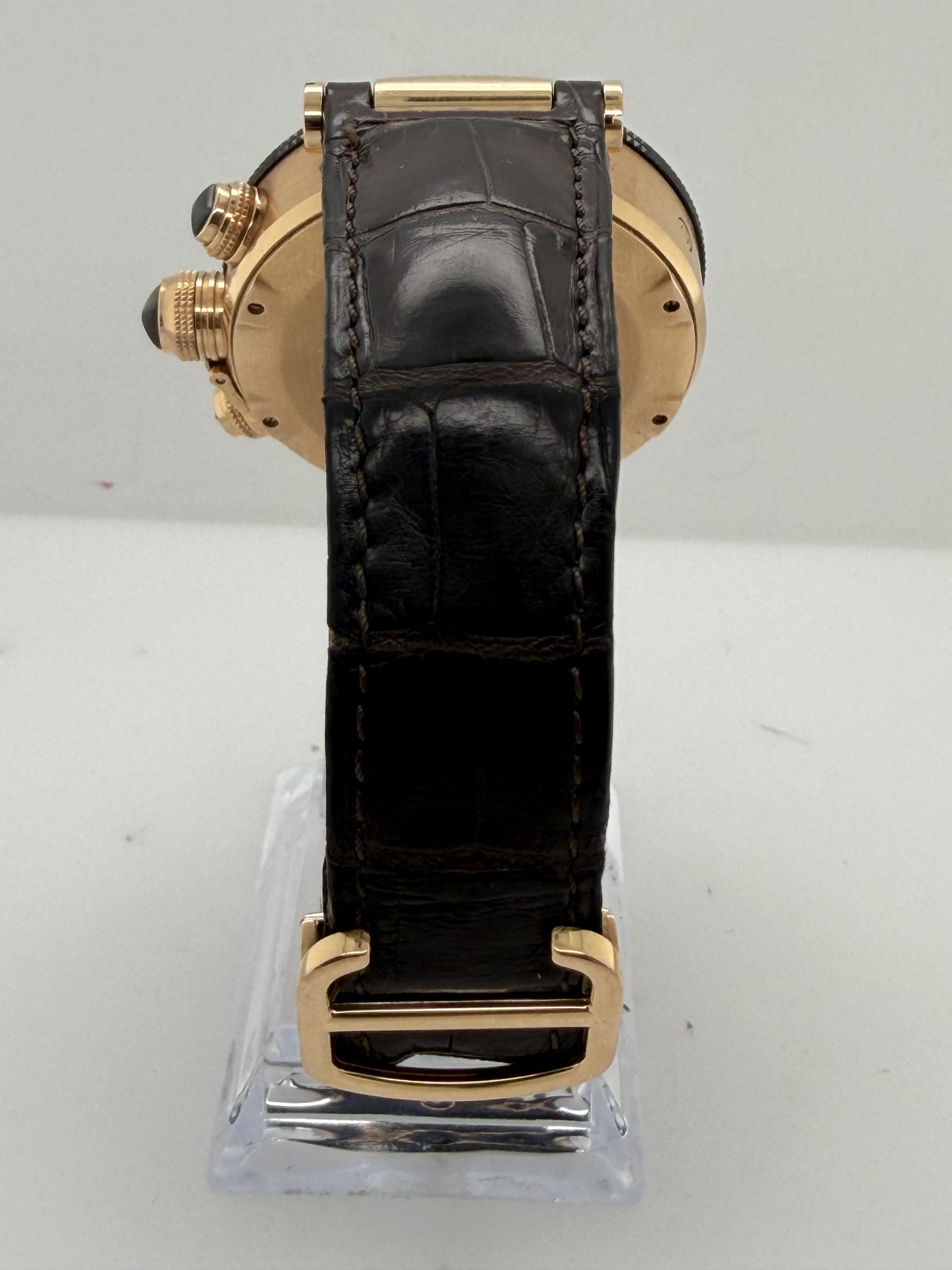 De Cartier Pasha met referentie W3030018 behoort tot de iconische Pasha de Cartier-collectie en is een luxe herenhorloge dat sportieve functionaliteit combineert met klassieke elegantie . Dit model valt vooral op door zijn robuuste uitstraling . De 18k rosegouden kast is 42 mm en heeft een automatisch uurwerk (Cartier calibre 8100 MC) met een gangreserve van circa ~48 uur , zwarte wijzerplaat met Arabische cijfers , chronograaf , datum , uren , minuten , seconden , krasbestendig saffierglas , bruine lederen krokoband met een deployment clasp , deze Cartier is een high-end luxe chronograaf dit is een horloge voor liefhebbers komt met het certificaat en de doos voor € 18.500