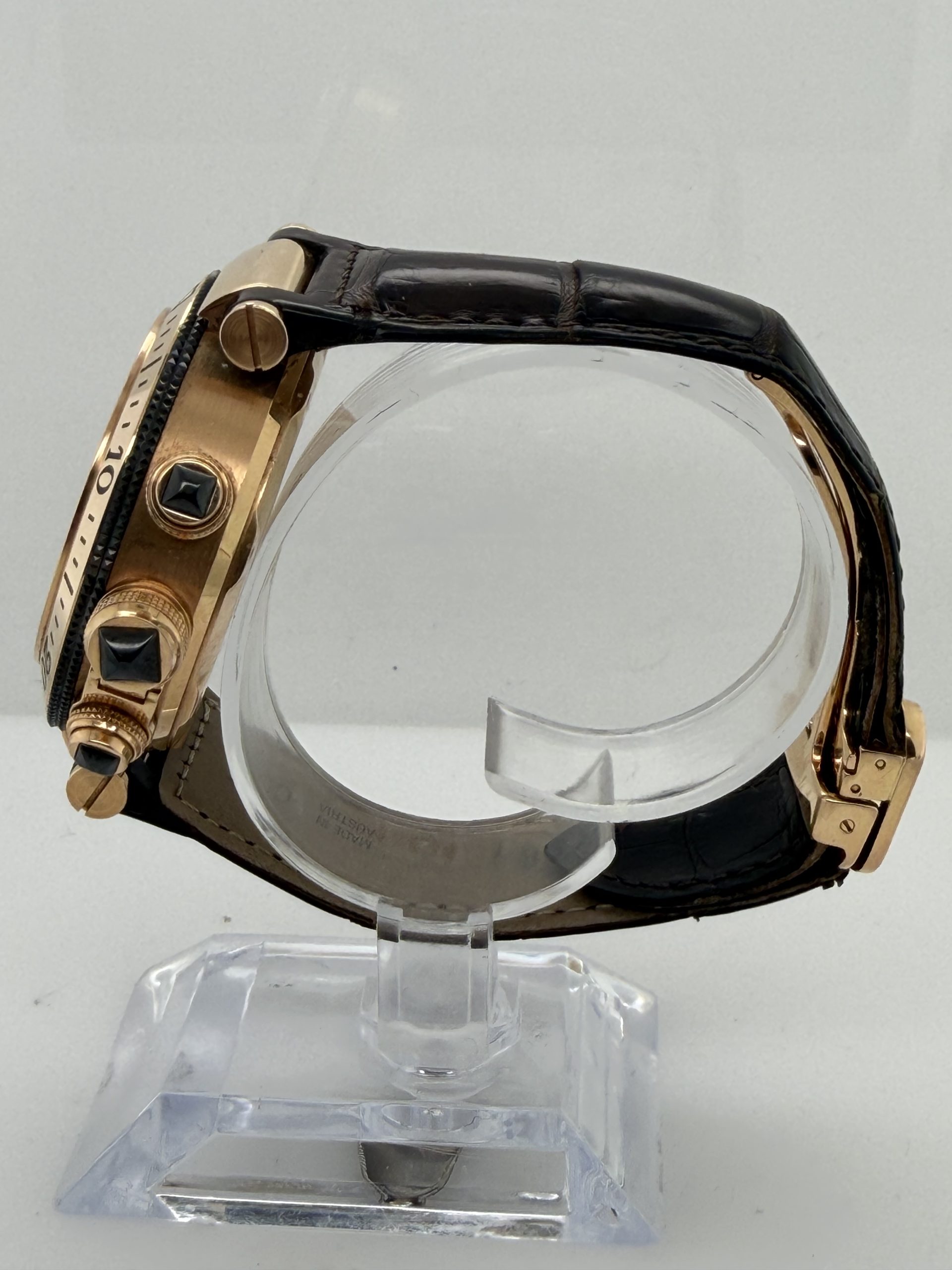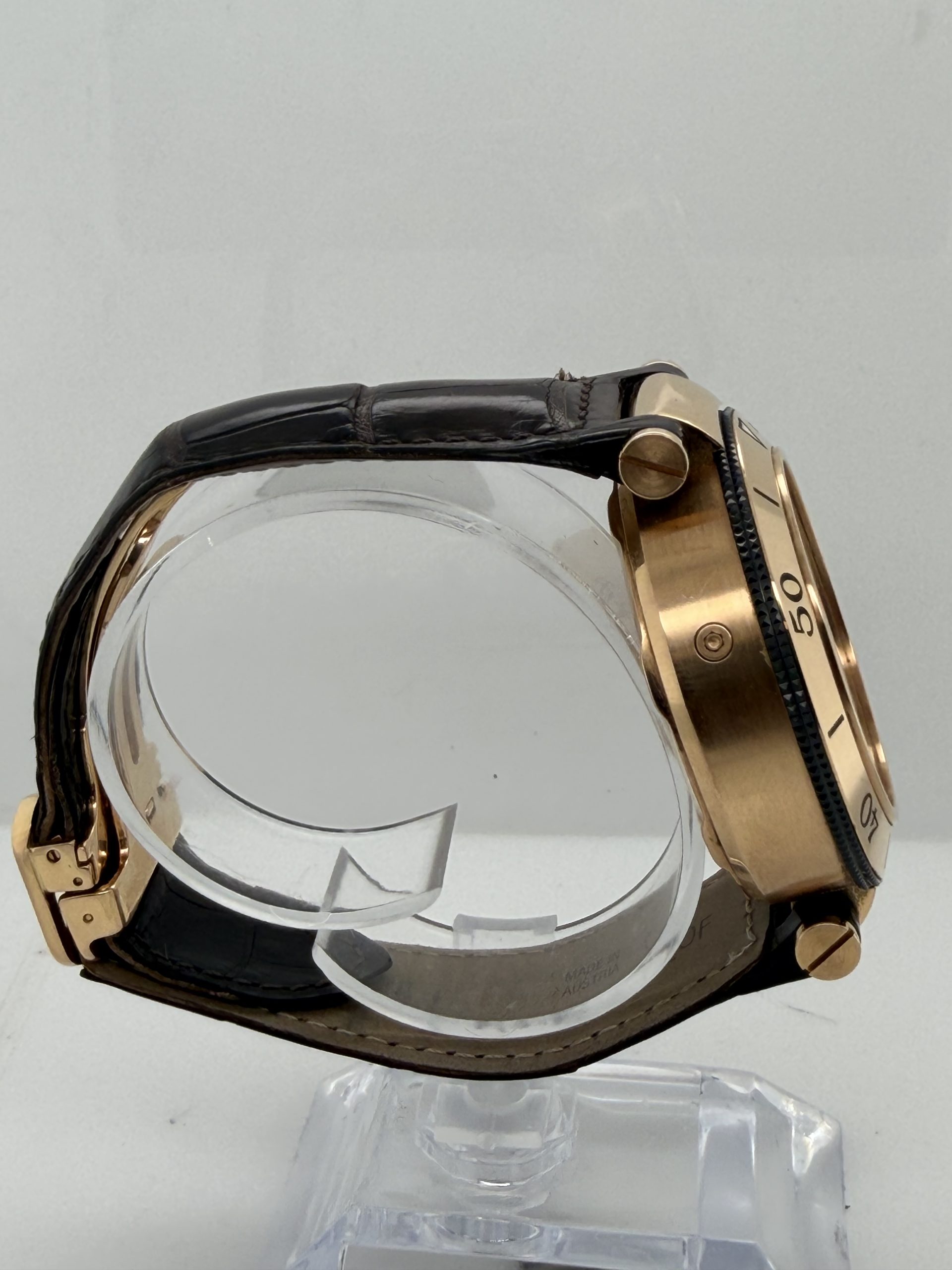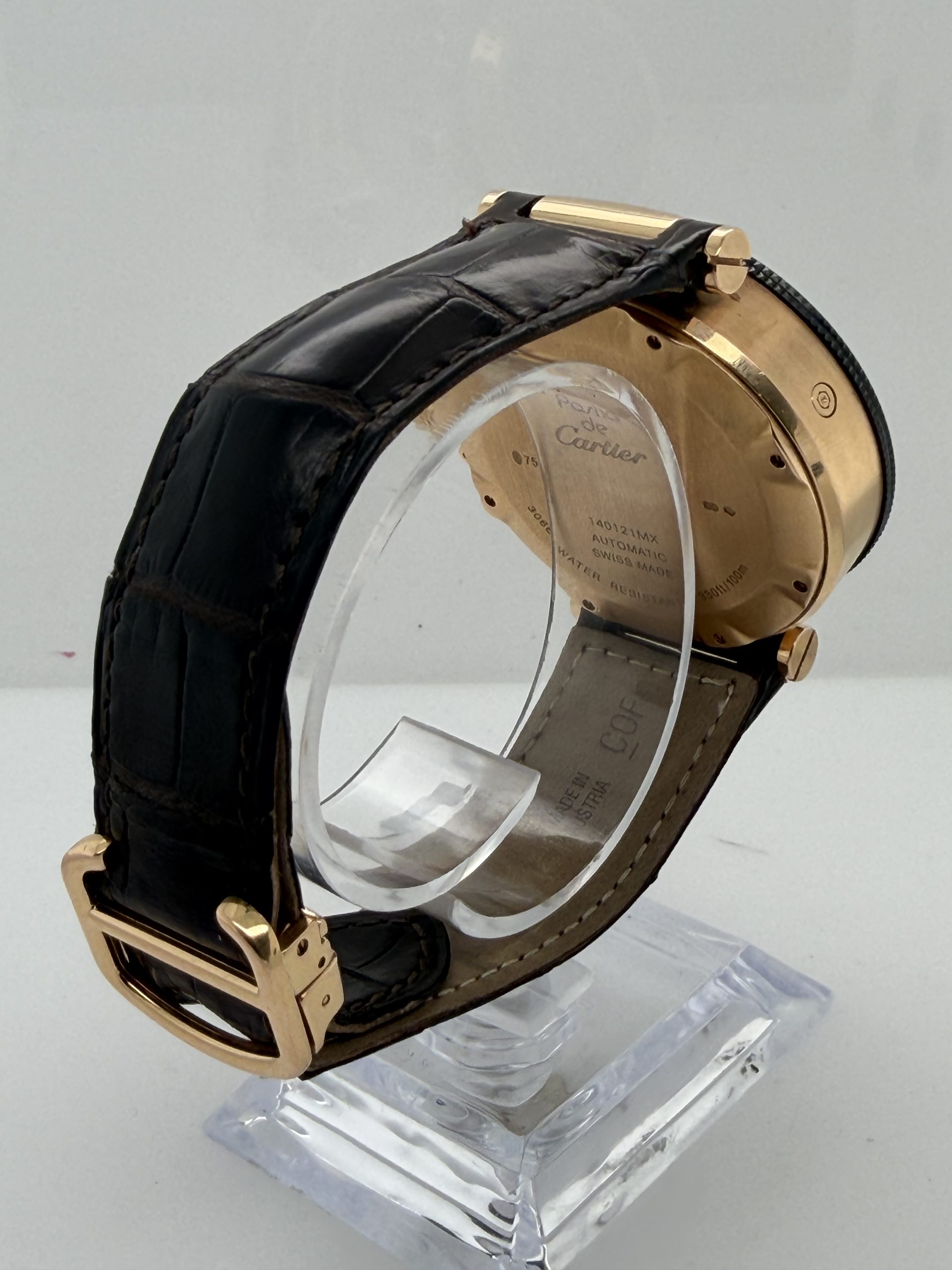 De Cartier Pasha met referentie W3030018 behoort tot de iconische Pasha de Cartier-collectie en is een luxe herenhorloge dat sportieve functionaliteit combineert met klassieke elegantie . Dit model valt vooral op door zijn robuuste uitstraling . De 18k rosegouden kast is 42 mm en heeft een automatisch uurwerk (Cartier calibre 8100 MC) met een gangreserve van circa ~48 uur , zwarte wijzerplaat met Arabische cijfers , chronograaf , datum , uren , minuten , seconden , krasbestendig saffierglas , bruine lederen krokoband met een deployment clasp , deze Cartier is een high-end luxe chronograaf dit is een horloge voor liefhebbers komt met het certificaat en de doos voor € 18.500