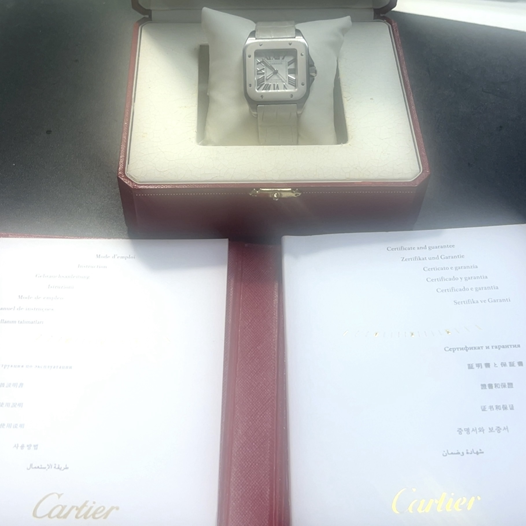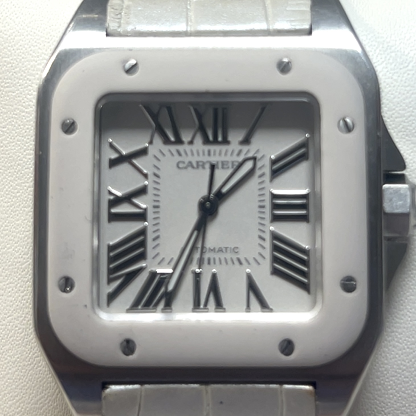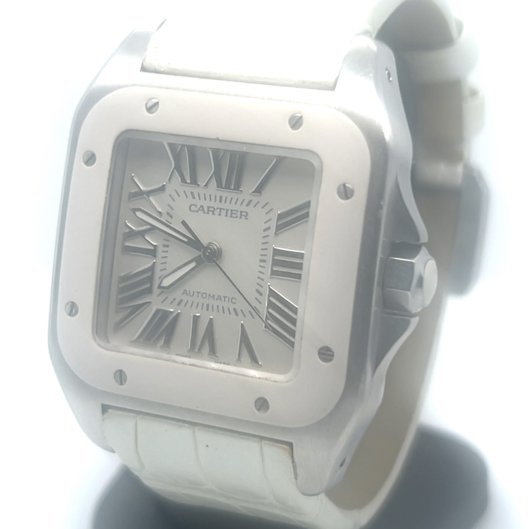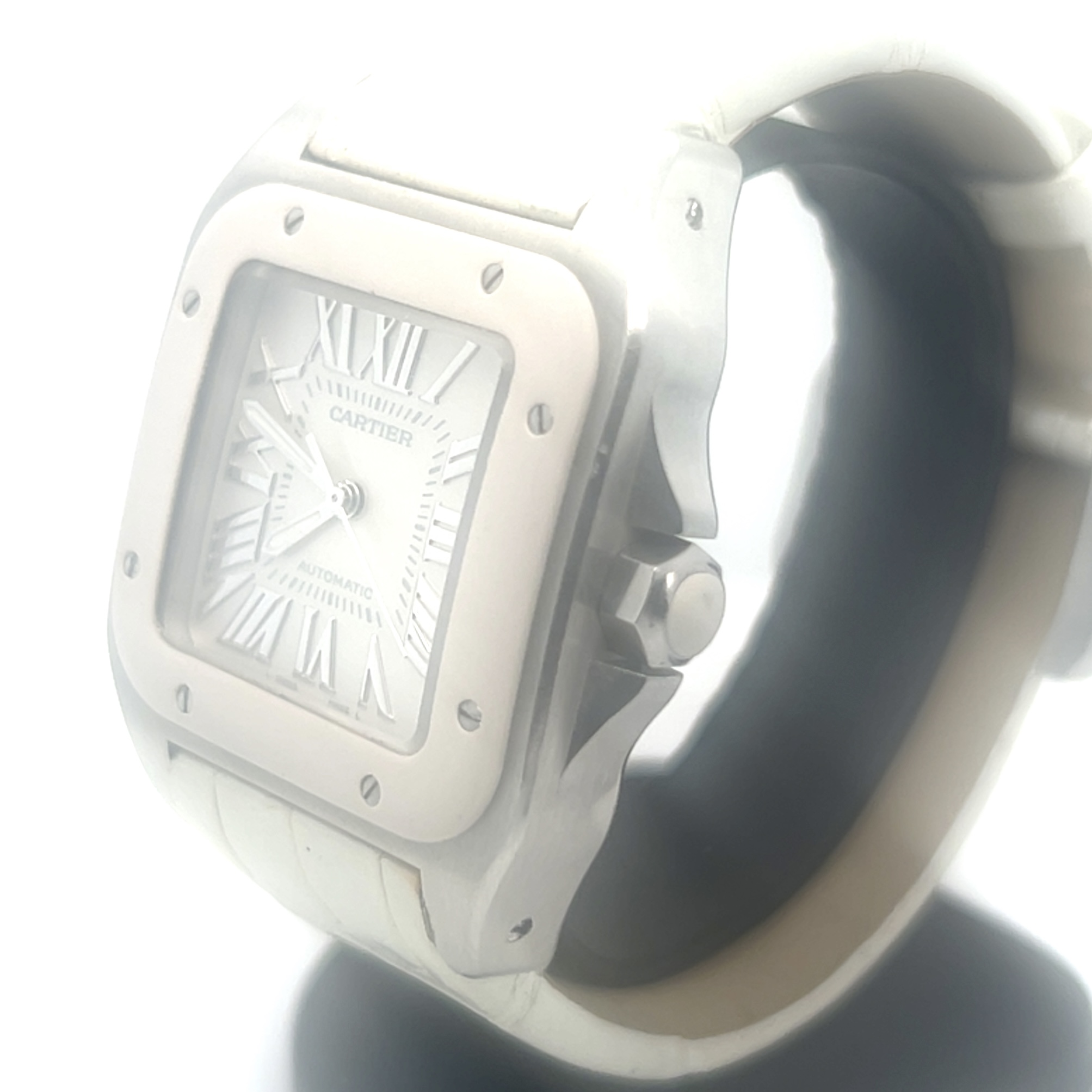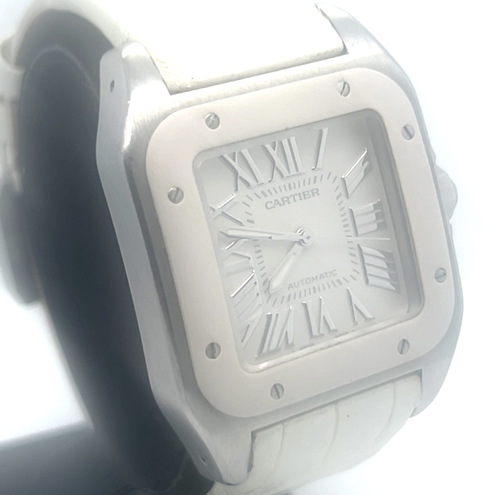 Zeer mooie Cartier Santos 100 midsize white edition(32×32 mm) ,met referentie W 20129U2 ,chronometer in het staal ,heeft een automatisch uurwerk cartier caliber 076 met een gangreserve van ca 36 u,witte rubberen lunette ,witte krokoband en een extra witte rubberen band ,,roemeinse indexen ,saffierglas met anti reflectie coating ,waterdicht tot 100 meter geschikt voor zwemmen , komt met certificaat 2013 en de originele doos voor de prijs van 3.674 euro
