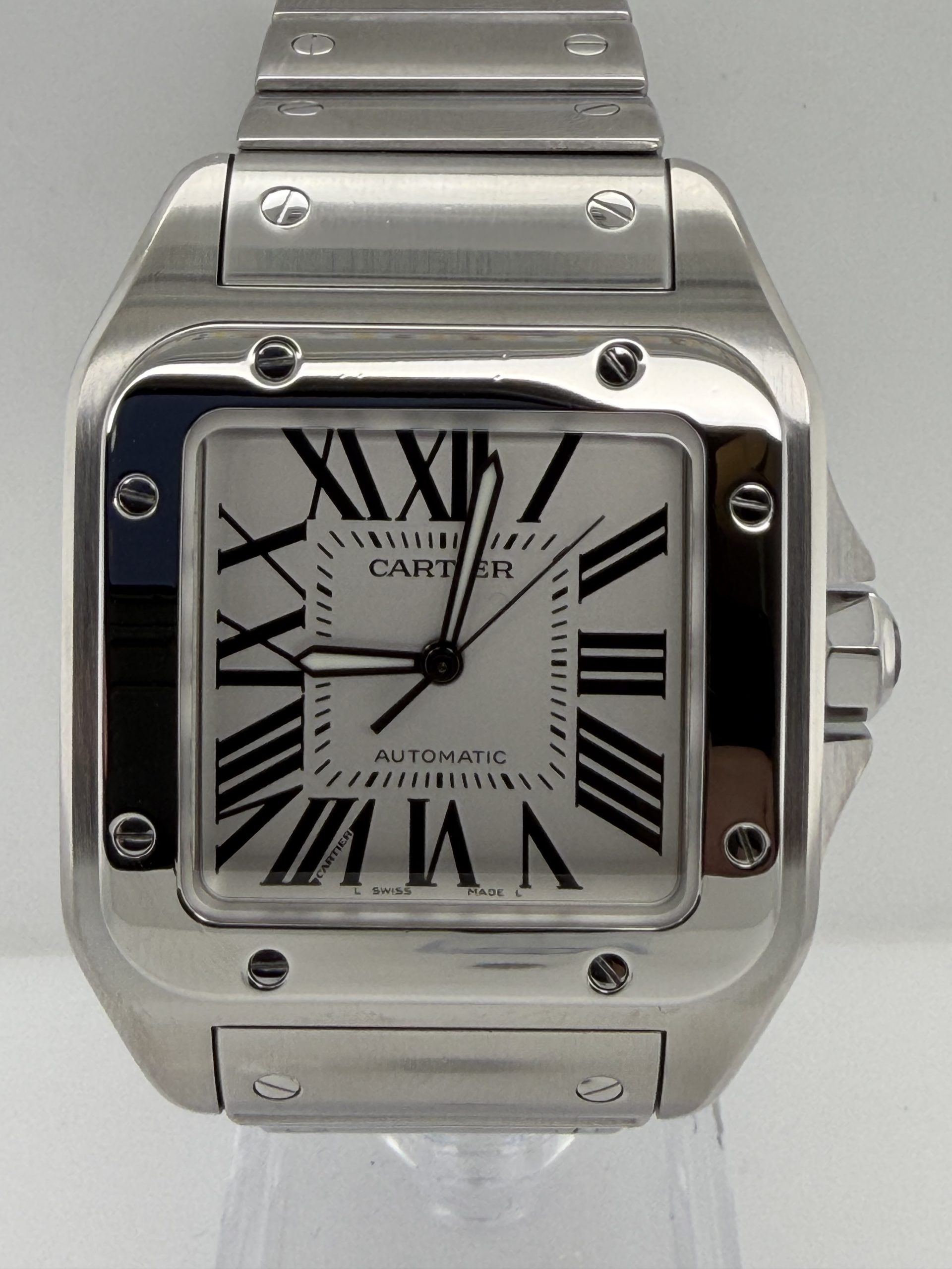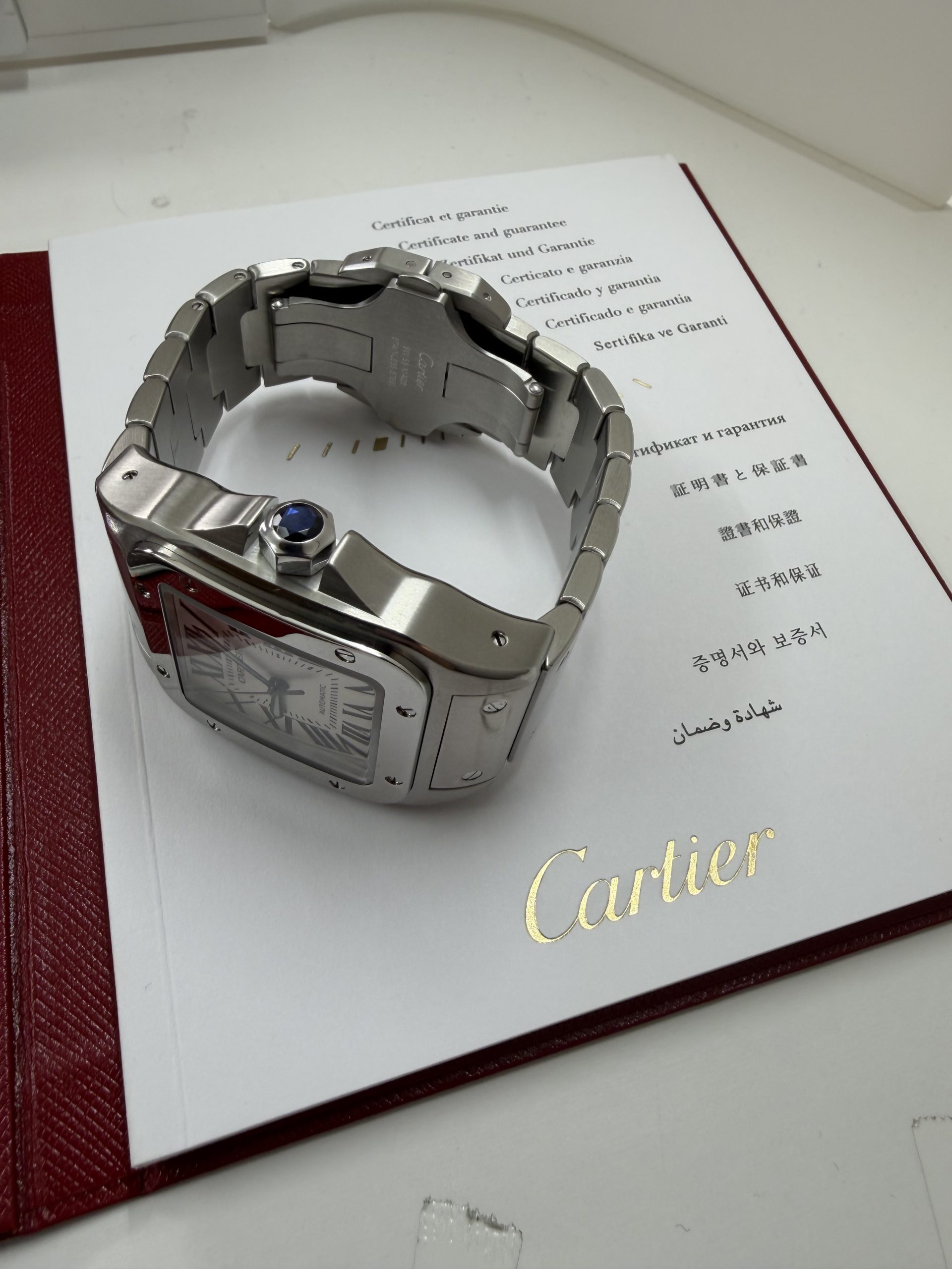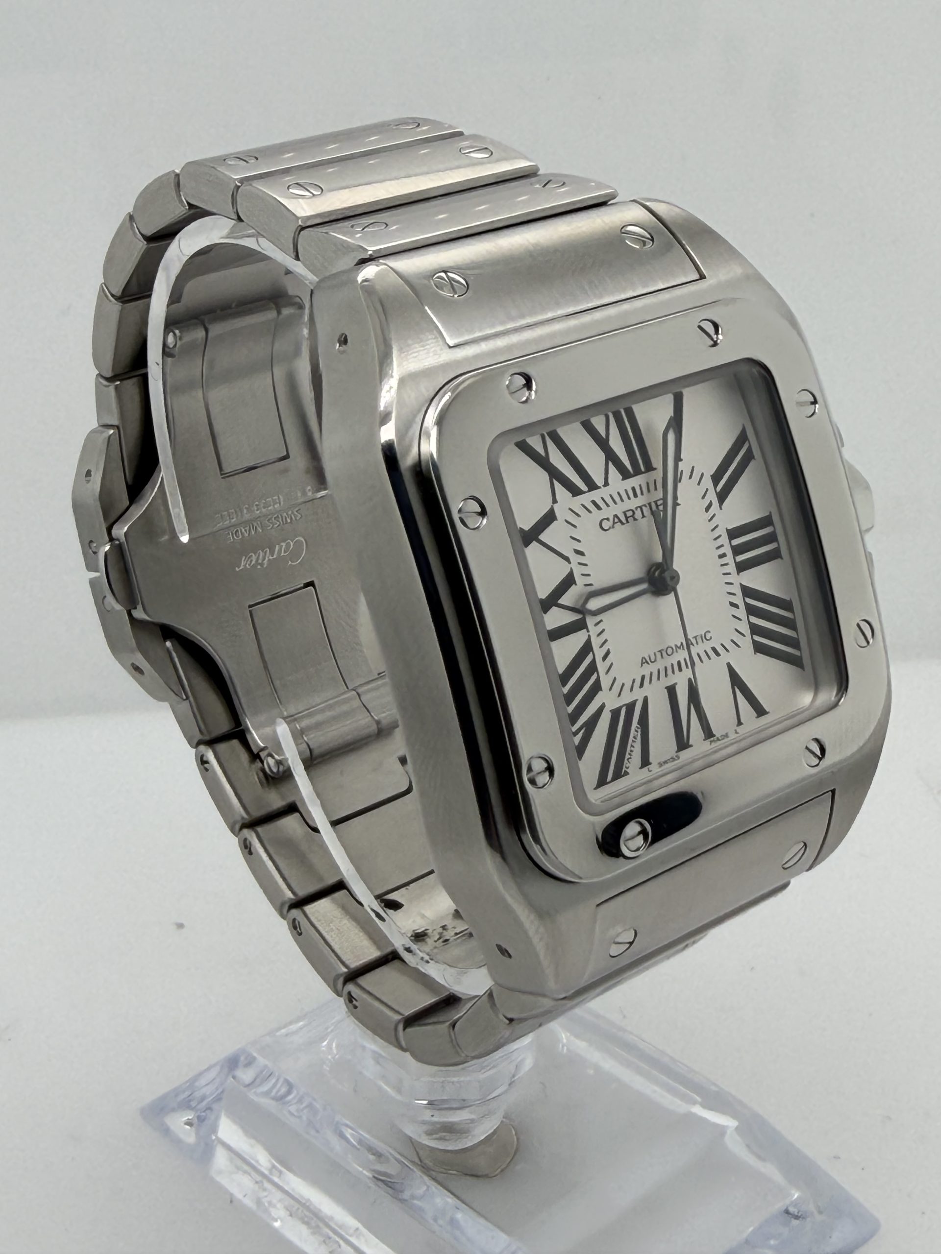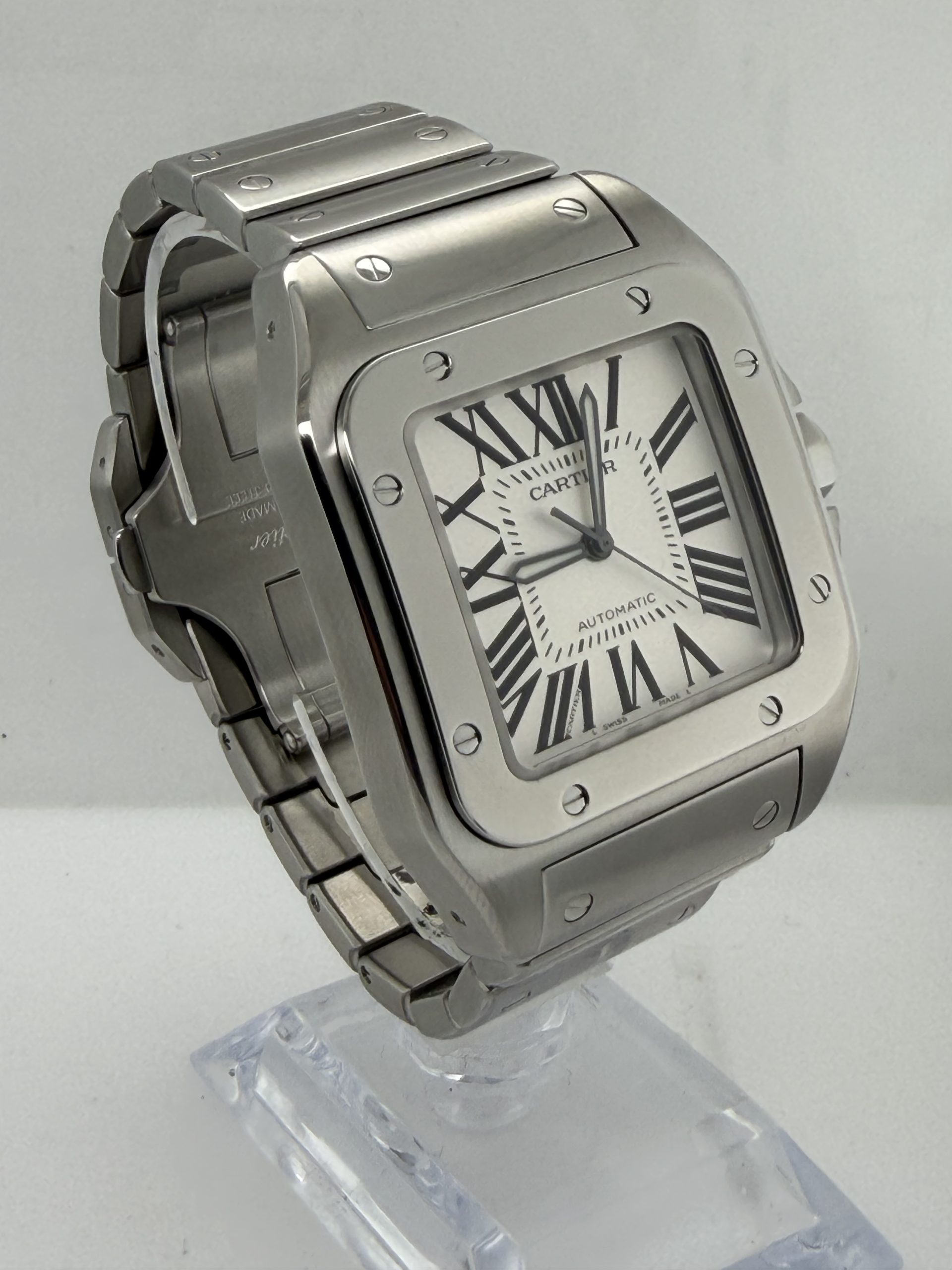 De Cartier Santos 100 met referentie W200737G heeft een roestvrijstalen kast van 38 x 51 mm en heeft een automatisch uurwerk kaliber 049 , zilveren wijzerplaat met klassieke Romeinse cijfers ,stalen schakelband met dubbele vouwsluiting met de iconische schroefdetails lopen door in de band. Komt met het certificaat (2008) en de doos .Deze Cartier is een sterke allround luxe keuze en is in zeer goede staat voor de prijs van €5.790