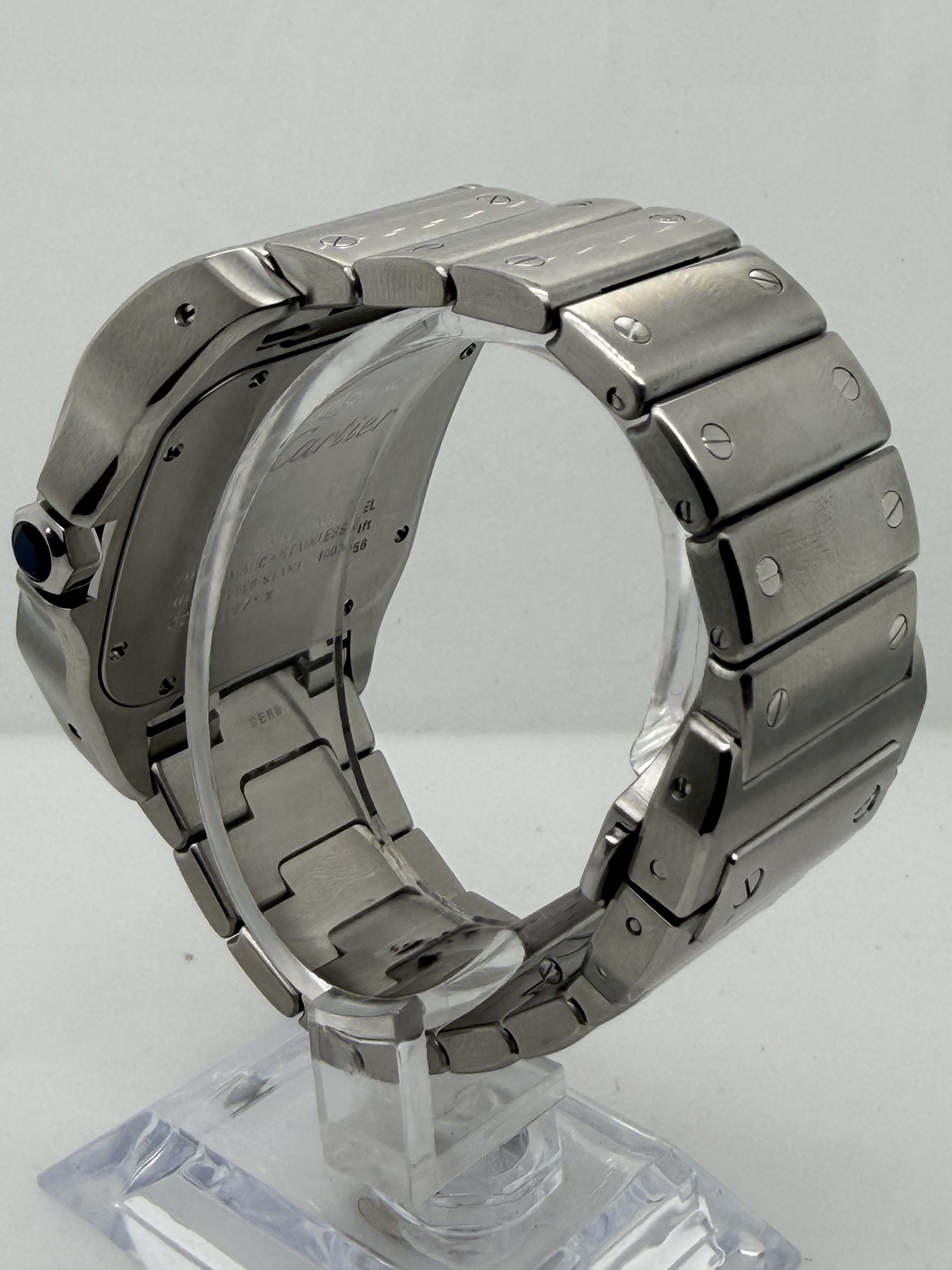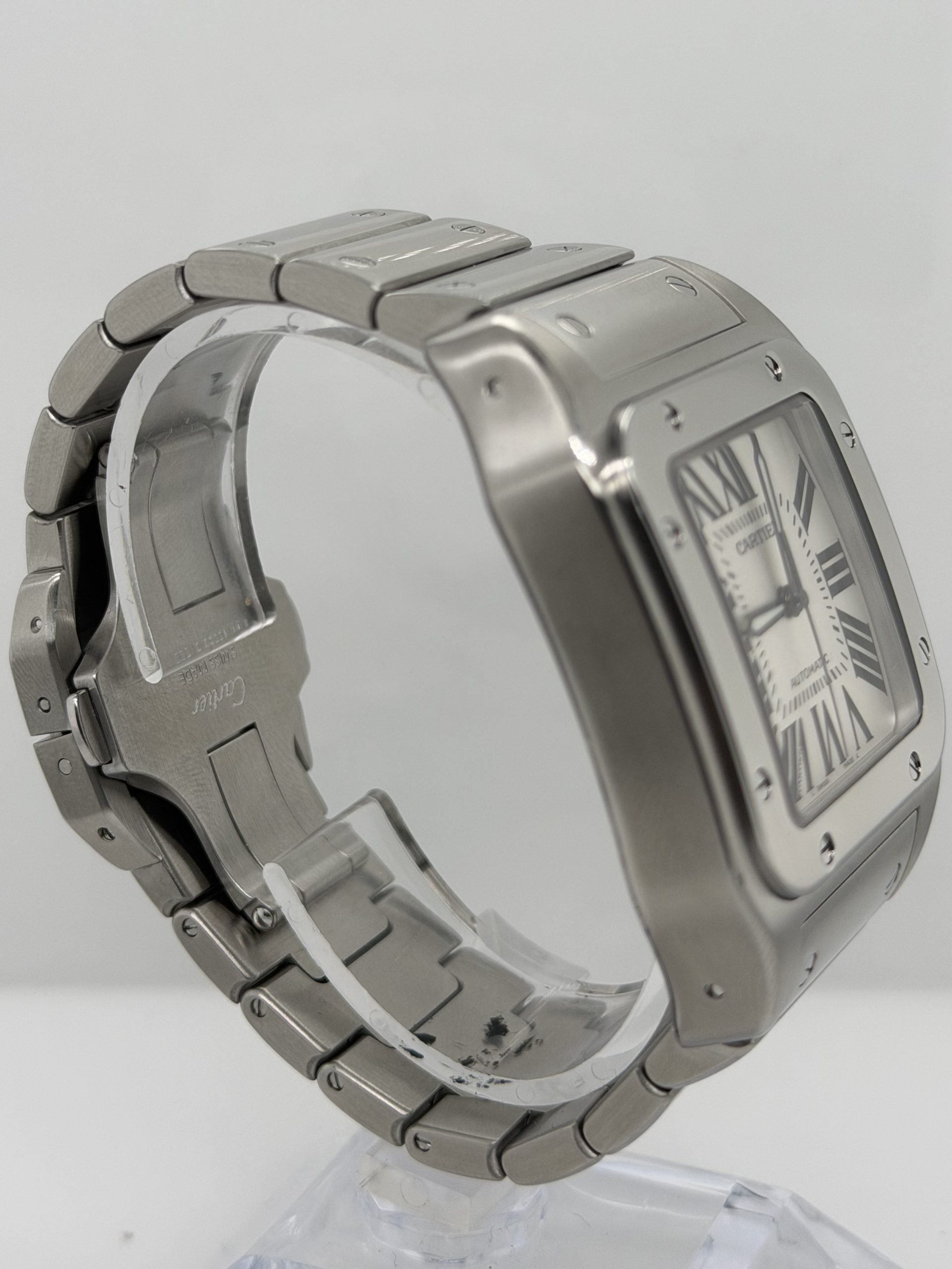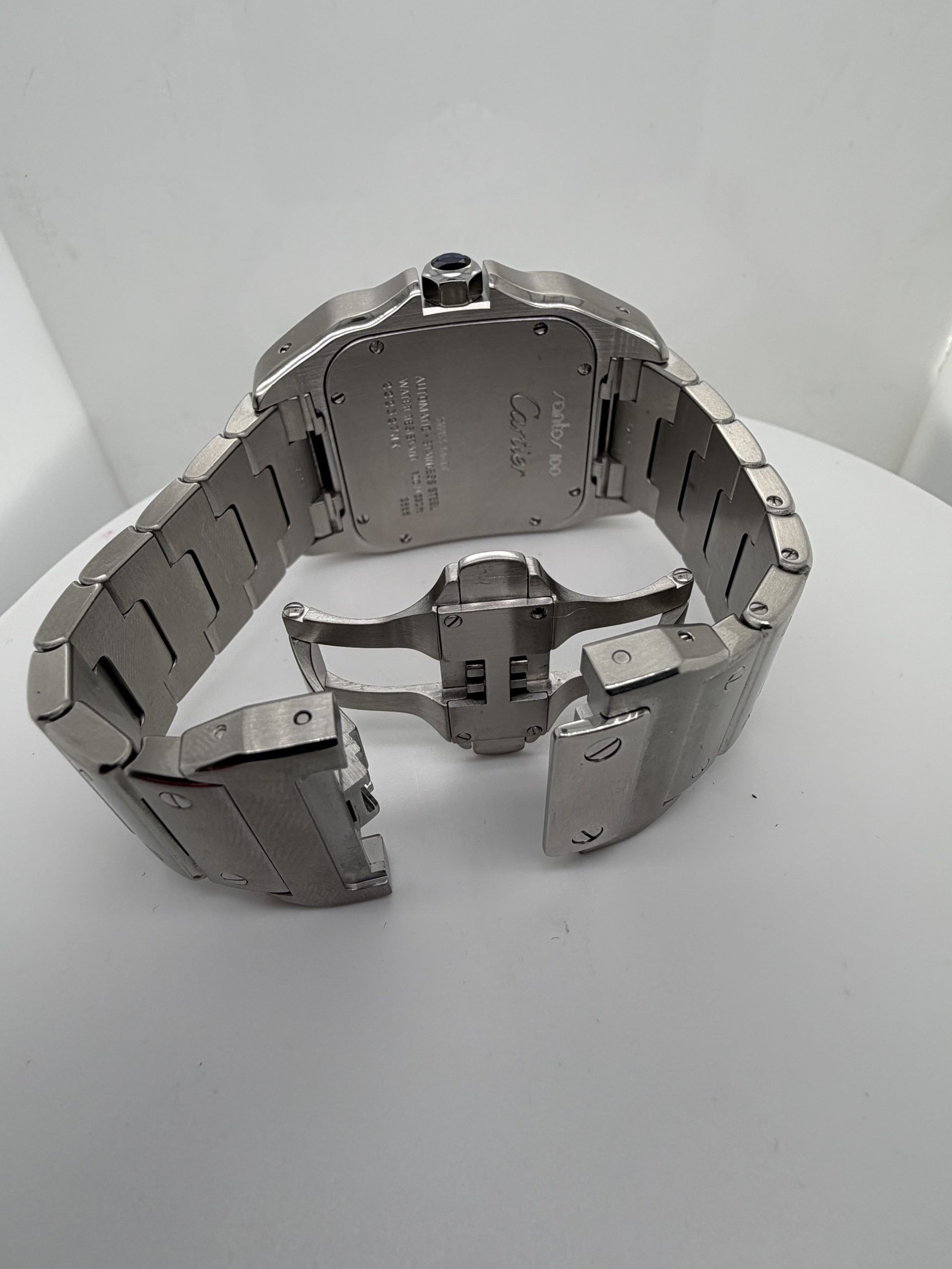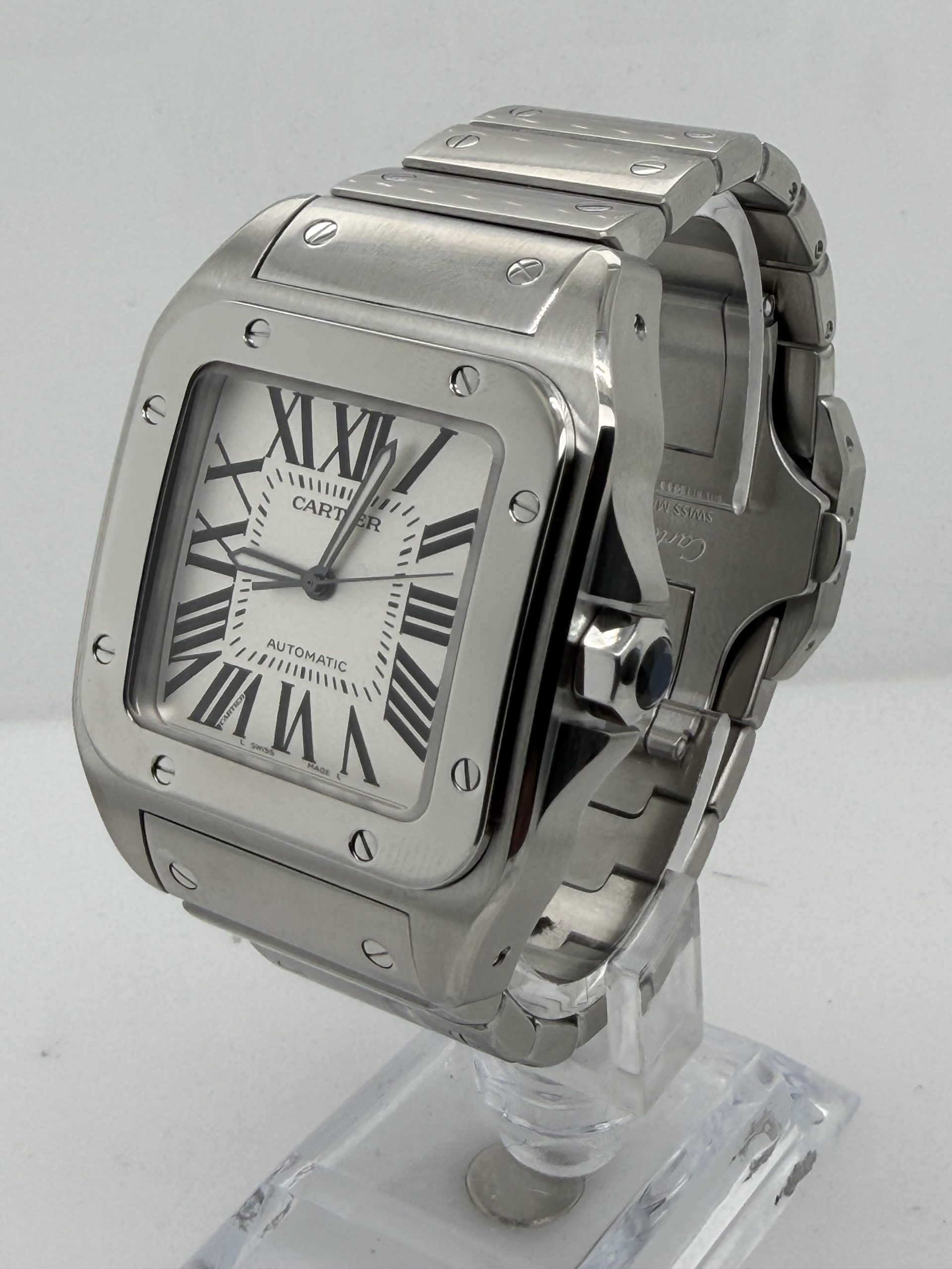 De Cartier Santos 100 met referentie W200737G heeft een roestvrijstalen kast van 38 x 51 mm en heeft een automatisch uurwerk kaliber 049 , zilveren wijzerplaat met klassieke Romeinse cijfers ,stalen schakelband met dubbele vouwsluiting met de iconische schroefdetails lopen door in de band. Komt met het certificaat (2008) en de doos .Deze Cartier is een sterke allround luxe keuze en is in zeer goede staat voor de prijs van €5.790