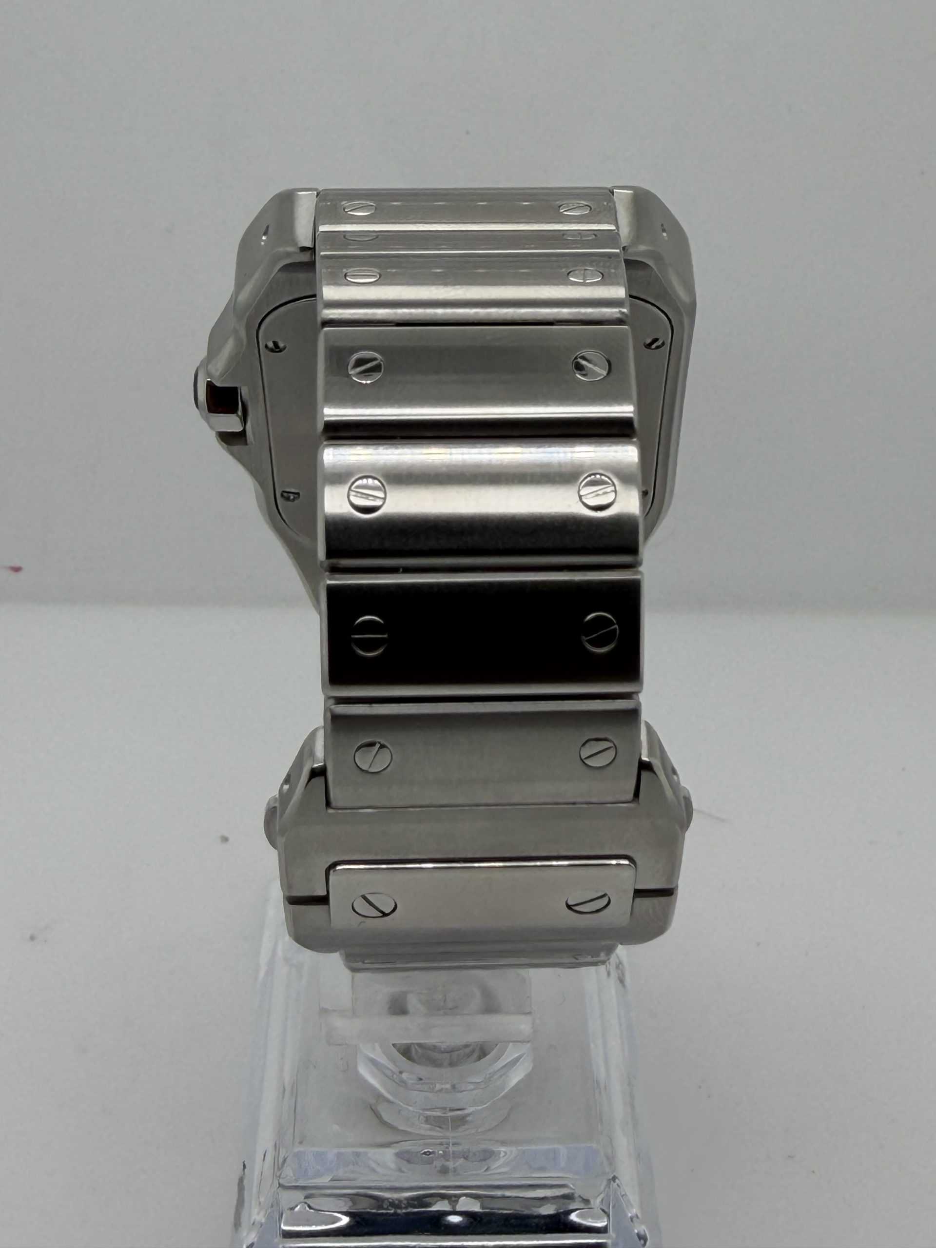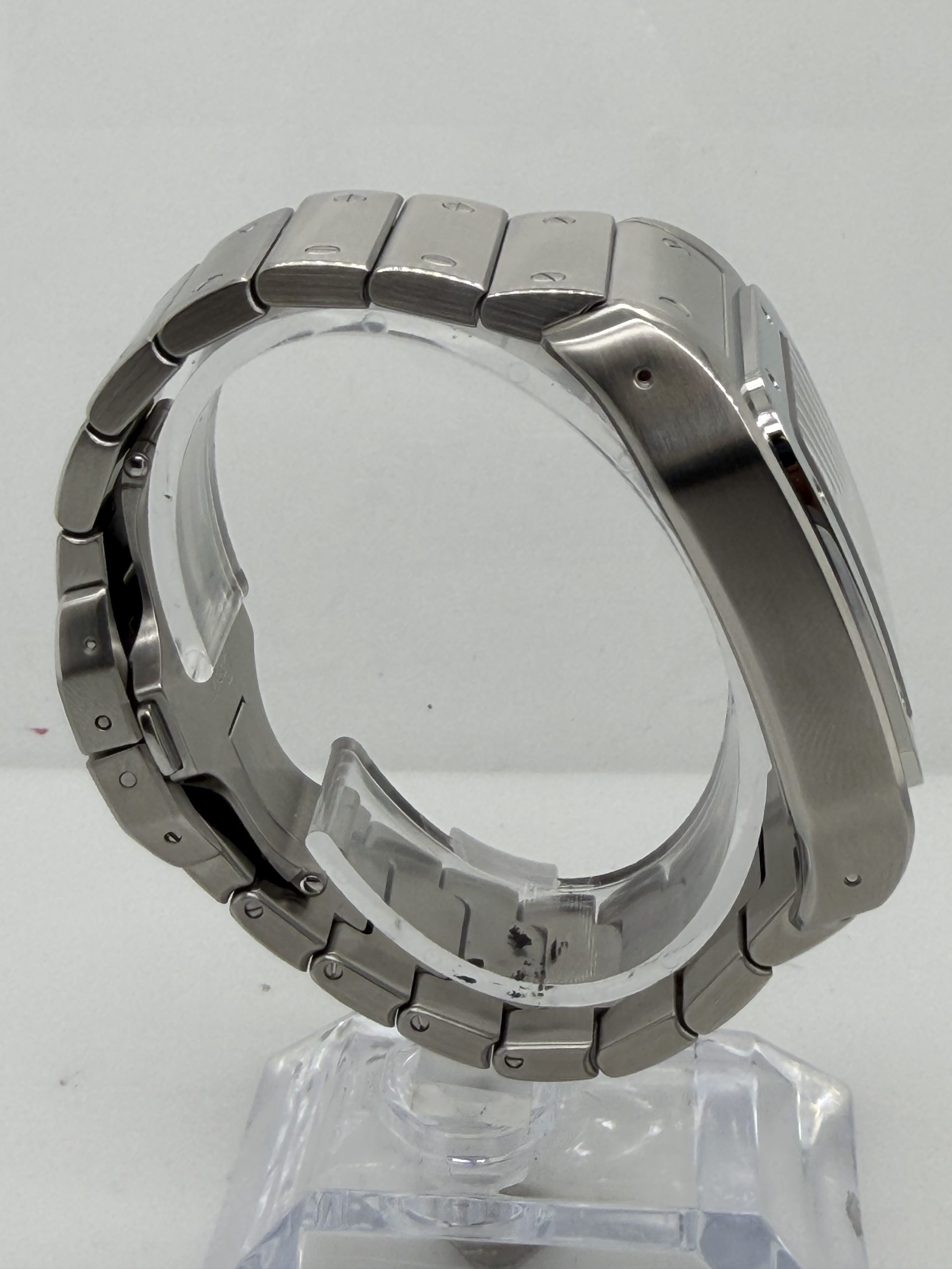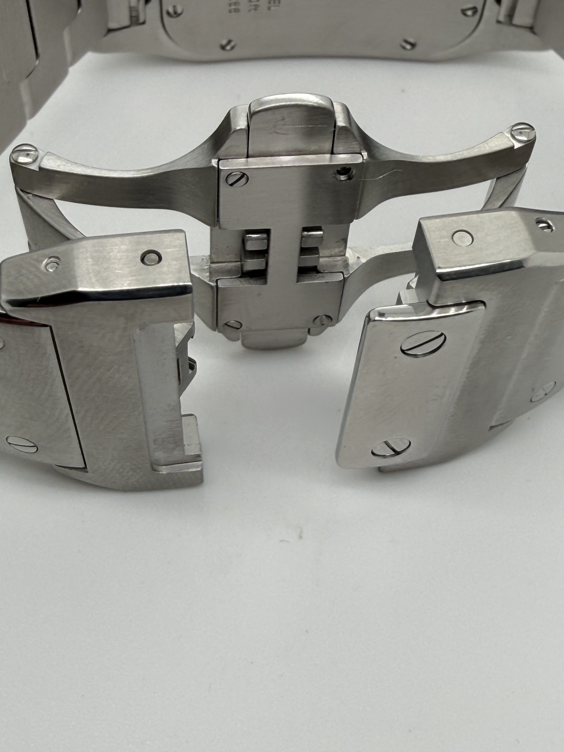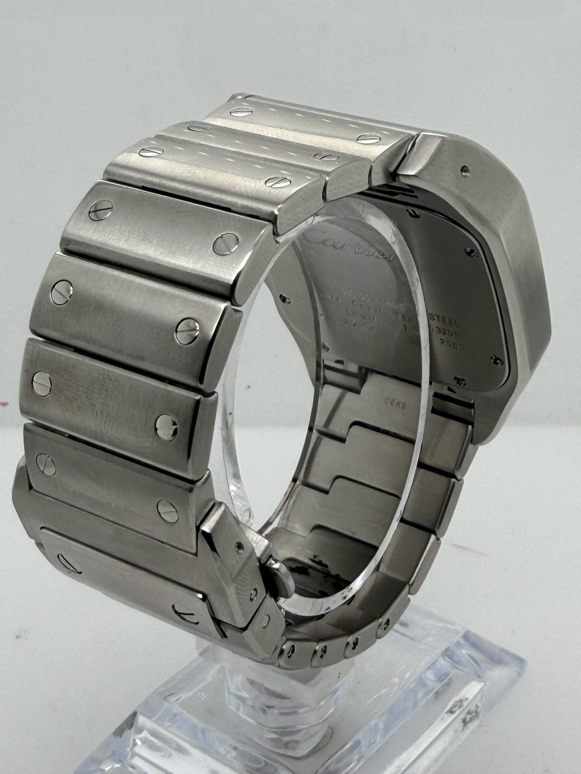 De Cartier Santos 100 met referentie W200737G heeft een roestvrijstalen kast van 38 x 51 mm en heeft een automatisch uurwerk kaliber 049 , zilveren wijzerplaat met klassieke Romeinse cijfers ,stalen schakelband met dubbele vouwsluiting met de iconische schroefdetails lopen door in de band. Komt met het certificaat (2008) en de doos .Deze Cartier is een sterke allround luxe keuze en is in zeer goede staat voor de prijs van €5.790
