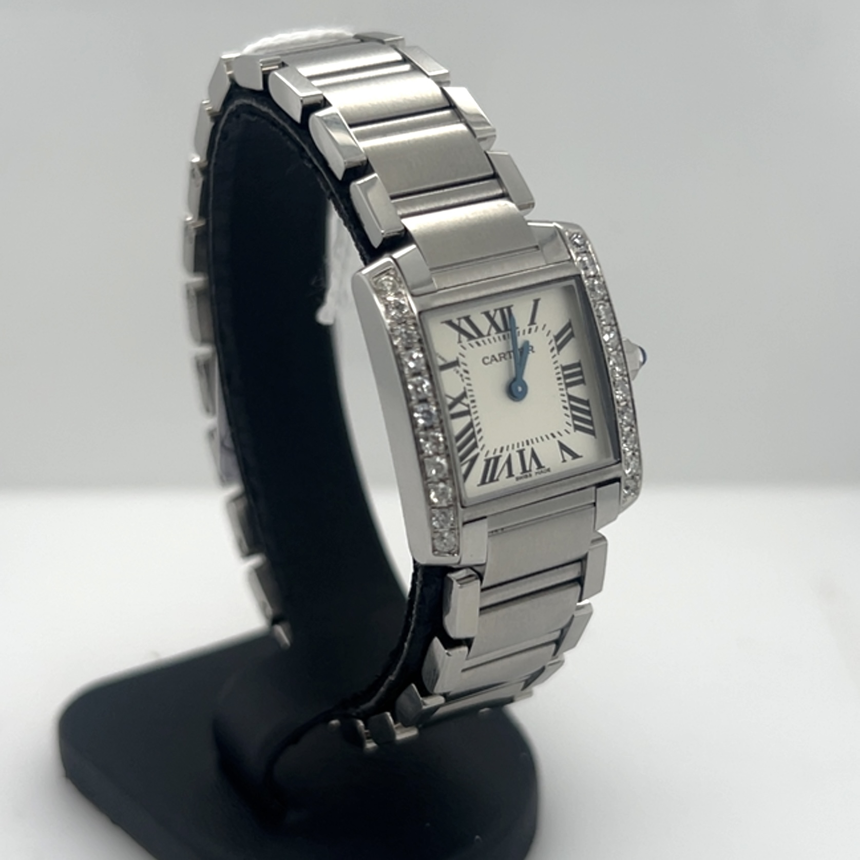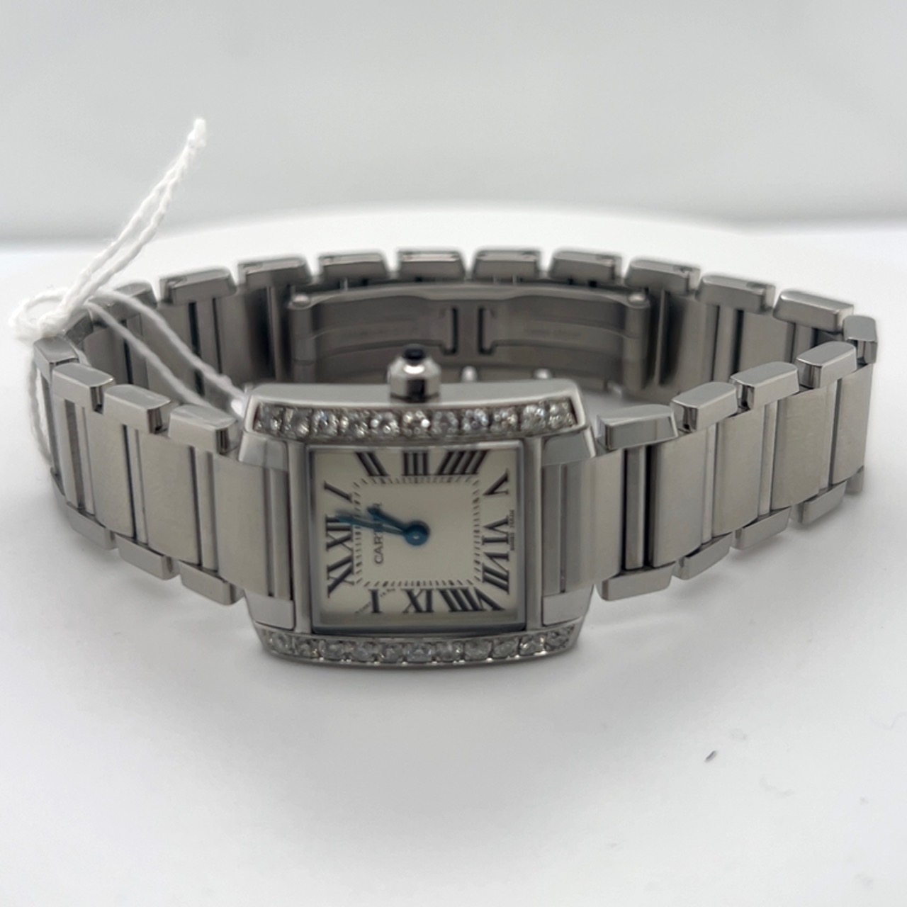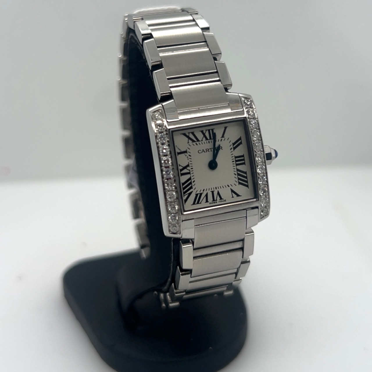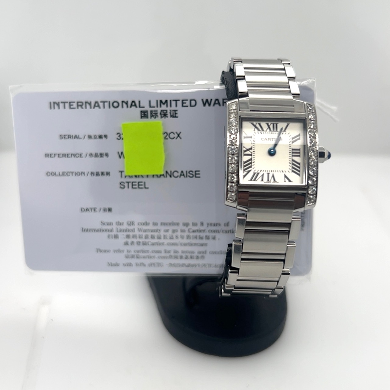 Cartier Tank Française met referentie W4TA0008 heeft een roestvrij stalen kast 25,2 x 20,3 mm met een dikte van 6,1 mm , de lunette heeft 24 diamanten ~0,49 karaat , zilver wijzerplaat met zwarte romeinse cijfers , blauwe wijzers ‘sword’ vorm , saffierglas, pull/push kroon met een blauw saffier, roestvrij stalen band met een vouwsluiting , quartz uurwerk .Dit horloge is in absolute nieuwstaat en komt met het certificaat voor de prijs van 5.450 EURO