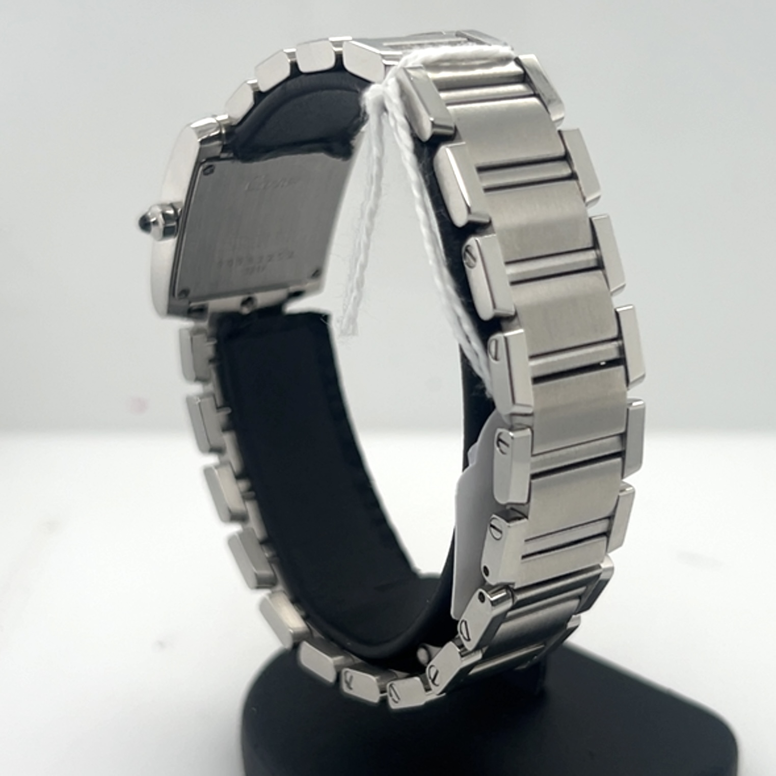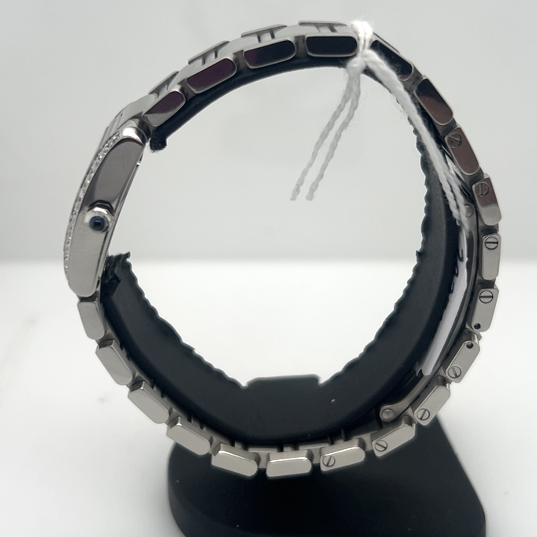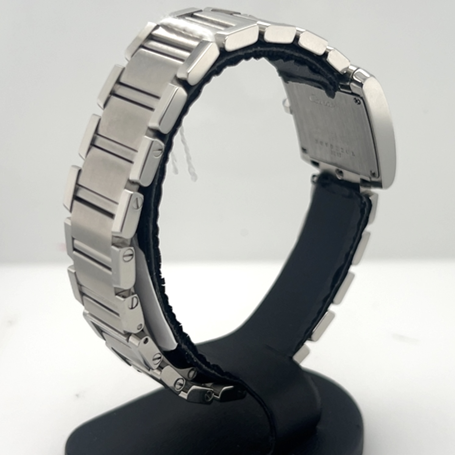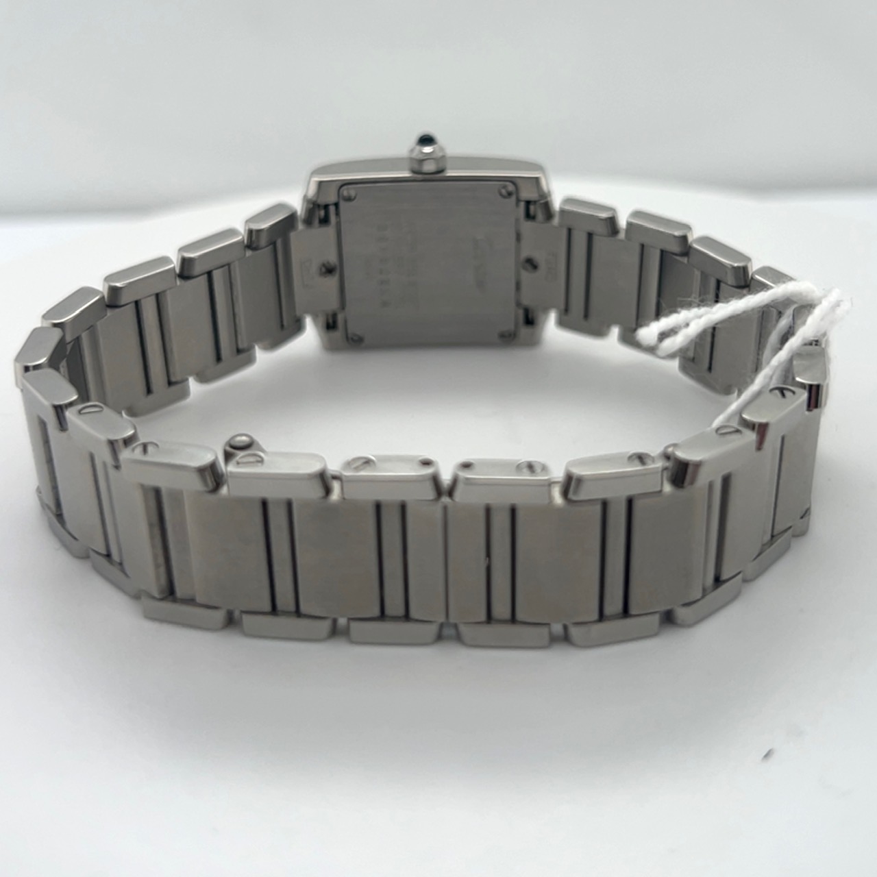 Cartier Tank Française met referentie W4TA0008 heeft een roestvrij stalen kast 25,2 x 20,3 mm met een dikte van 6,1 mm , de lunette heeft 24 diamanten ~0,49 karaat , zilver wijzerplaat met zwarte romeinse cijfers , blauwe wijzers ‘sword’ vorm , saffierglas, pull/push kroon met een blauw saffier, roestvrij stalen band met een vouwsluiting , quartz uurwerk .Dit horloge is in absolute nieuwstaat en komt met het certificaat voor de prijs van 5.450 EURO