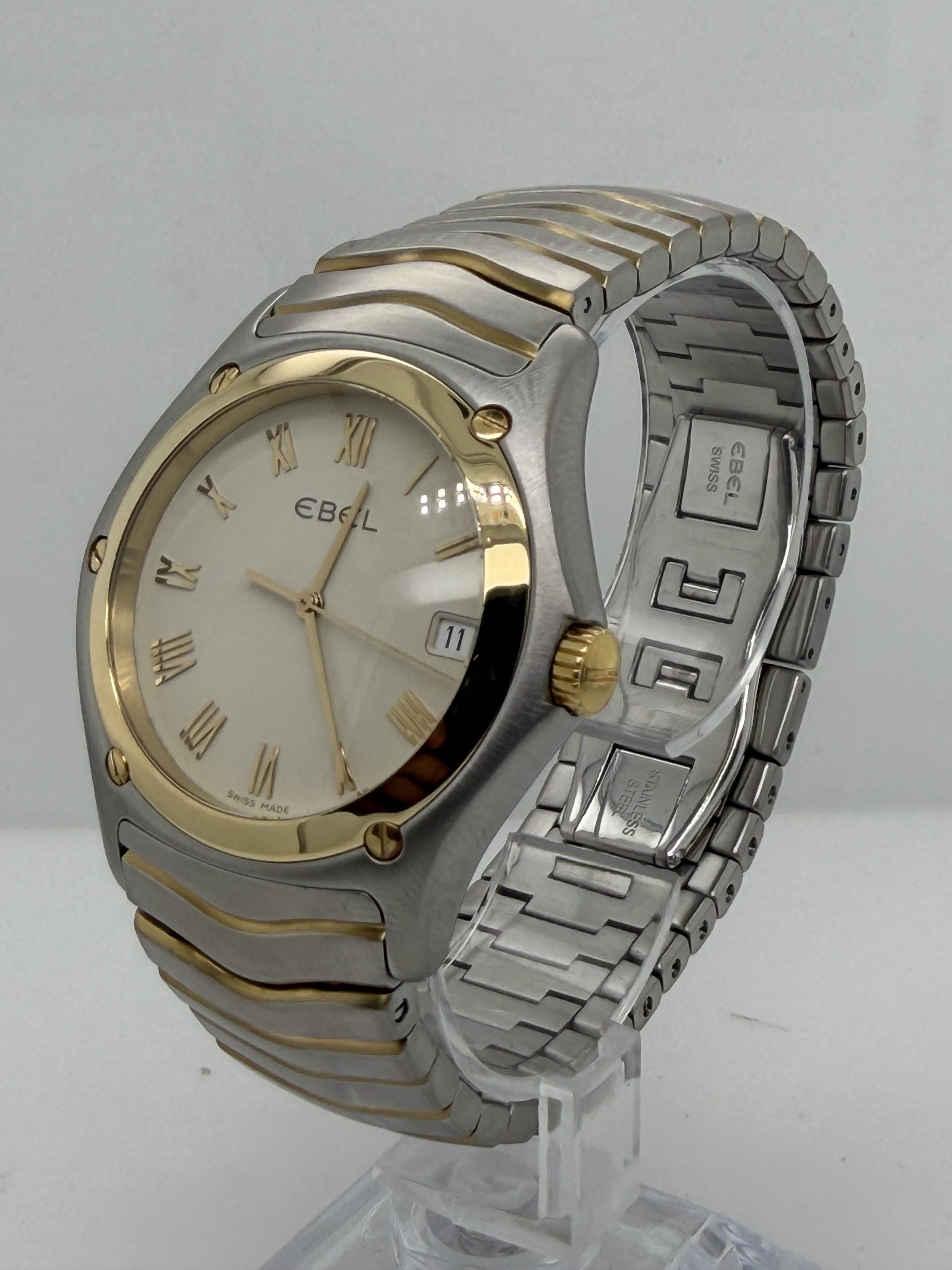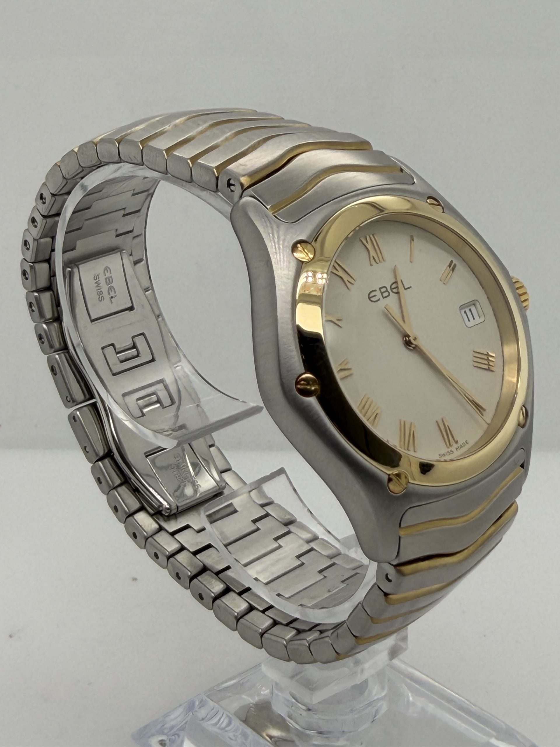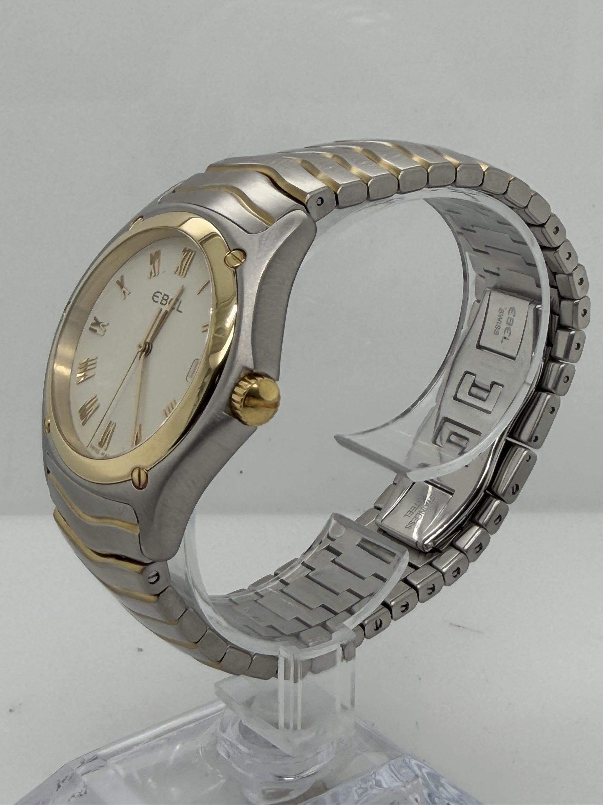 De Ebel Classic Wave met referentie E1187F41 is een elegant sportief dress horloge met het typische Ebel design een geïntegreerde ‘wave’ band in combinatie van roestvrij stalen en 18k geelgoud .De kast is 38-40 mm en heeft een Quartz uurwerk , saffierglas , champagne kleurige wijzerplaat met Romeinse cijfers en datum aanduiding ,dubbele verborgen vouwsluiting ,tijdloos ontwerp komt met onze winkel factuur voor de prijs van €2265