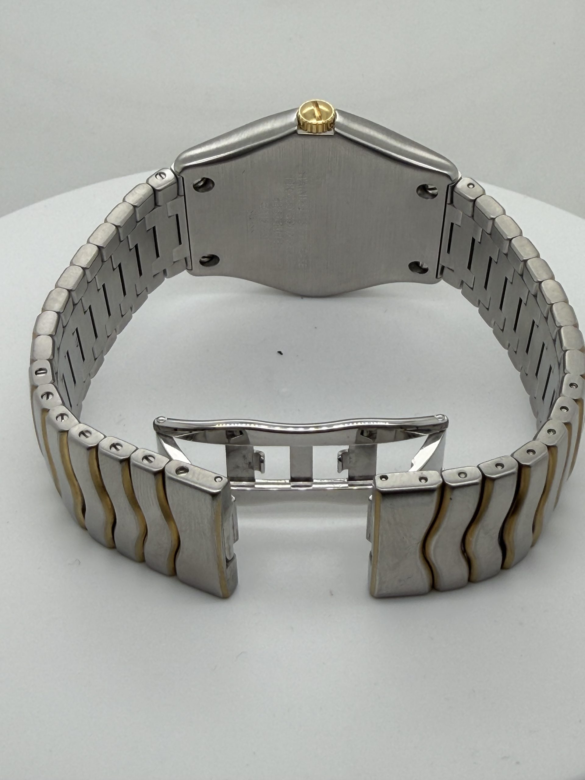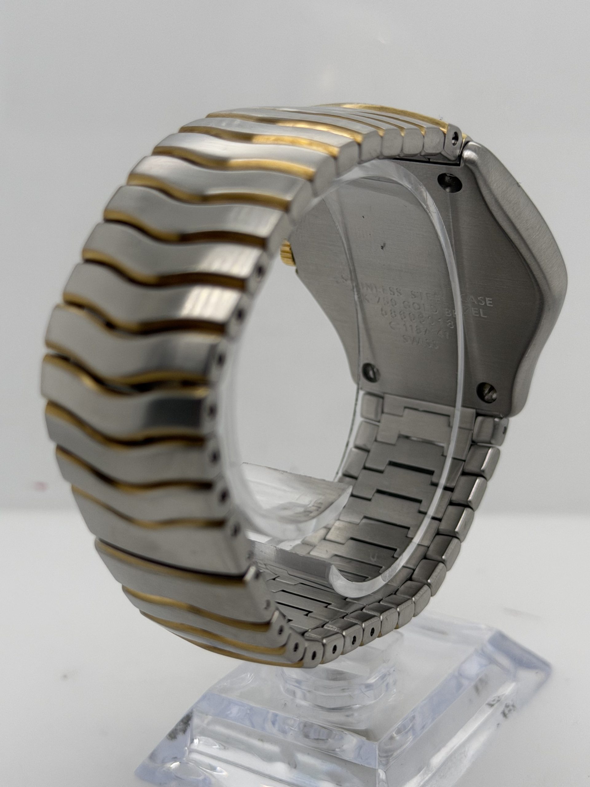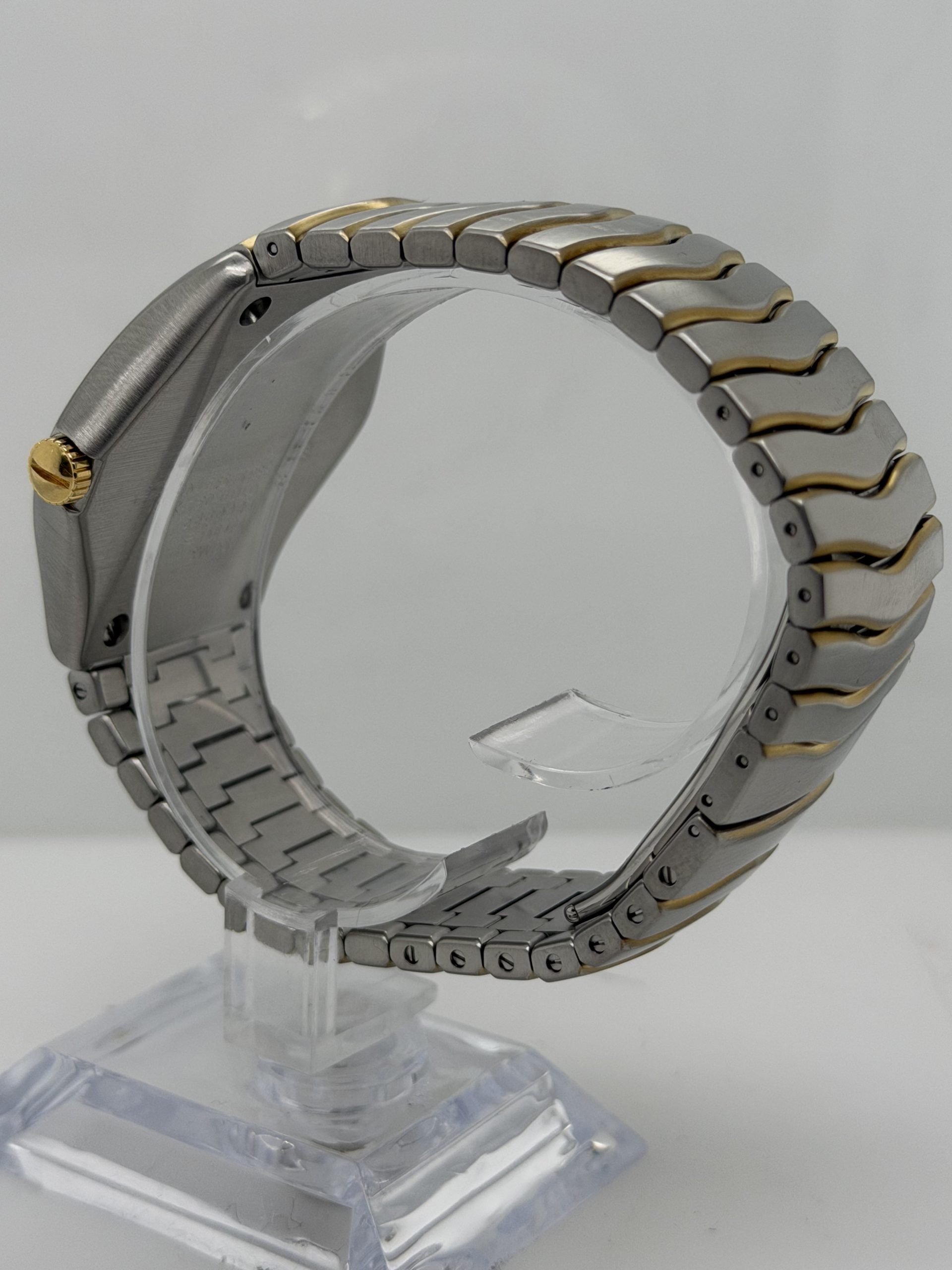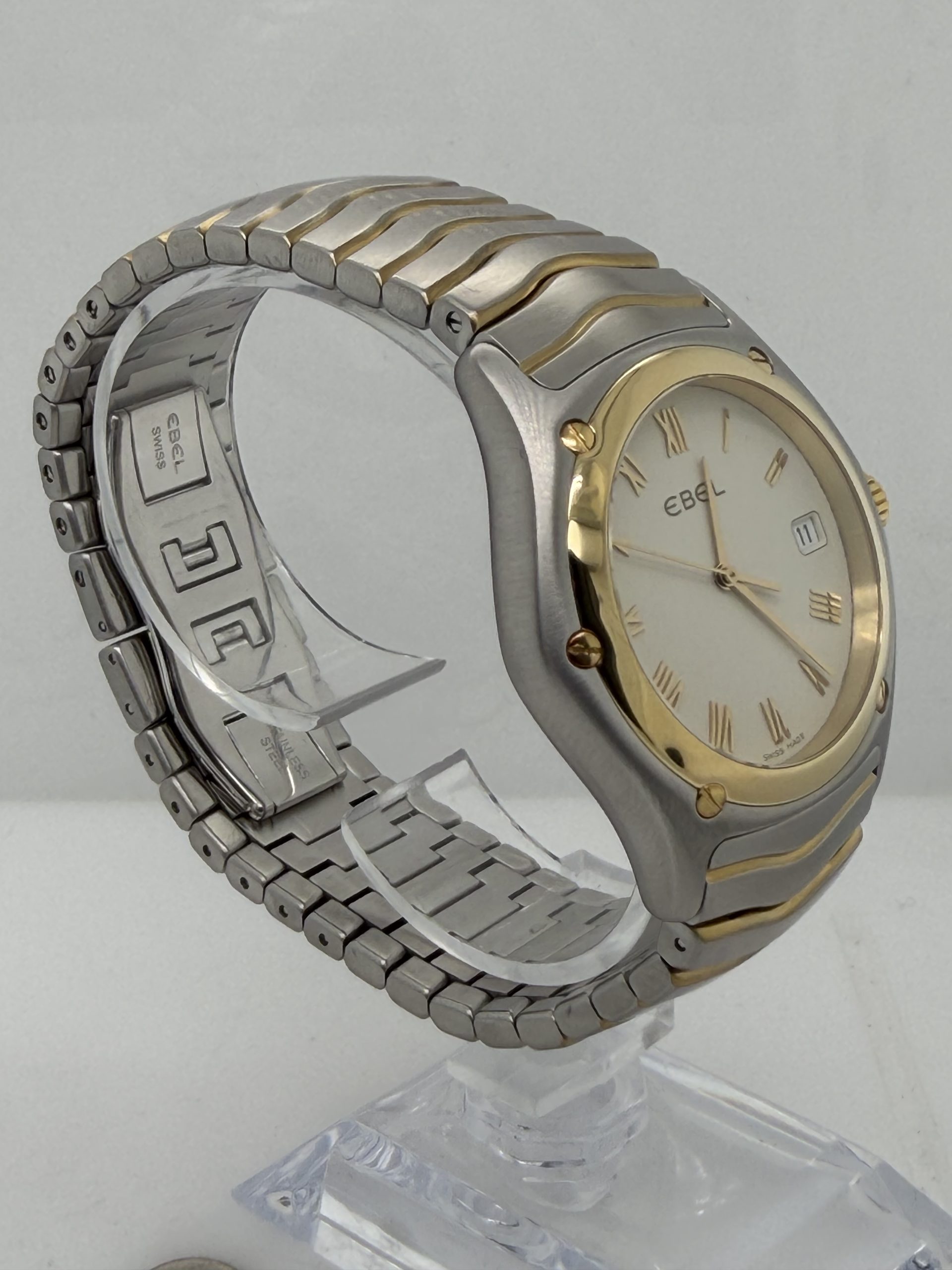 De Ebel Classic Wave met referentie E1187F41 is een elegant sportief dress horloge met het typische Ebel design een geïntegreerde ‘wave’ band in combinatie van roestvrij stalen en 18k geelgoud .De kast is 38-40 mm en heeft een Quartz uurwerk , saffierglas , champagne kleurige wijzerplaat met Romeinse cijfers en datum aanduiding ,dubbele verborgen vouwsluiting ,tijdloos ontwerp komt met onze winkel factuur voor de prijs van €2265