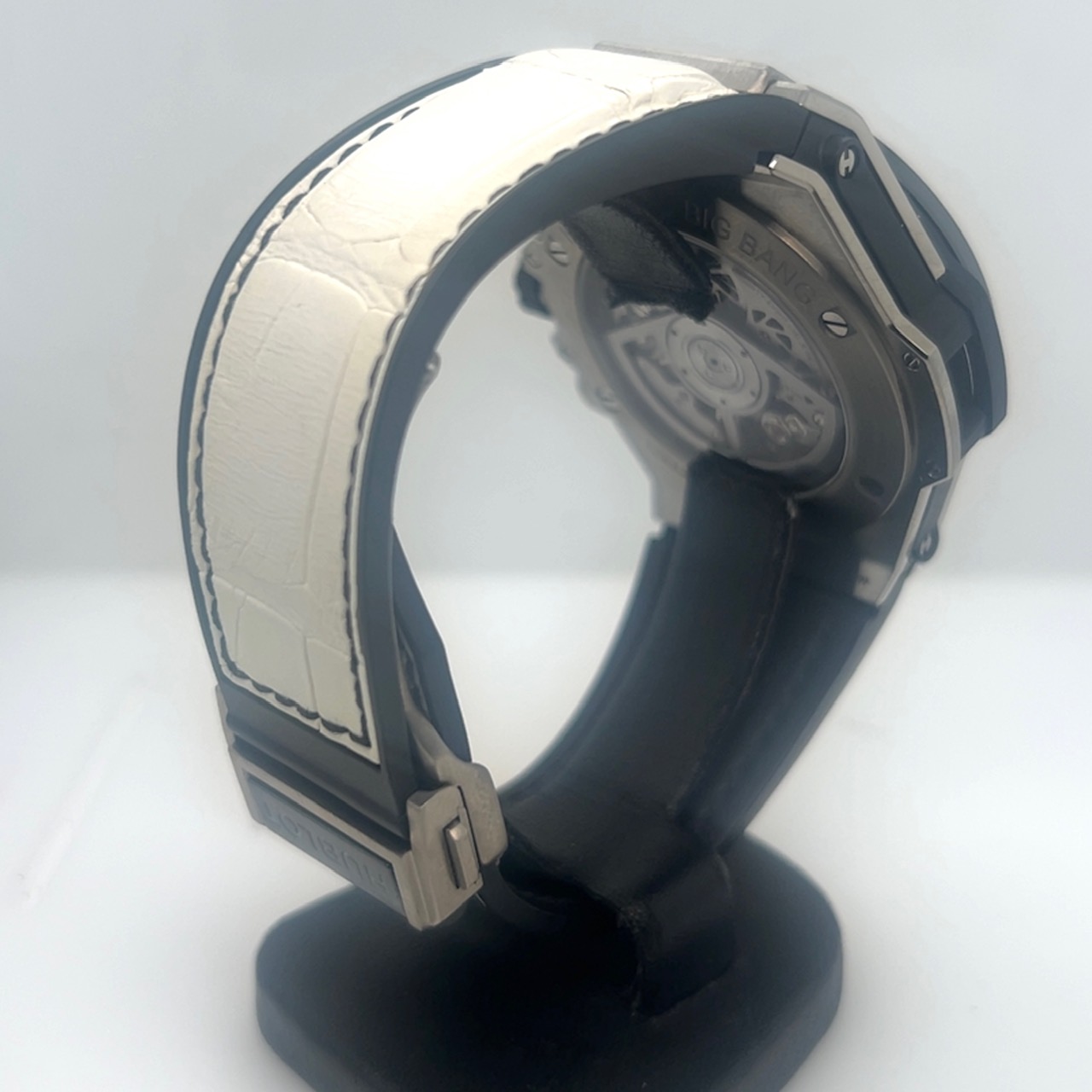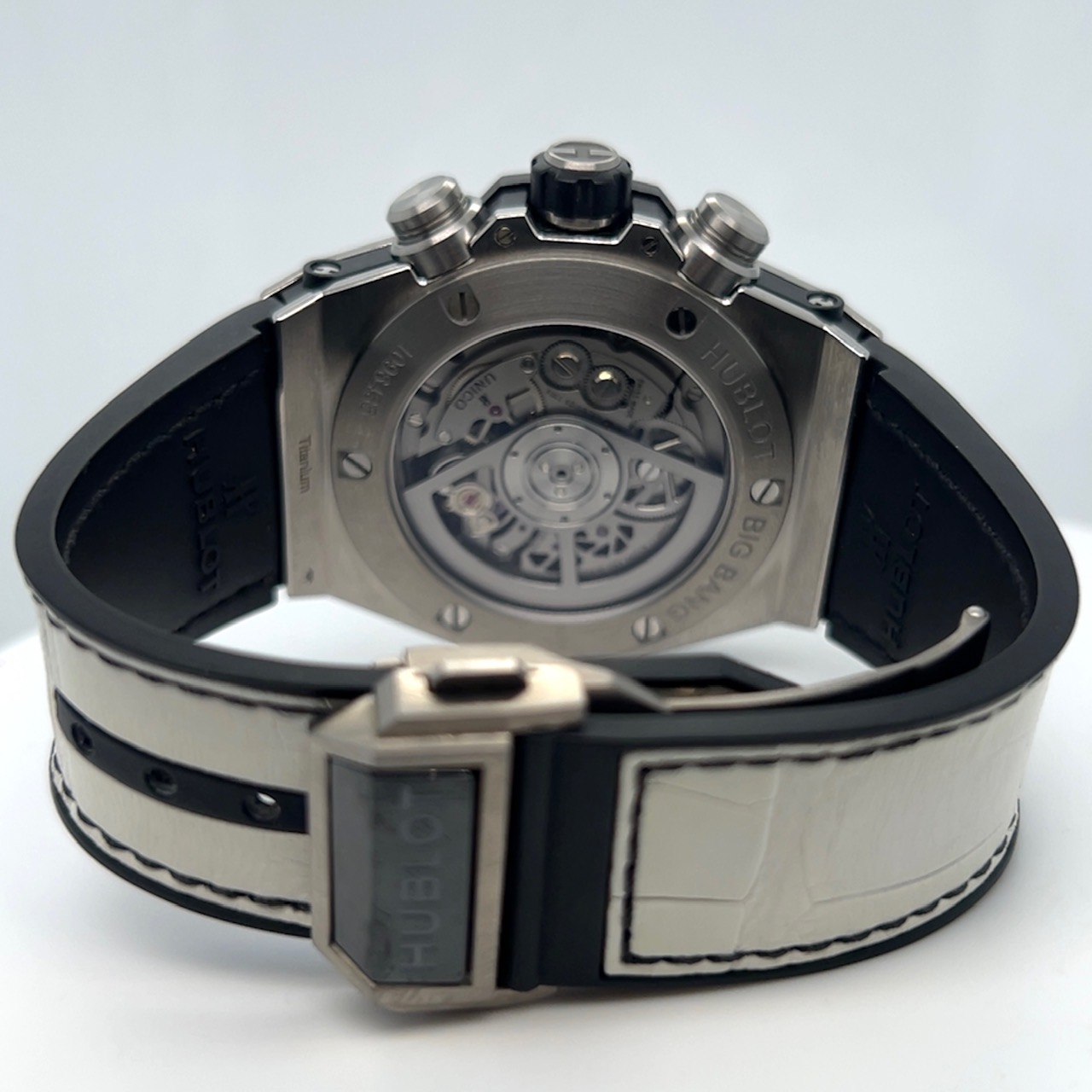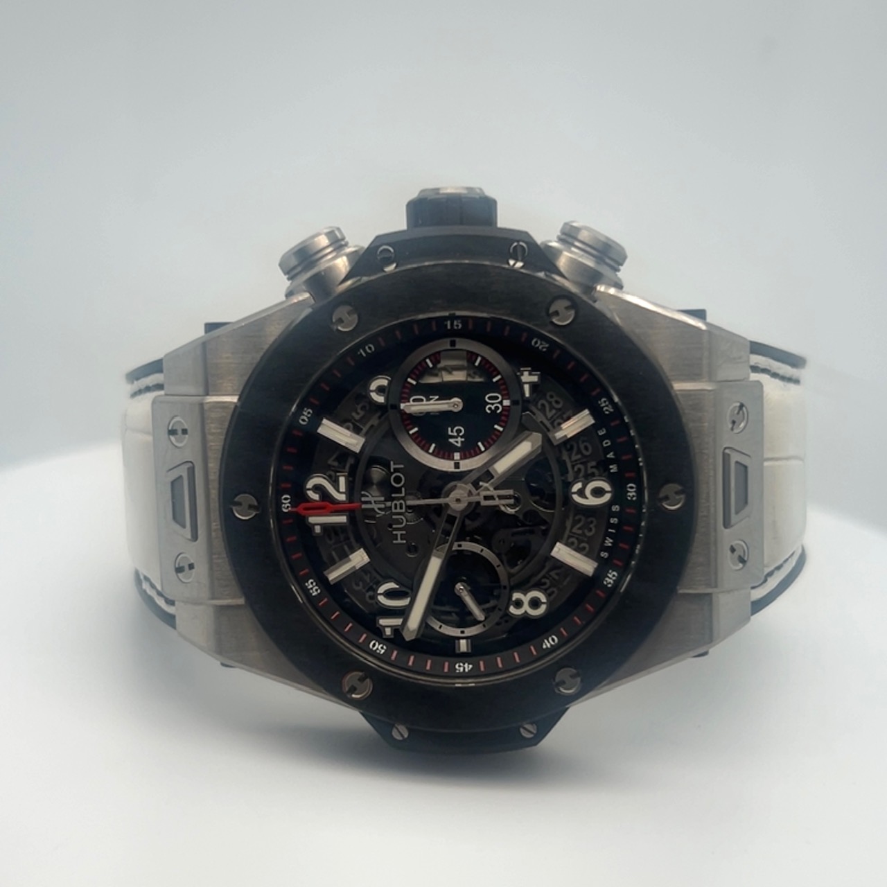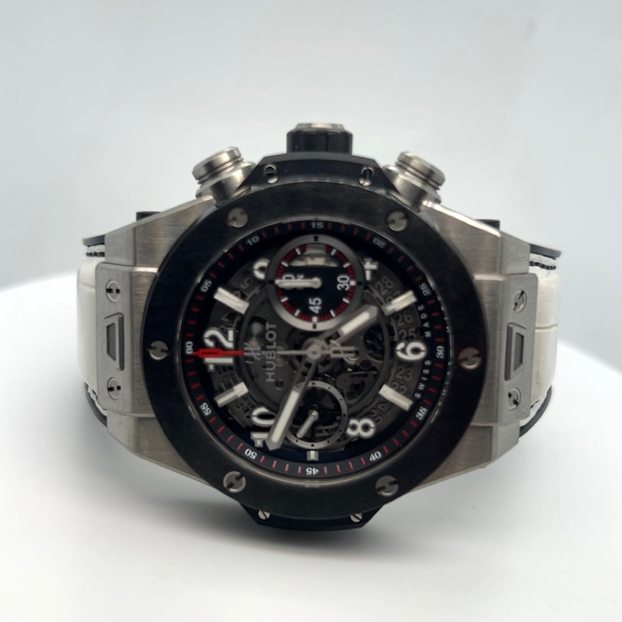 De Big Bang Unico HUBLOT met referentie 411.NM.1170.RX (BIG BANG UNICO TITANIUM CERAMIC ) de kast Titanium gecombineerd met keramiek heeft een diameter van 45 mm en 16 mm dik ,heeft een zwart keramische vaste bezel ,automatisch chronograaf uurwerk HUB 1242 kaliber met een gangreserve van circa 72 uur , wijzerplaat geskeletteerd (skeleton ) waardoor je het uurwerk ziet ,zilver getinte wijzers/indexen met luminescente coating , afwisselend arabische cijfers en streepjes markering , witte krokoband met zwarte rubberen band met structuur (structured lined rubber strap ) , deployant buckle in titanium ,in zeer goede conditie komt met het Hublot certificaat 2016 met garantie voor de prijs van 8.950 euro