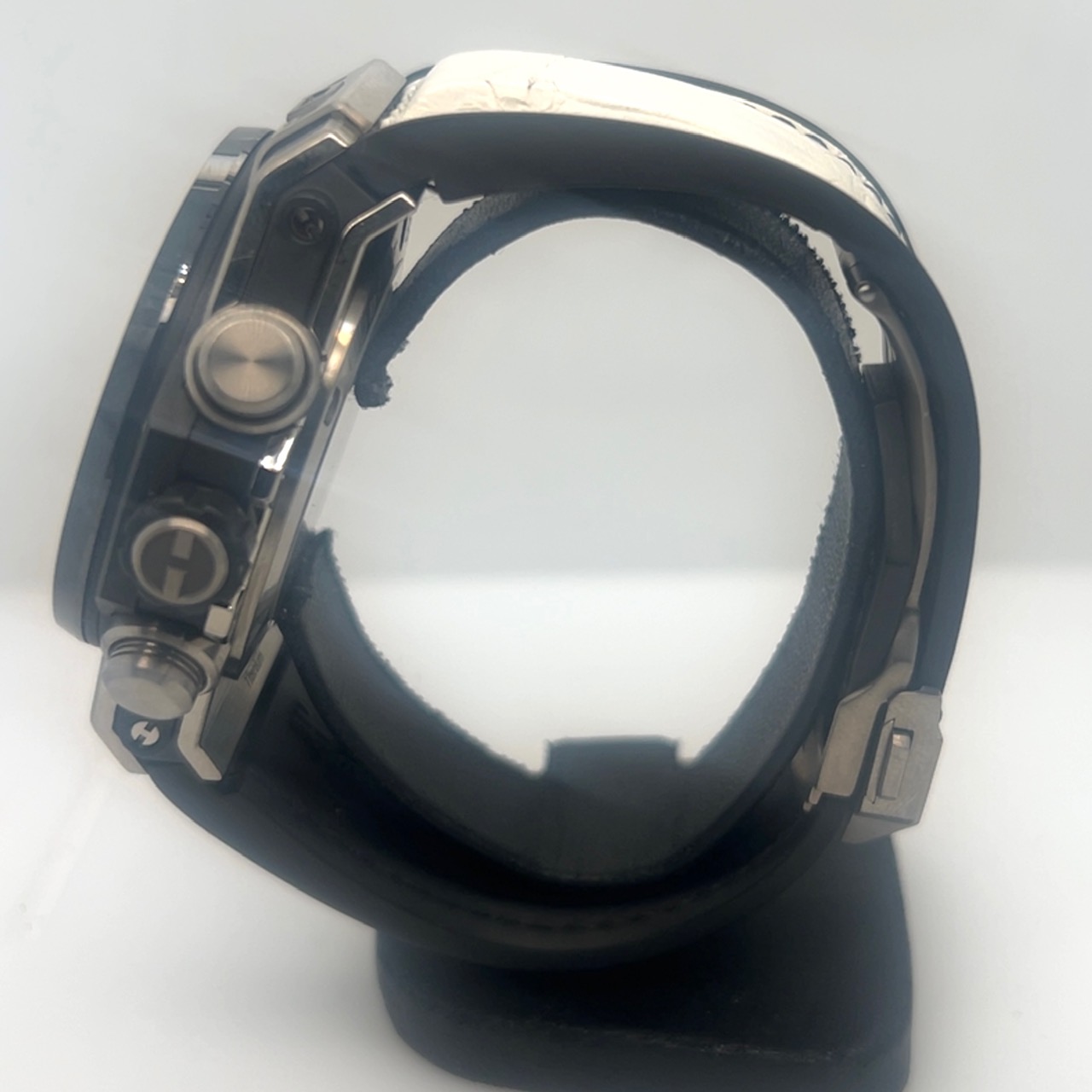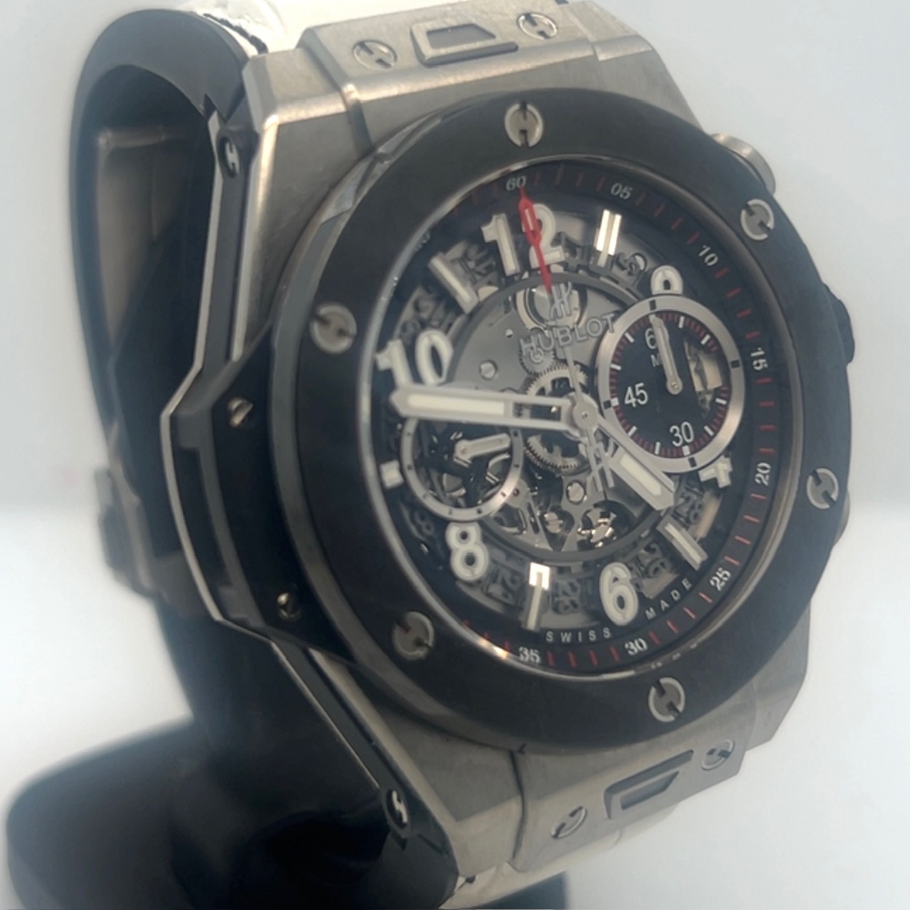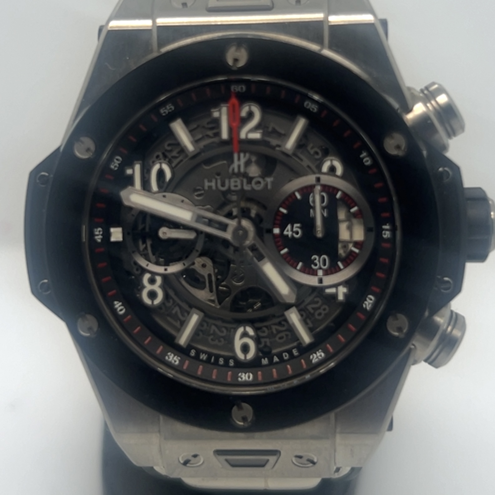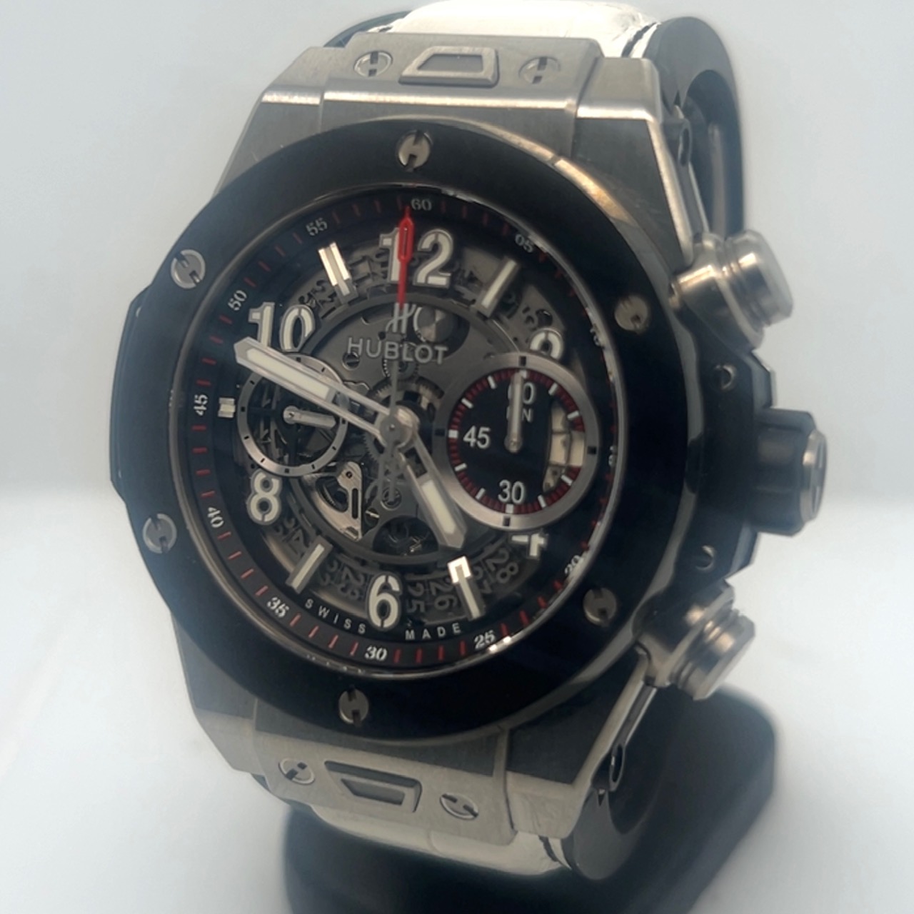 De Big Bang Unico HUBLOT met referentie 411.NM.1170.RX (BIG BANG UNICO TITANIUM CERAMIC ) de kast Titanium gecombineerd met keramiek heeft een diameter van 45 mm en 16 mm dik ,heeft een zwart keramische vaste bezel ,automatisch chronograaf uurwerk HUB 1242 kaliber met een gangreserve van circa 72 uur , wijzerplaat geskeletteerd (skeleton ) waardoor je het uurwerk ziet ,zilver getinte wijzers/indexen met luminescente coating , afwisselend arabische cijfers en streepjes markering , witte krokoband met zwarte rubberen band met structuur (structured lined rubber strap ) , deployant buckle in titanium ,in zeer goede conditie komt met het Hublot certificaat 2016 met garantie voor de prijs van 8.950 euro