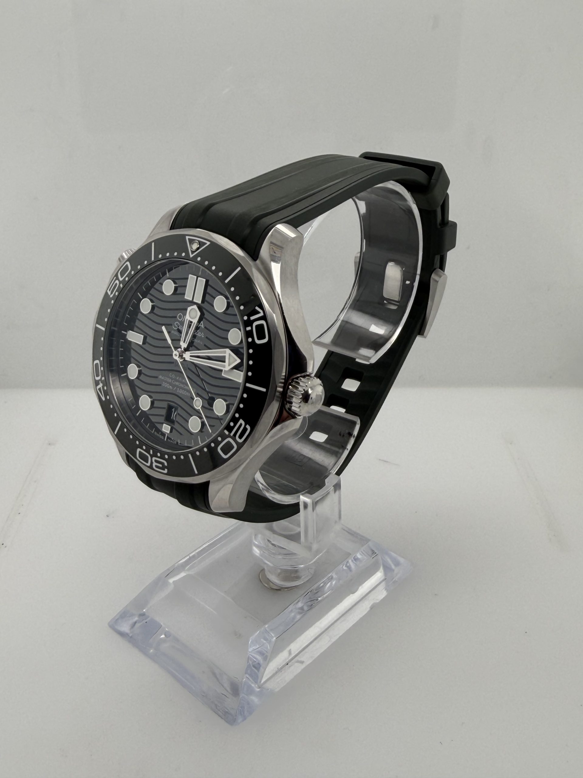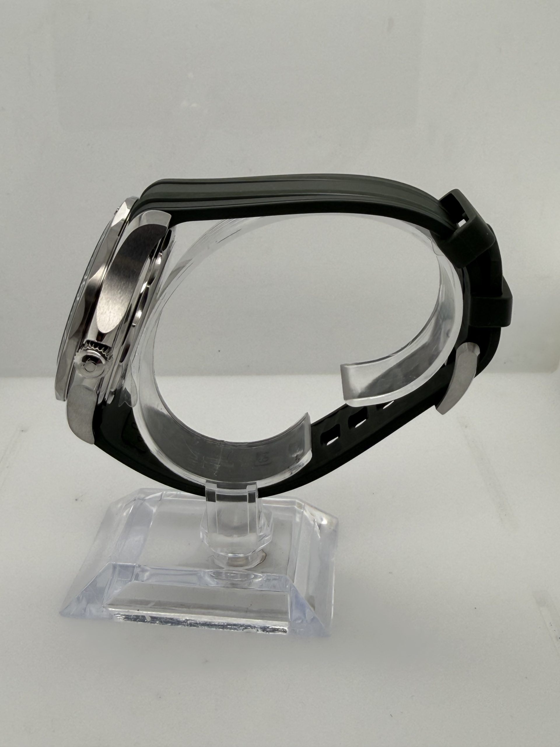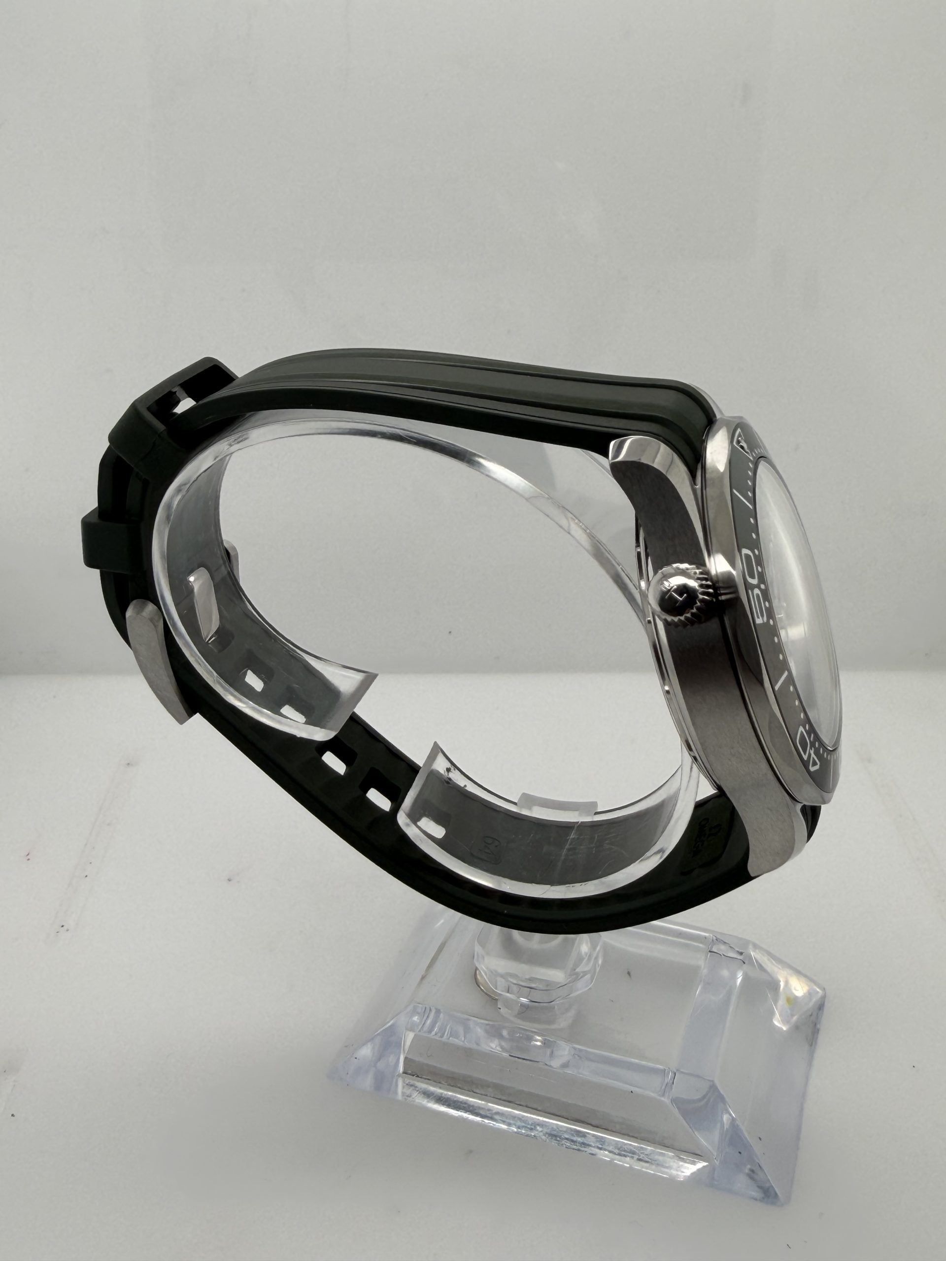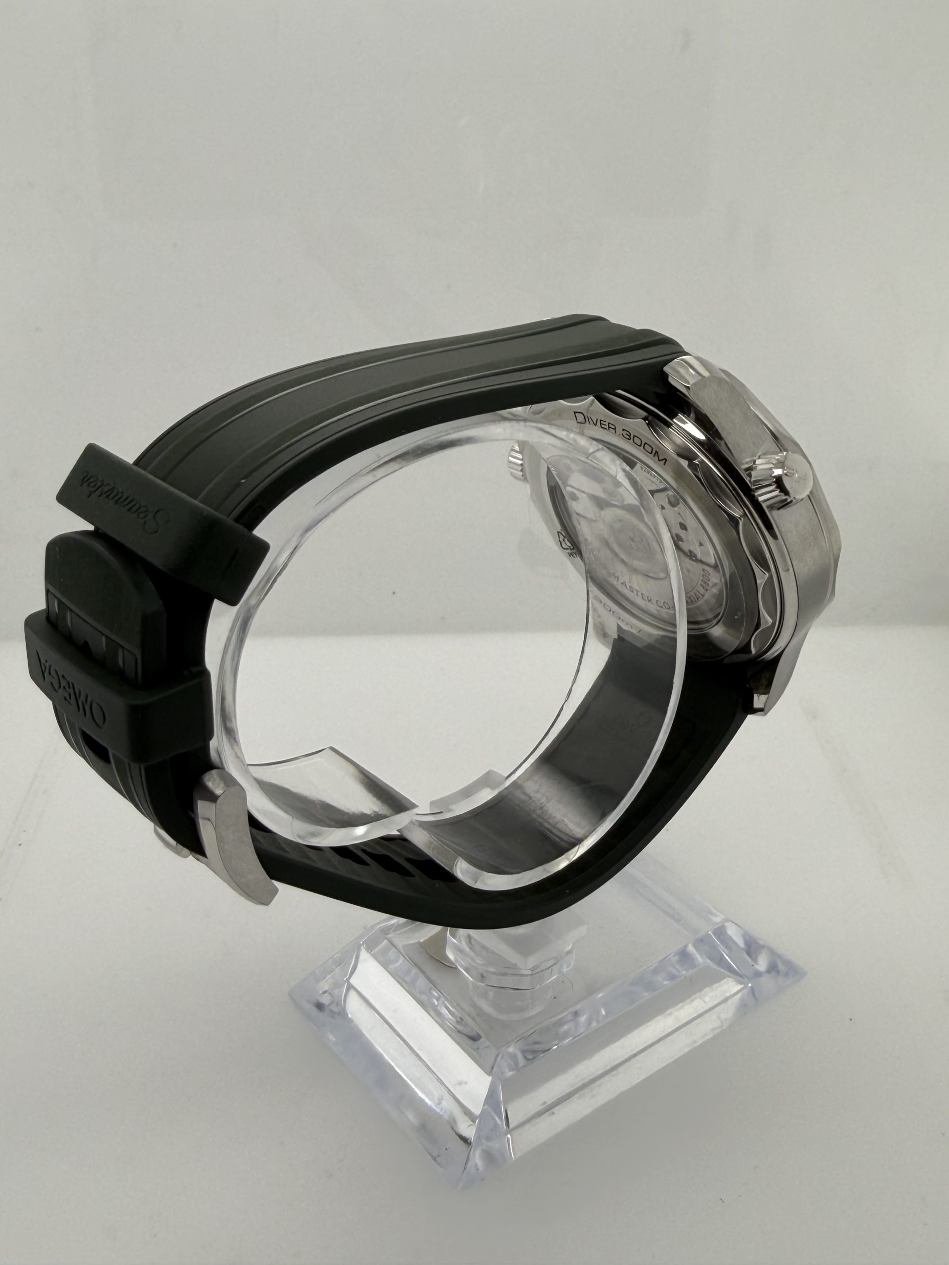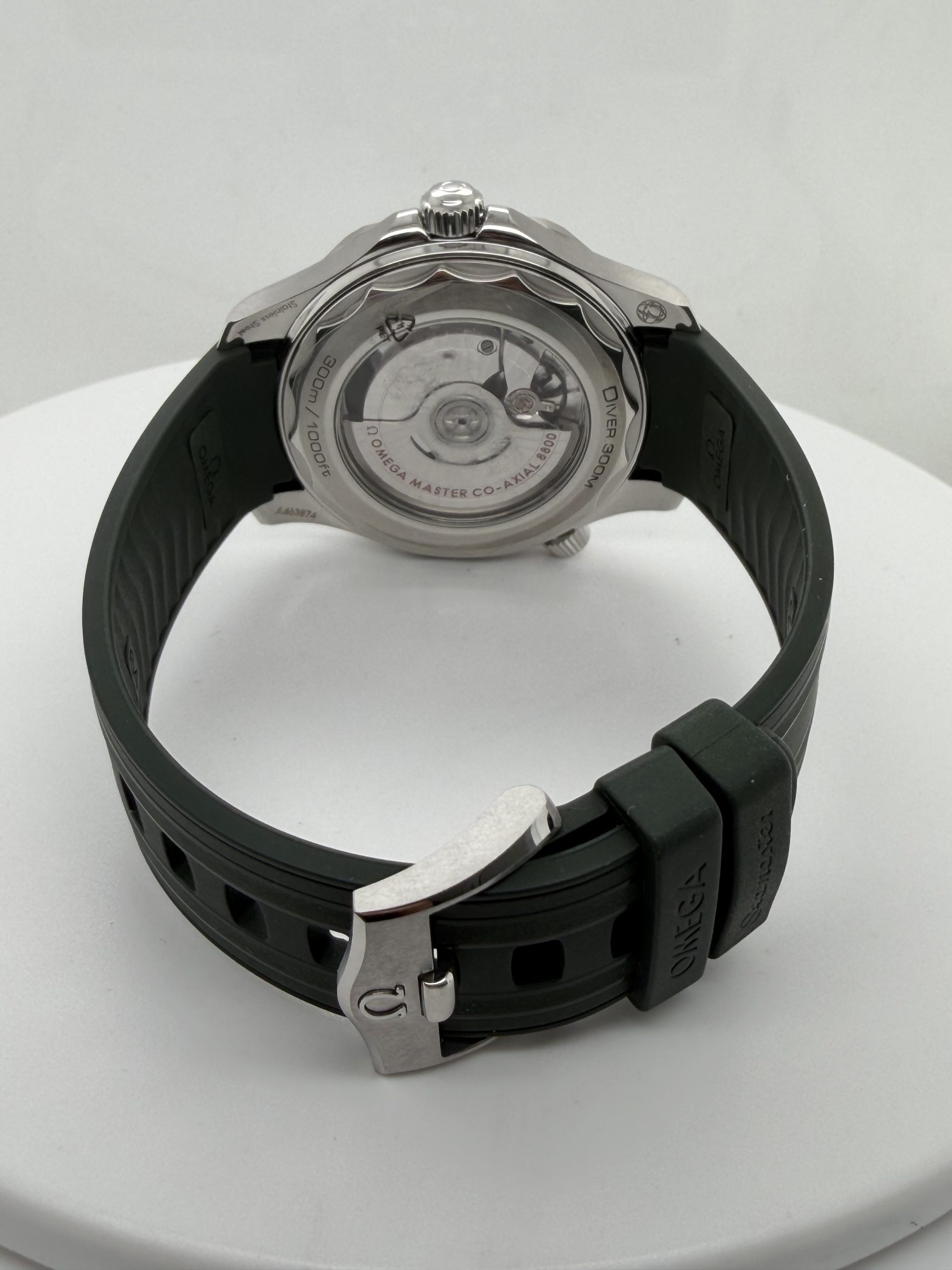 Co axial master chronometer uurwerk kaliber 8800 met een gangreserve van ~55 uur ,unidirectionele keramische bezel , schroefkroon en kastbodem voor extra waterdichtheid ,groen rubber met stalen pin sluiting , groene wijzerplaat , transparante kastbodem (exhibition case back ) geheel compleet met doos en certificaat 2025 voor de prijs van € 4800