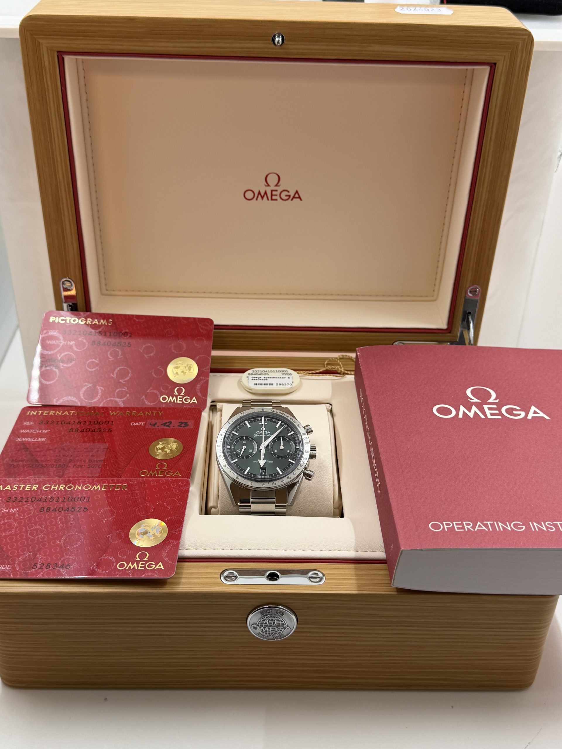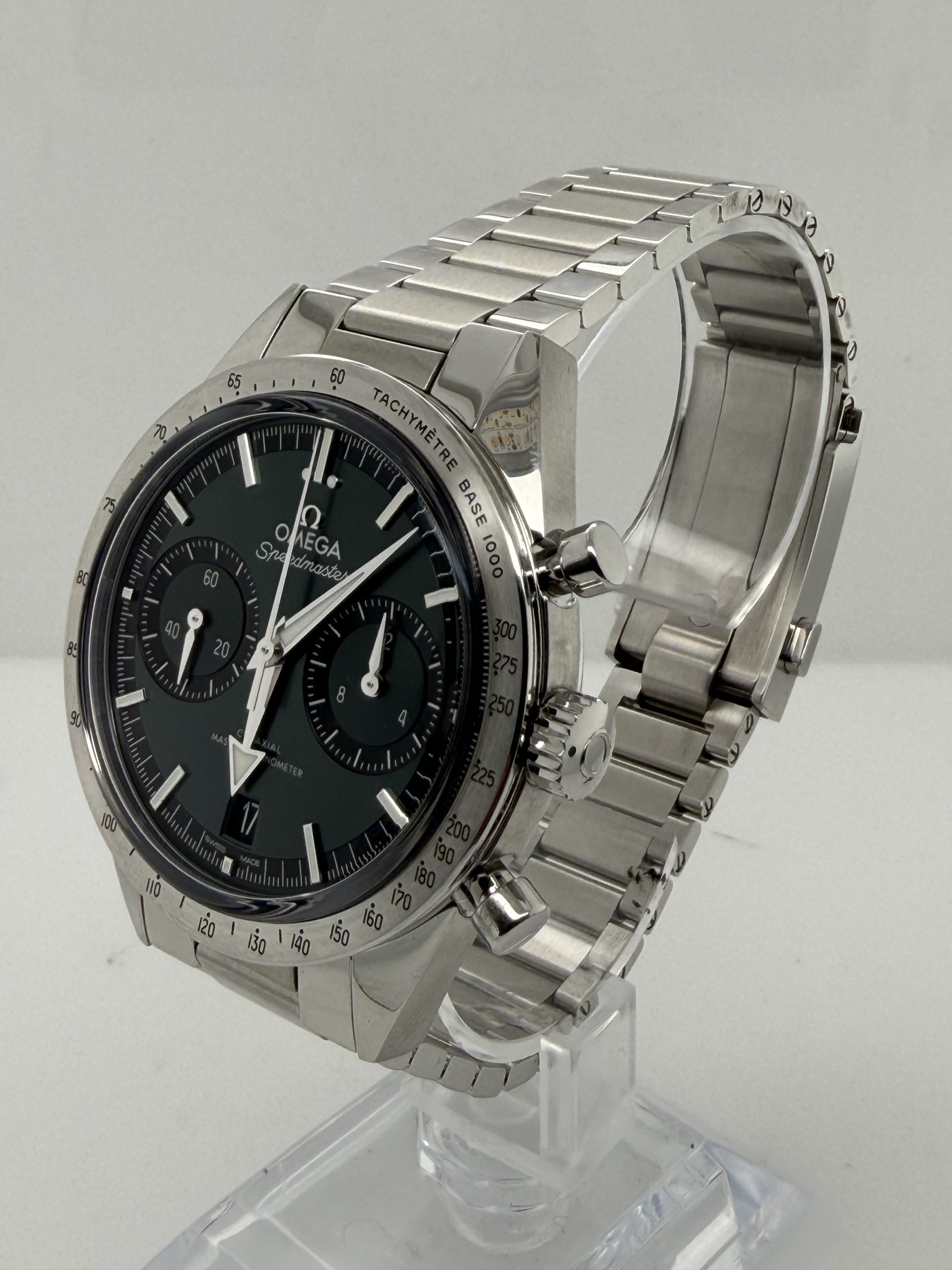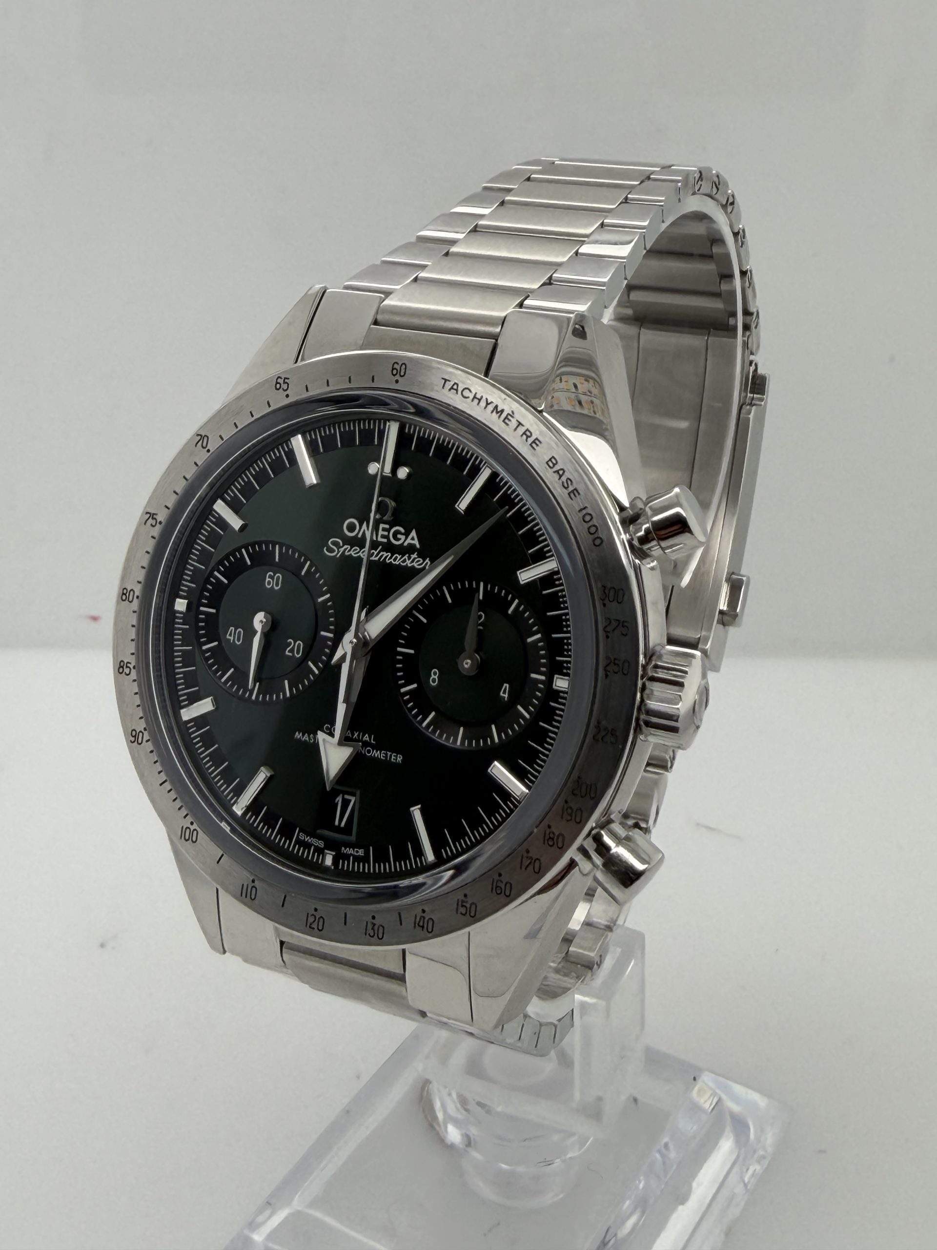 De Omega Speedmaster ‘57 is een elegante ,moderne interpretatie van het iconische Speedmaster model uit 1957 met een klassieke chronograafstijl gecombineerd met hedendaagse techniek , roestvrij stalen kast van 40,5 mm , handopgewonden Omega co-Axial master chronometer calibre 9906 met gangreserve ~60 uur ,groene sunray cadran met rhodium indexen en brede broad arrrow wijzers met wit super luminova ,saffierglas ,stalen schakelarmband met omega patent comfort micro adjust systeem voor een precieze en comfortabele pasvorm , Fullset ,NIEUW, doos certificaat €7999