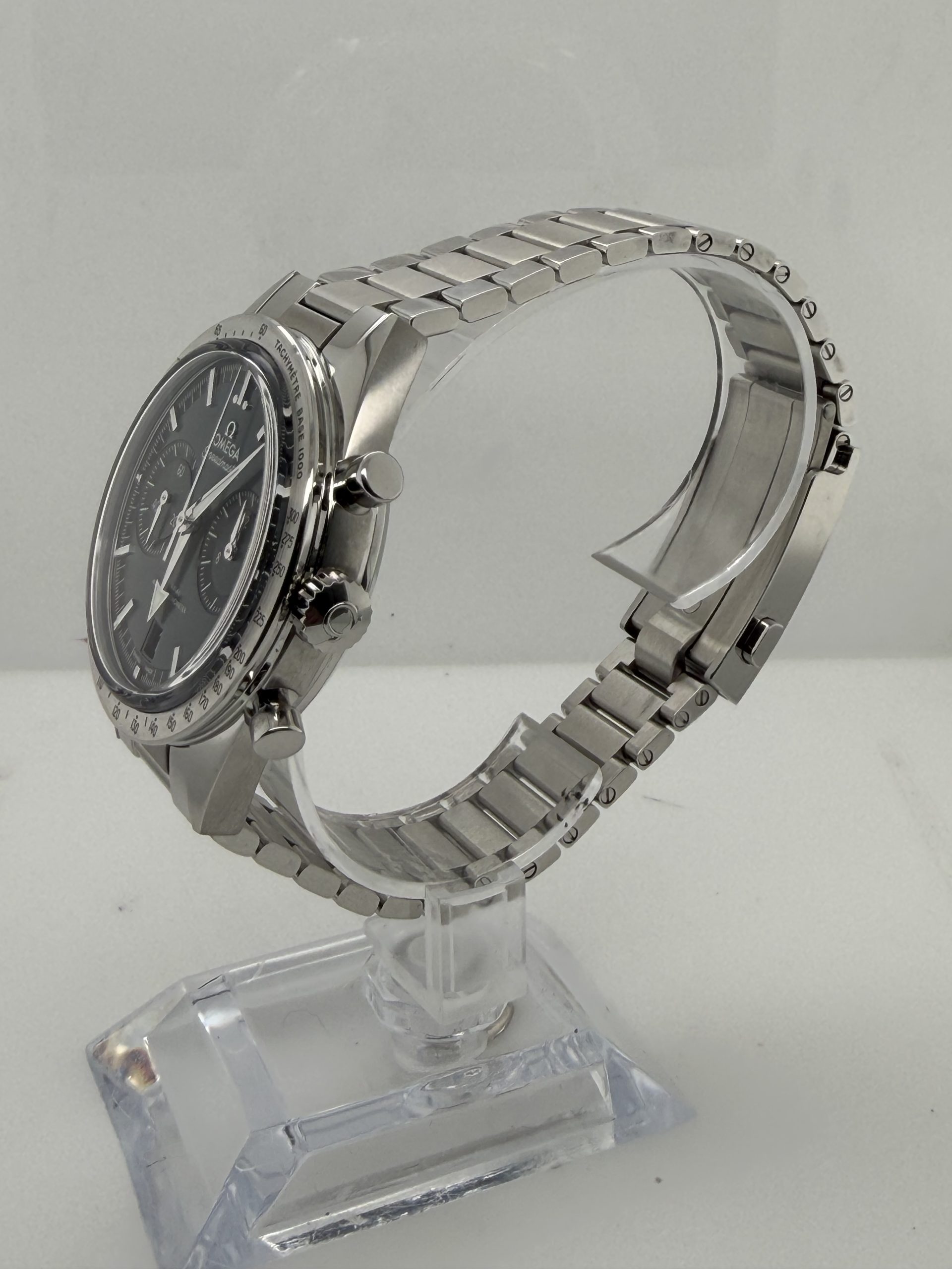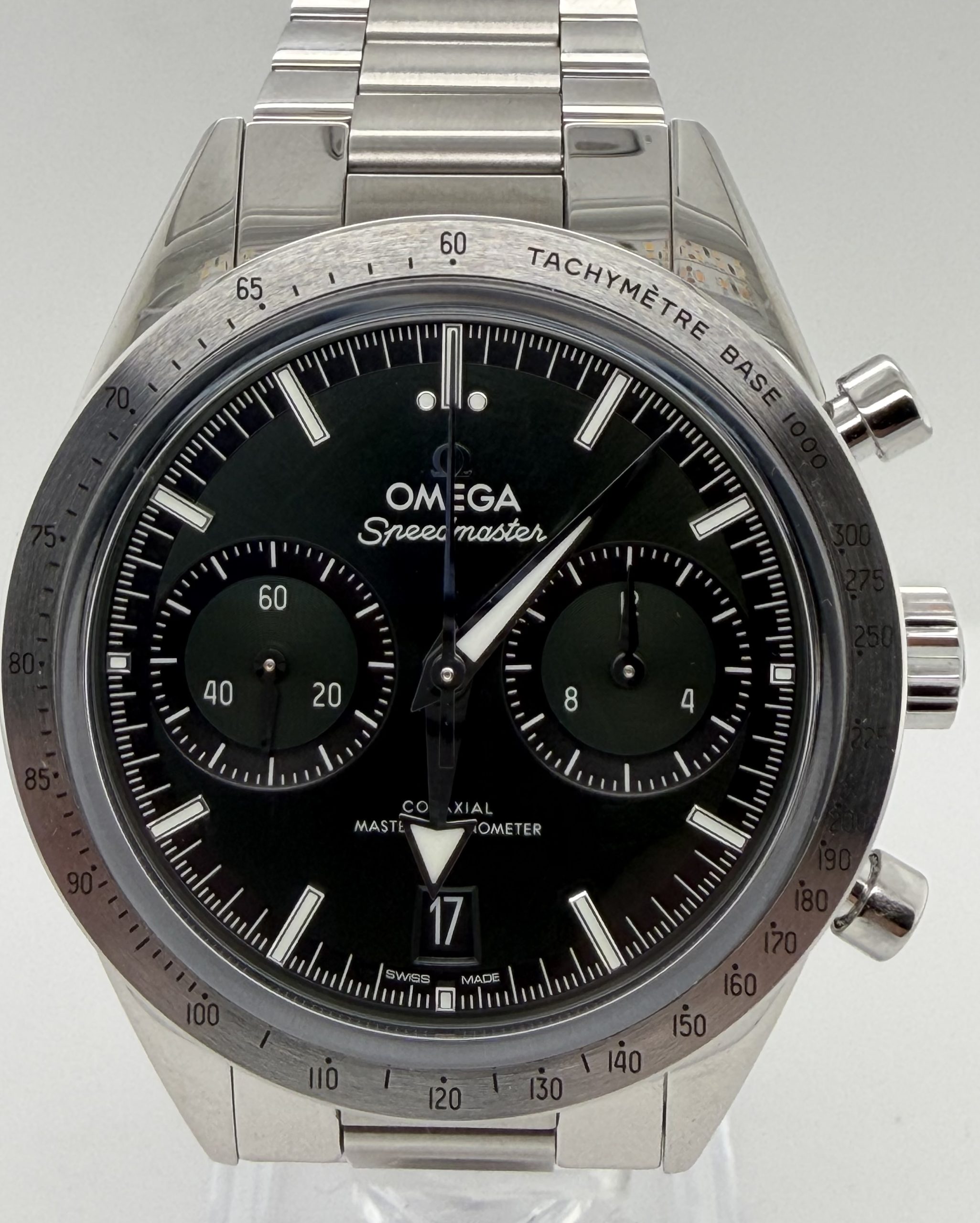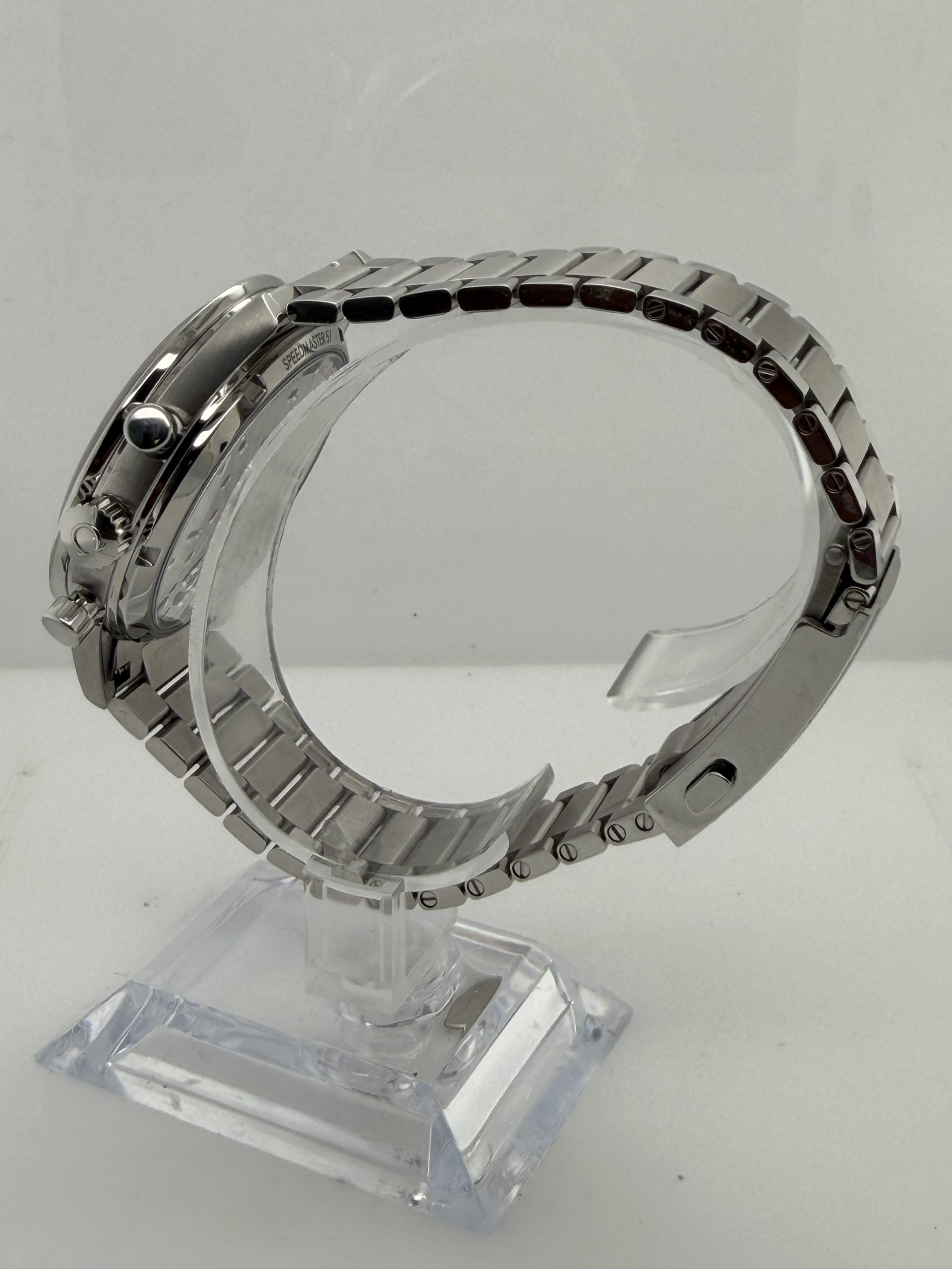De Omega Speedmaster ‘57 is een elegante ,moderne interpretatie van het iconische Speedmaster model uit 1957 met een klassieke chronograafstijl gecombineerd met hedendaagse techniek , roestvrij stalen kast van 40,5 mm , handopgewonden Omega co-Axial master chronometer calibre 9906 met gangreserve ~60 uur ,groene sunray cadran met rhodium indexen en brede broad arrrow wijzers met wit super luminova ,saffierglas ,stalen schakelarmband met omega patent comfort micro adjust systeem voor een precieze en comfortabele pasvorm , Fullset ,NIEUW, doos certificaat €7999