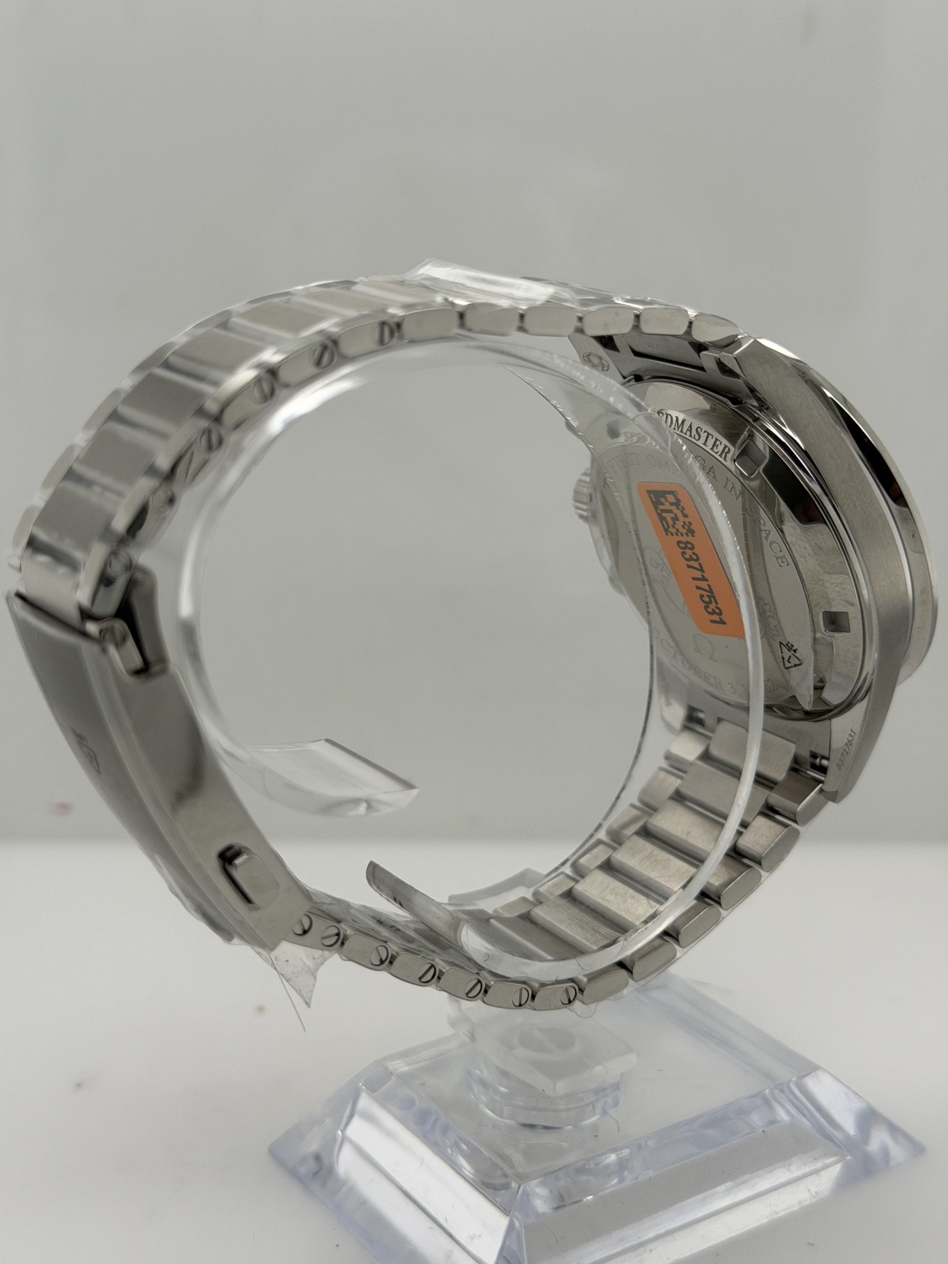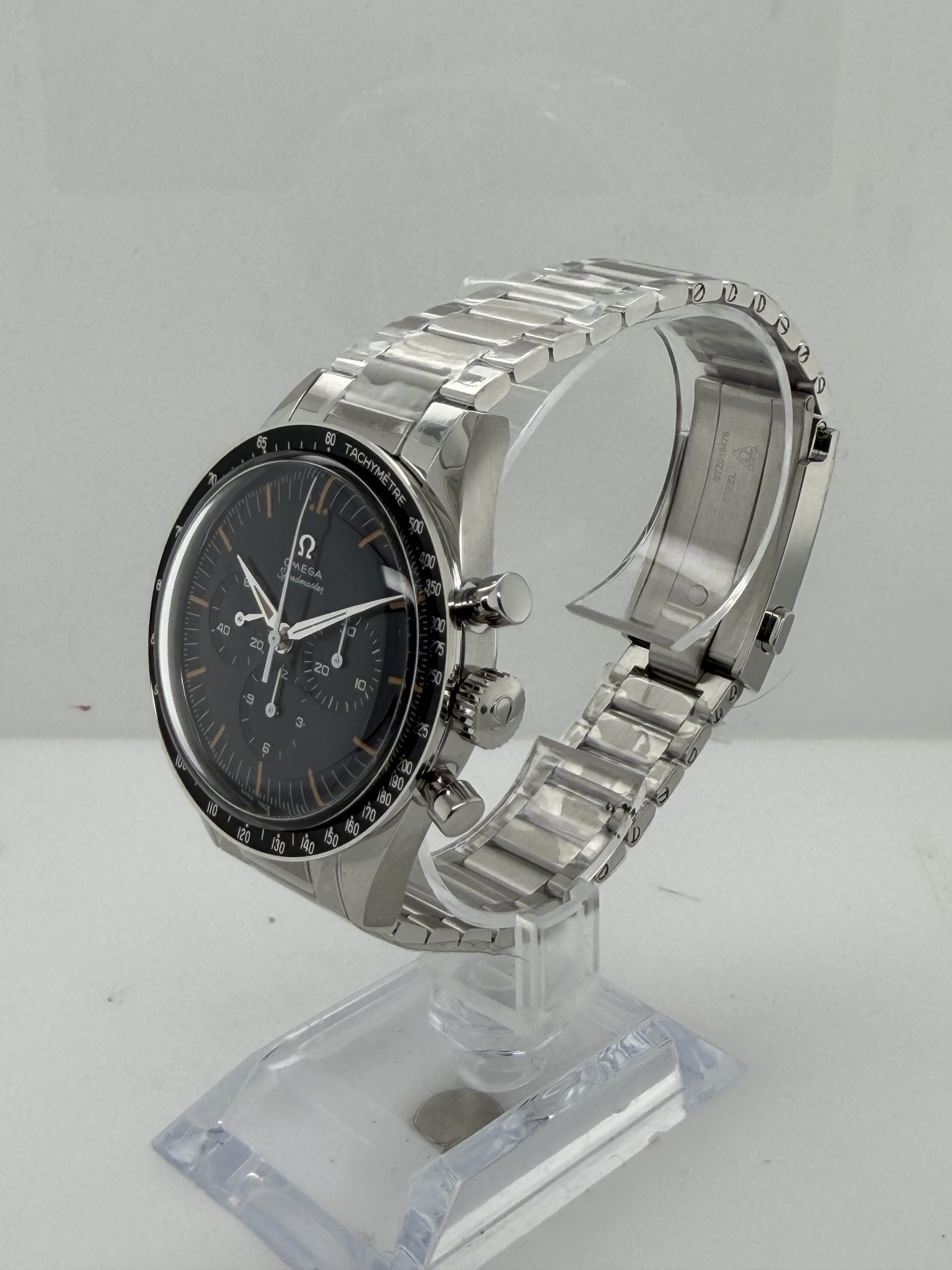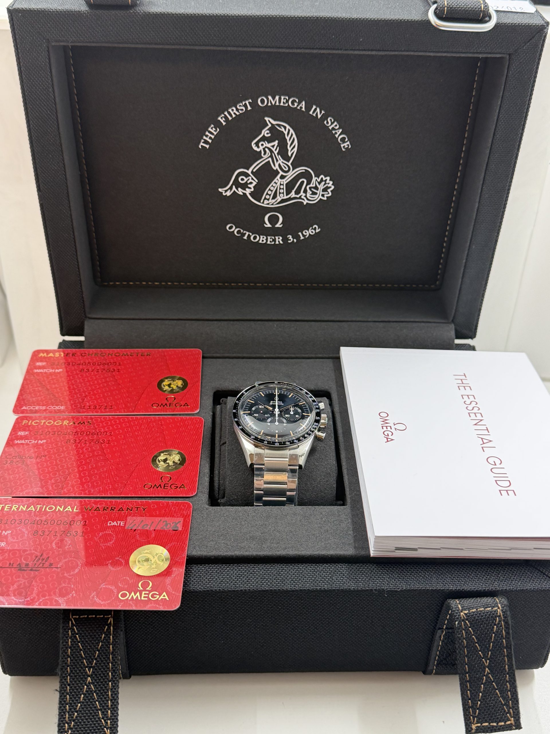 Omega Speedmaster First in space ‘ First Omega In Space ‘(FIOS) met referentie 31030405006001 heeft een roest vrij stalen kast van ca 39,7 mm, krasbestendig saffierglas met antireflectie , handopwind chronograafuurwerk met Co Axial e chappement kaliber Omega 3861 met een gangreserve van ~50 uur ,speciale wijzerplaat blauw-grijs CVD gelaagde die varieert met licht , chronograaf functie ,tachymeterschaal , roestvrijstalen armband met vouwsluiting ,’flat link’ontwerp voor een klassieke maar comfortabele pasvorm , geheel compleet (Fullset) met doos en certificaat 2026 voor de prijs van € 7100