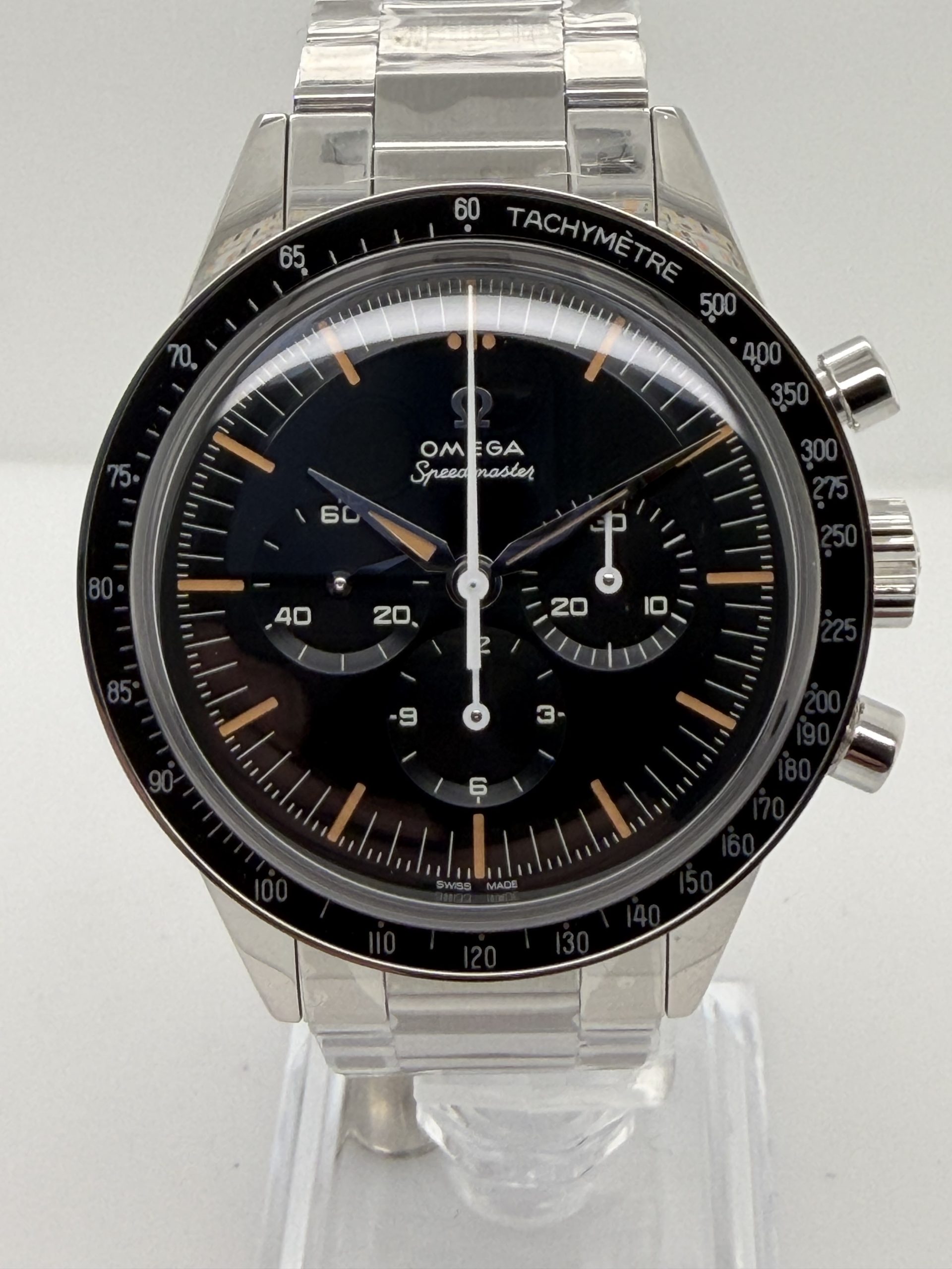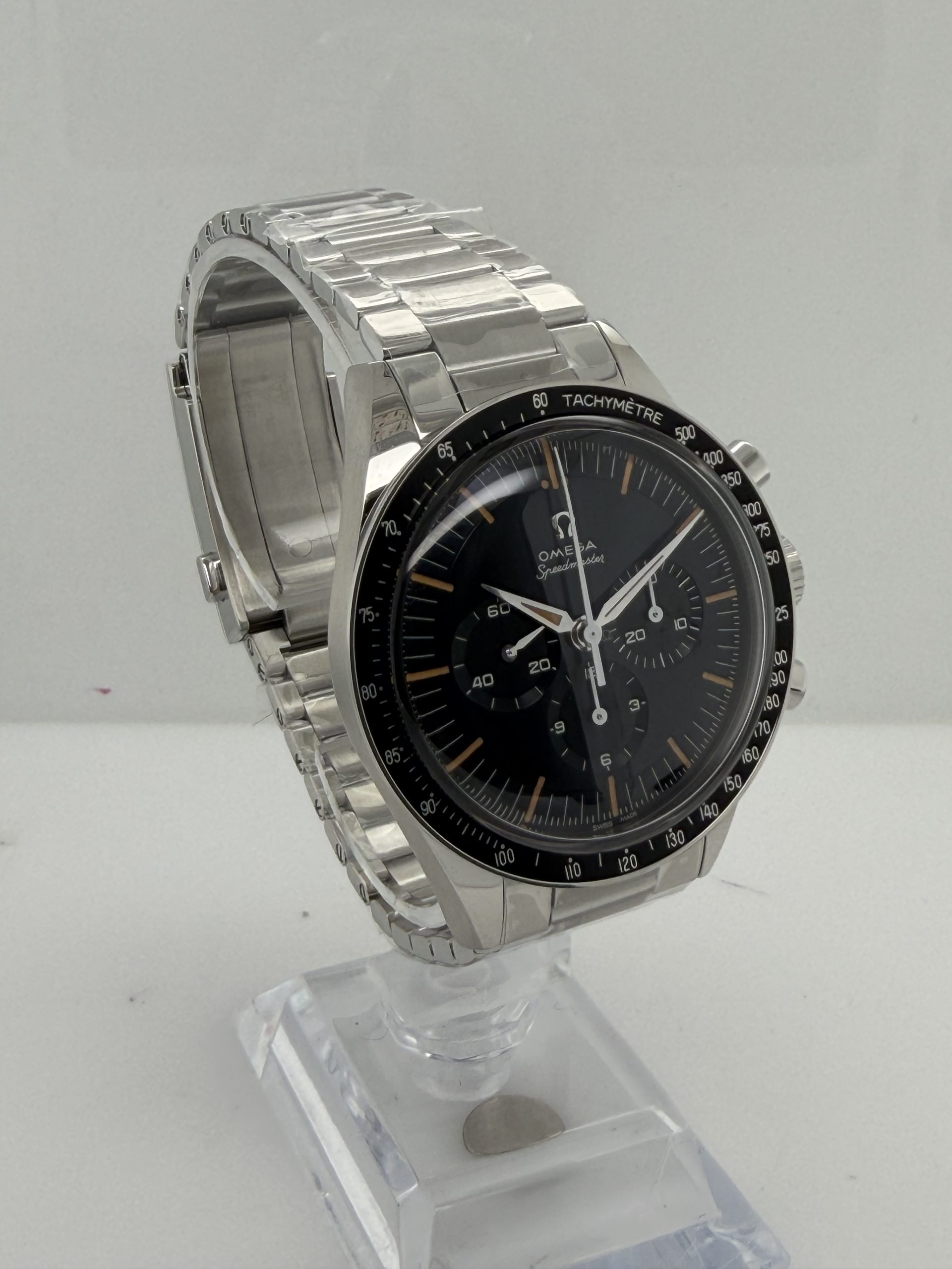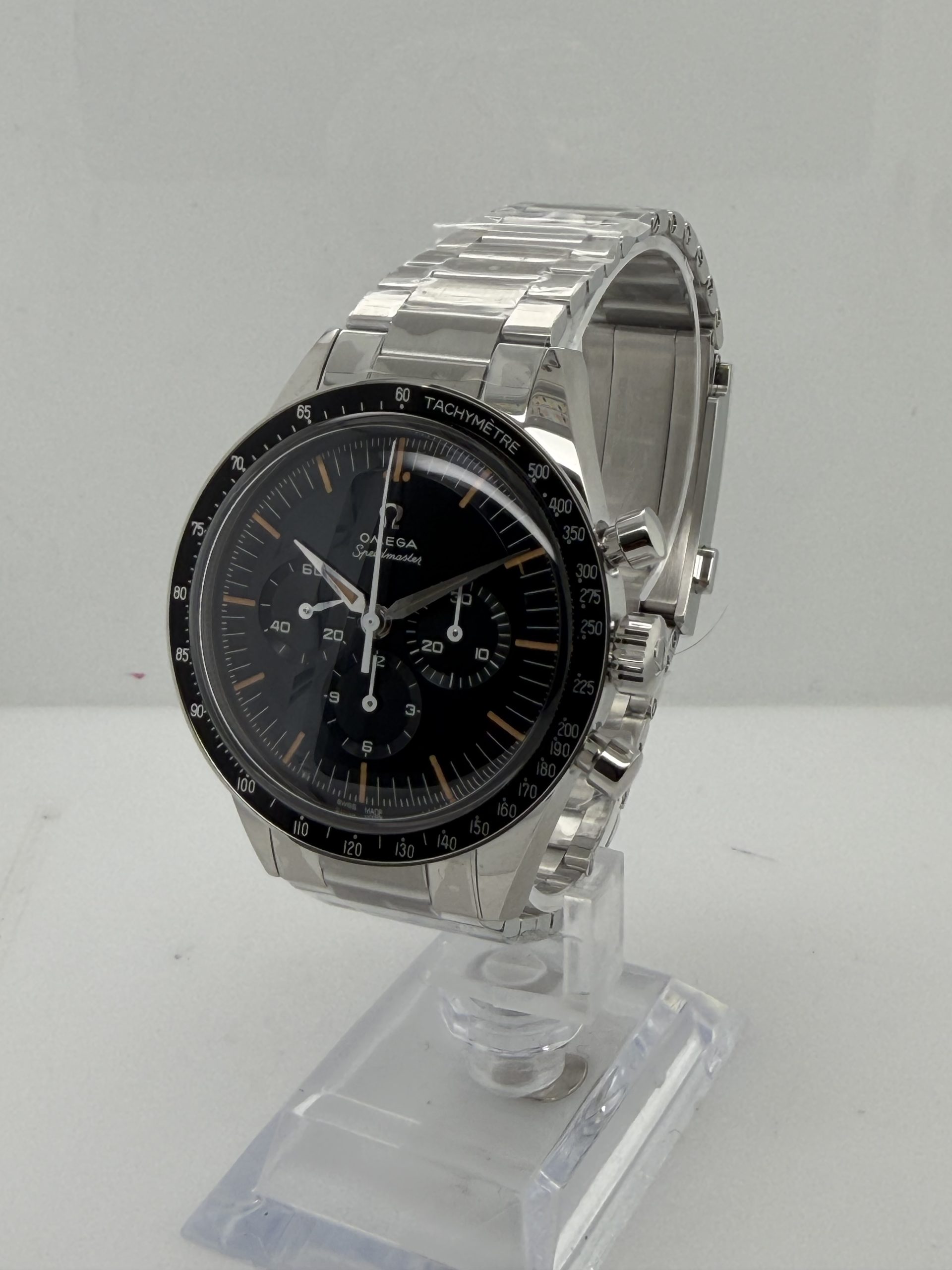 Omega Speedmaster First in space ‘ First Omega In Space ‘(FIOS) met referentie 31030405006001 heeft een roest vrij stalen kast van ca 39,7 mm, krasbestendig saffierglas met antireflectie , handopwind chronograafuurwerk met Co Axial e chappement kaliber Omega 3861 met een gangreserve van ~50 uur ,speciale wijzerplaat blauw-grijs CVD gelaagde die varieert met licht , chronograaf functie ,tachymeterschaal , roestvrijstalen armband met vouwsluiting ,’flat link’ontwerp voor een klassieke maar comfortabele pasvorm , geheel compleet (Fullset) met doos en certificaat 2026 voor de prijs van € 7100