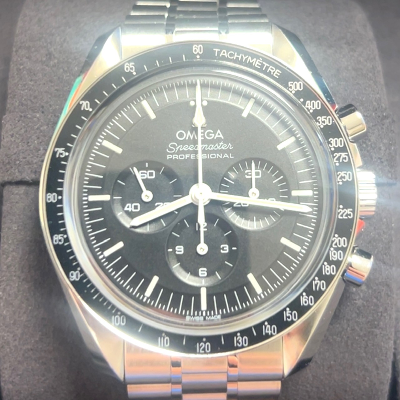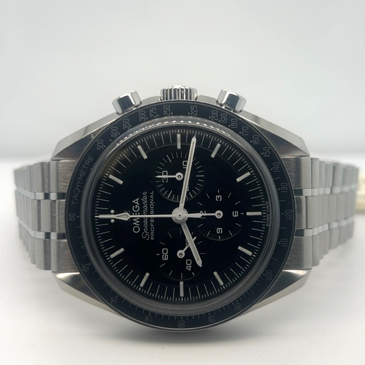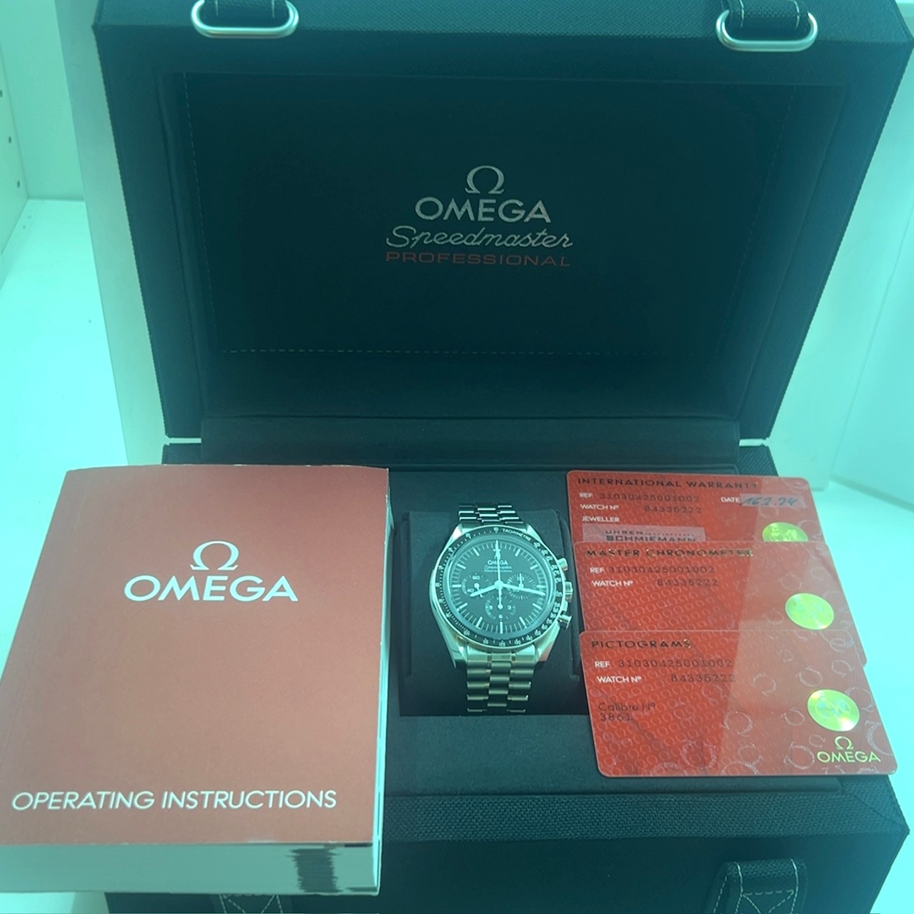 Omega Speedmaster Moonwatch proffessional Co-axial Master chronometer met referentie 310.30.42.50.01.002 chronometer in het staal 42 mm ,asymmetrisch design geinspireerd op het beroemde 4e generatie speedmaster-model dat gedragen werd tijdens de maanlandingen, voor- en achterzijde voorzien van bol saffierglas met anti reflectie (sapphire sandwich ) ,aluminium tachymeter met iconische “dot over 90”,zwarte step dial ,kleine secondewijzer plus 30-minuten en 12-uur subdials ,stalen bracelet met vijf schakel per rij en vouwsluiting met comfort sluiting ,Handopwind omega co axial master chronometercalibre 3861 met een gangreserve van 50 uur , waterdicht tot 5 bar/50 meter , deze moderne interpretatie van de iconische Moonwatch is nieuw dus ongedragen,in de stickers, en geheel compleet voor de prijs van 7.999 euro