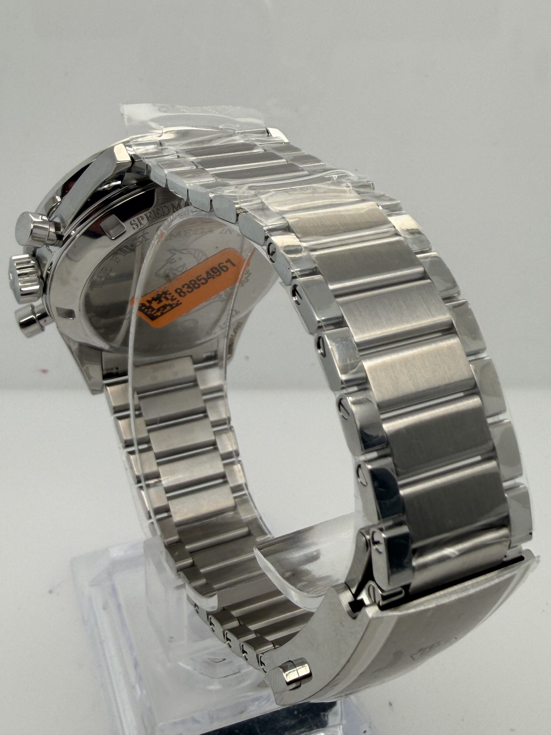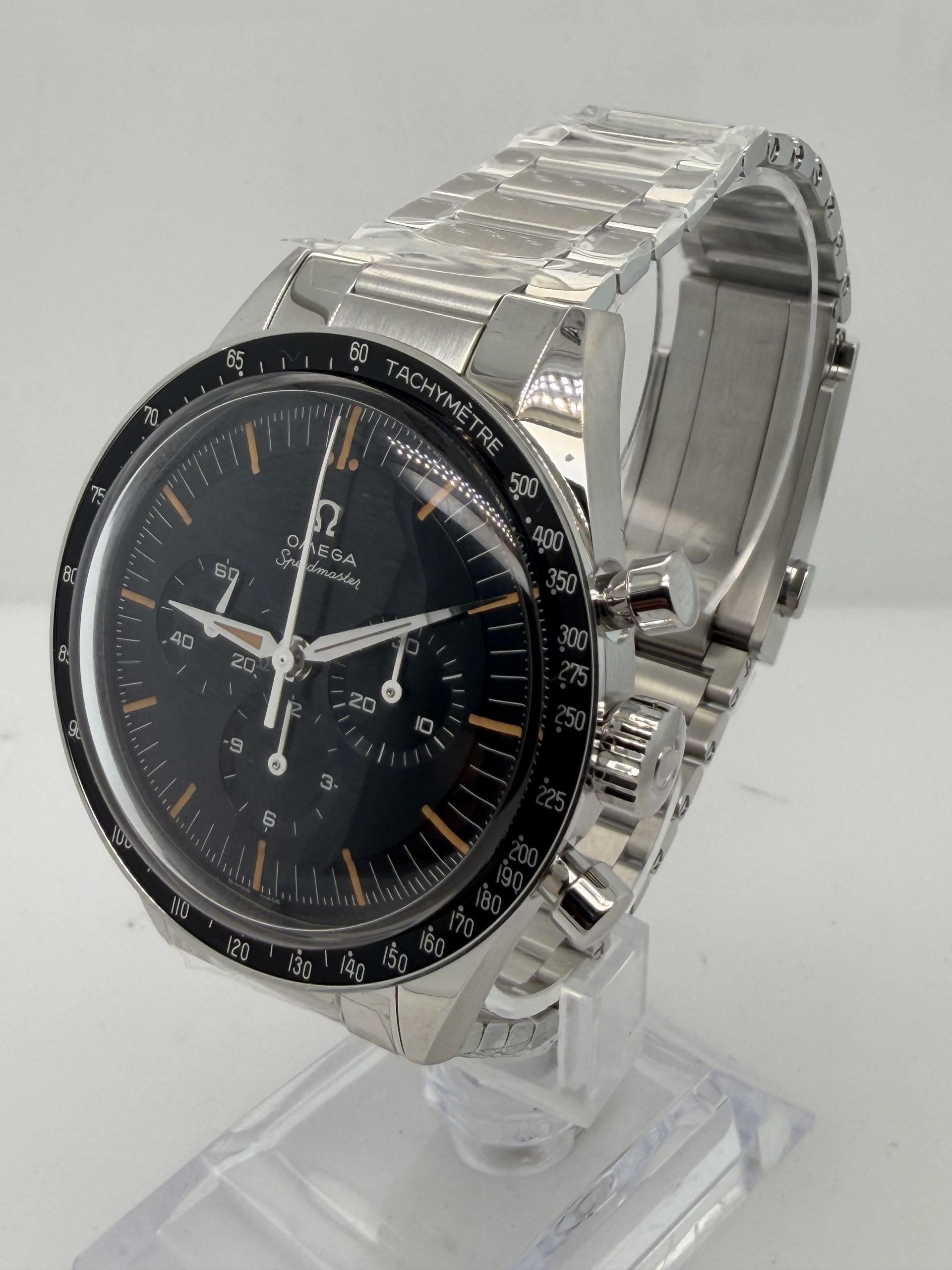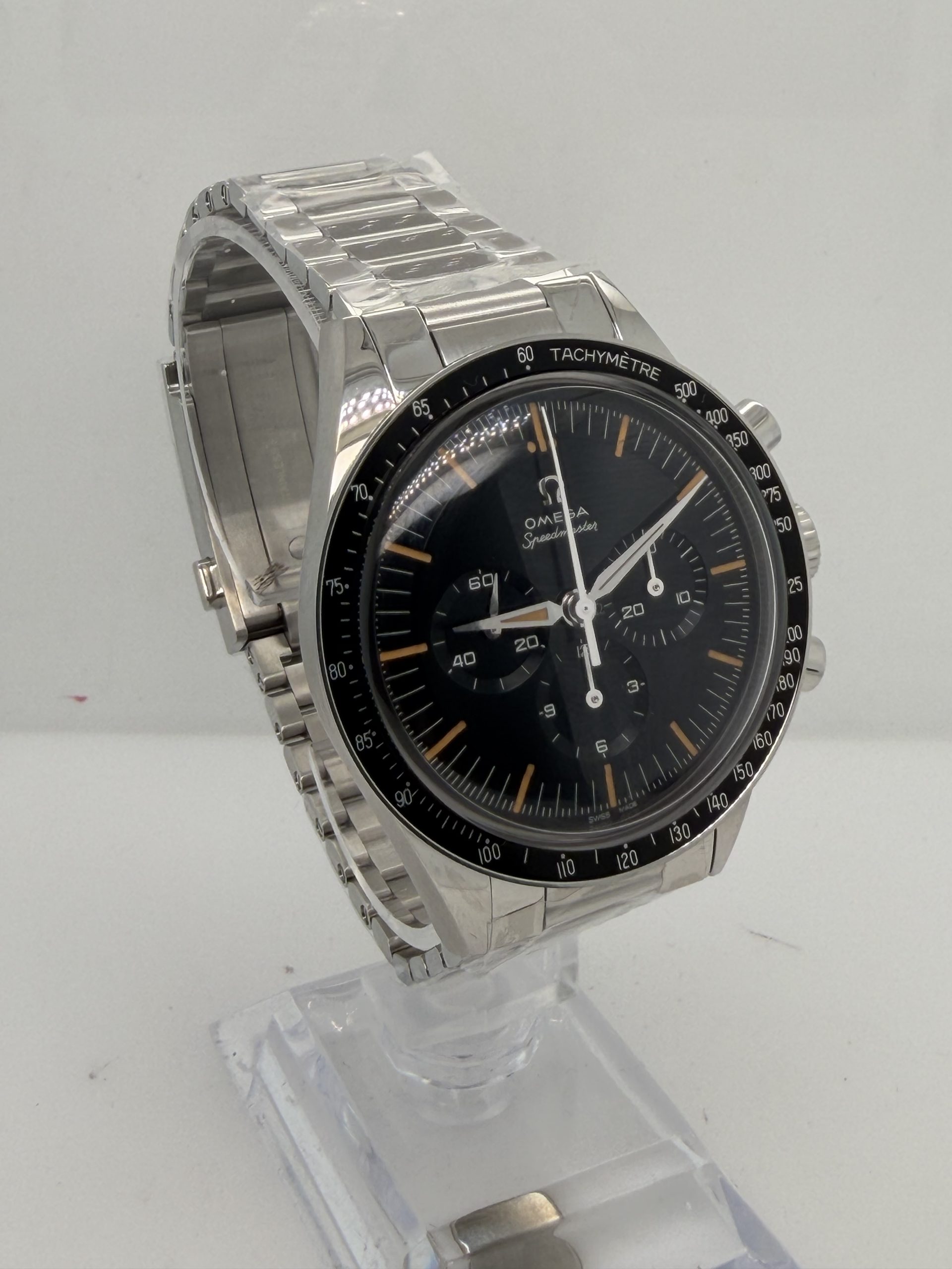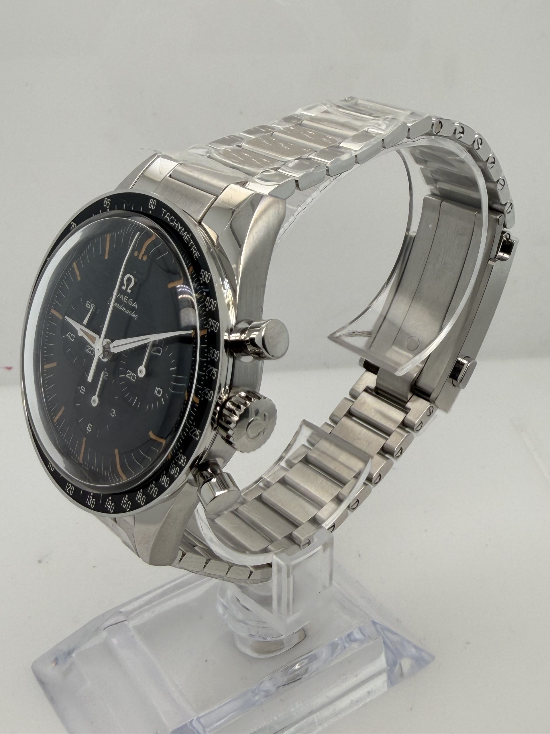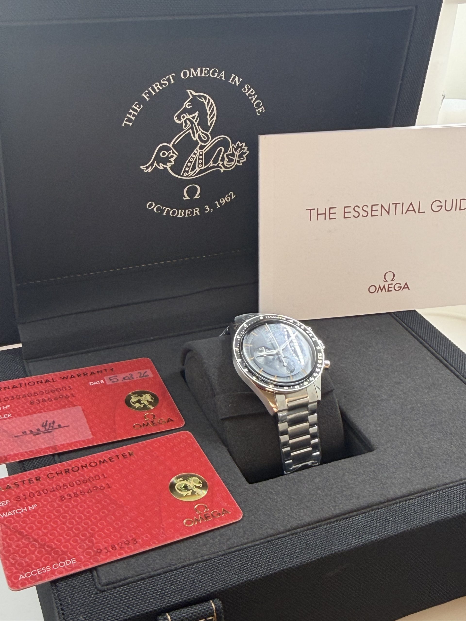 Dit model is de moderne heruitgave van de beroemde Speedmaster die in 1962 door austronaut Walter Schirra werd gedragen tijdens de missie Sigma 7 .Daarmee is het de eerste Omega in de ruimte nog voor de maanlanding vandaar de naam First Omega in Space ( FOIS) . De omega Speedmaster (FOIS) heeft referentie 31030405006001 , de roestvrijstalen kast is 39,7 mm en heeft een handopwindbaar Omega Caliber 3861 met een gangreserve van ~50 uur .Zwart/grijs ( step dial ) wijzerplaat met vintage stijl met diepte . Hesalite (plexiglas ) . Stalen band met vouwsluiting .Dit horloge. Is zeer geliefd bij verzamelaars en liefhebbers van ruimtevaartgeschiedenis is geheel compleet nog in de STICKERS met doos en certificaat 2026 voor de prijs van € 6700