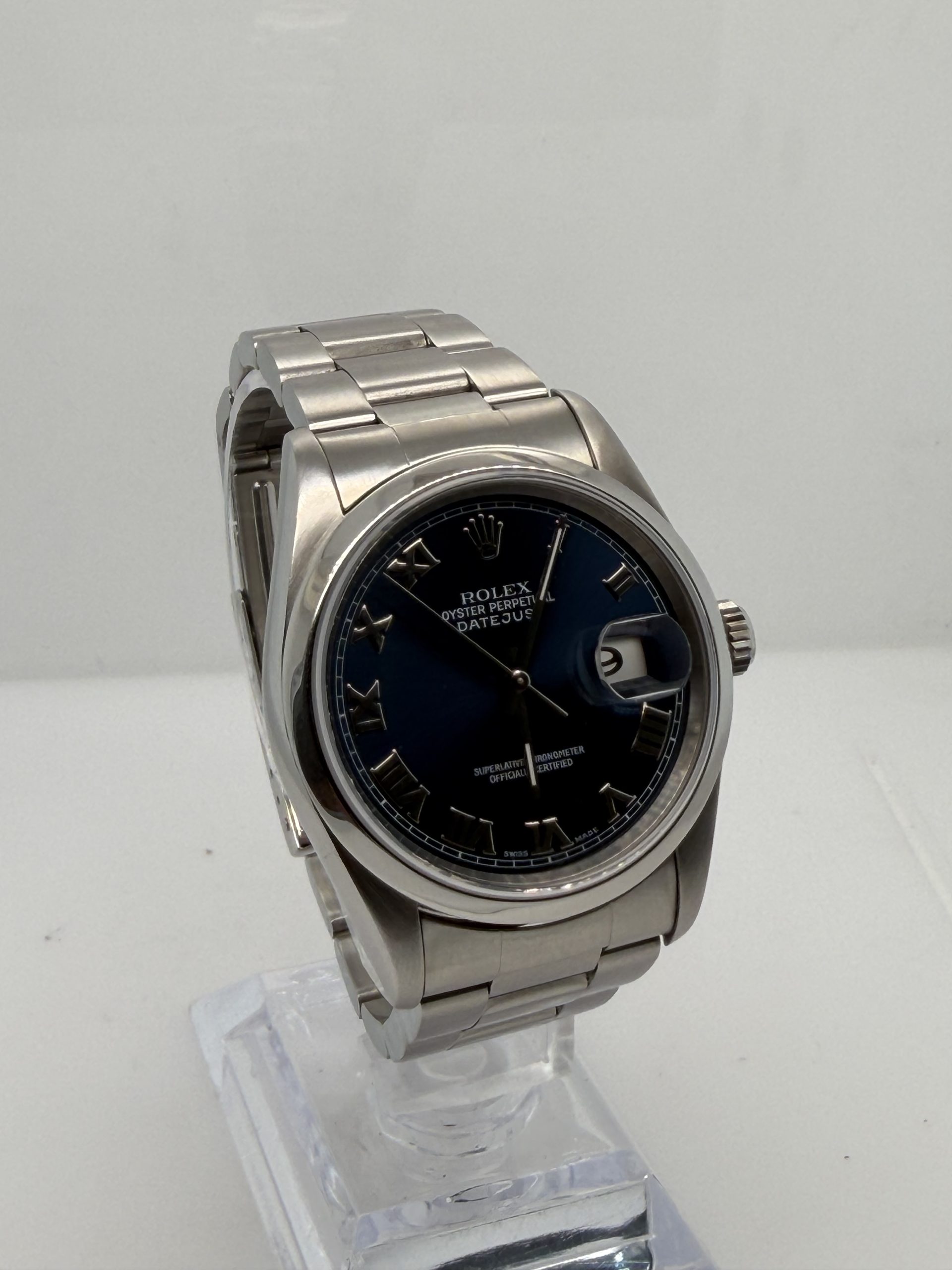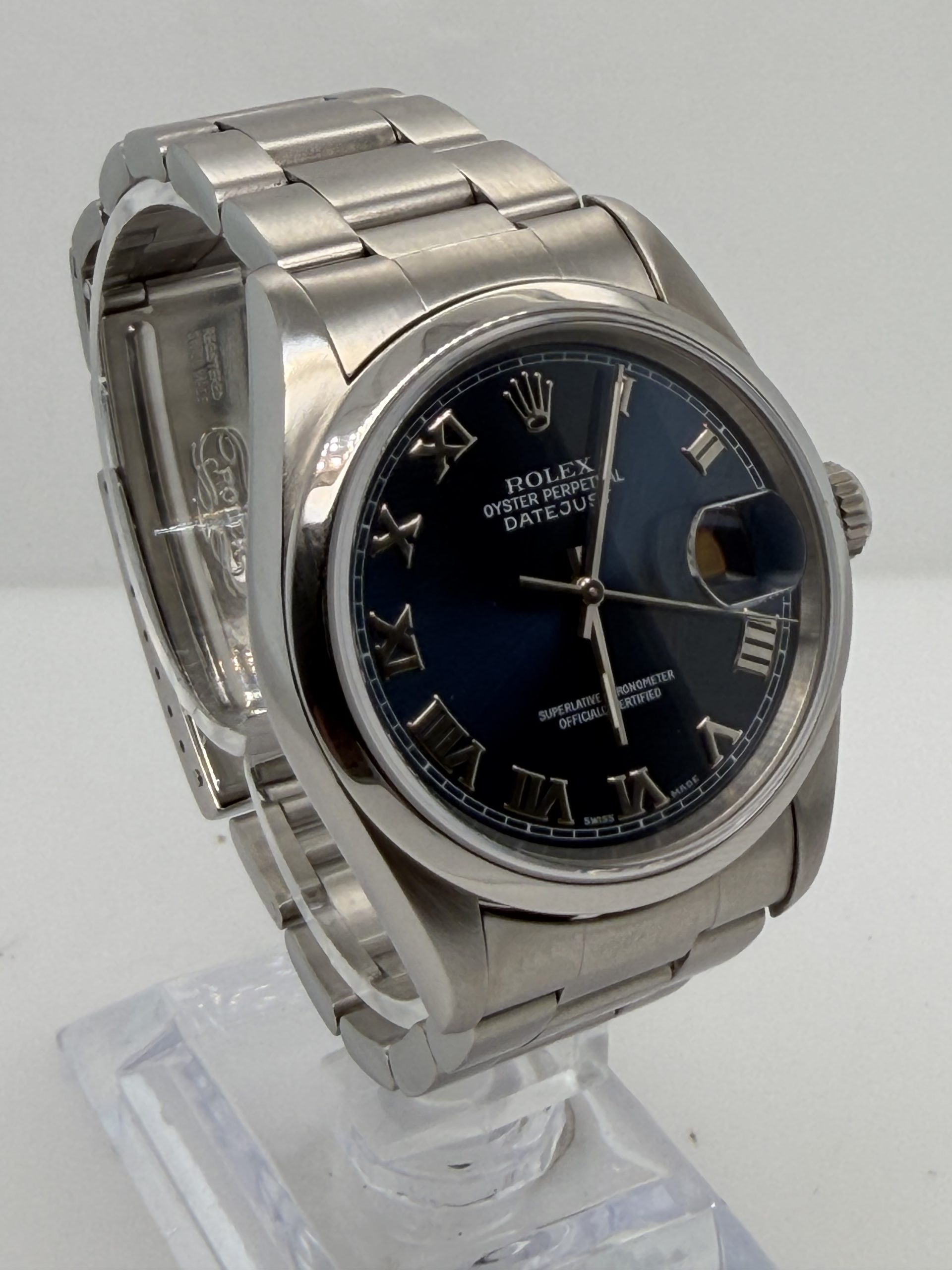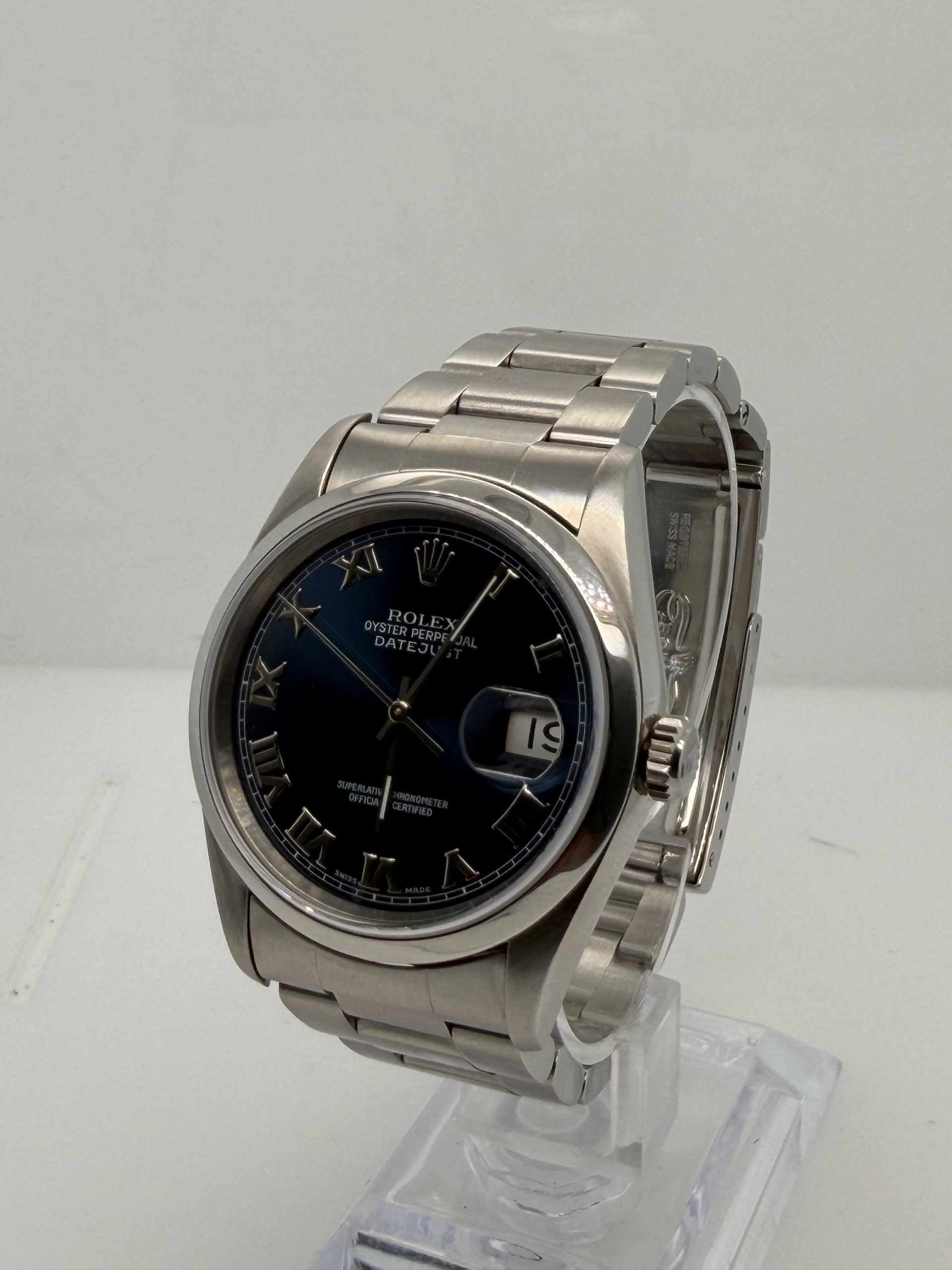 De Rolex Datejust met referentie 16200 is een van Rolex meest tijdloze en veelzijdige horloge ,automatisch uurwerk met caliber 3135, COSC gecertificeerd chronometer , gangreserve van circa ~48 uur , roestvrij stalen kast van 36 mm , saffierglas met datum vergrotende cycloop lens, oyster bracelet roestvrij , blauwe wijzerplaat met Roemeinse cijfers , serienummer W* dus productie jaar 1995 helaas geen certificaat wel winkelgarantie €4.999