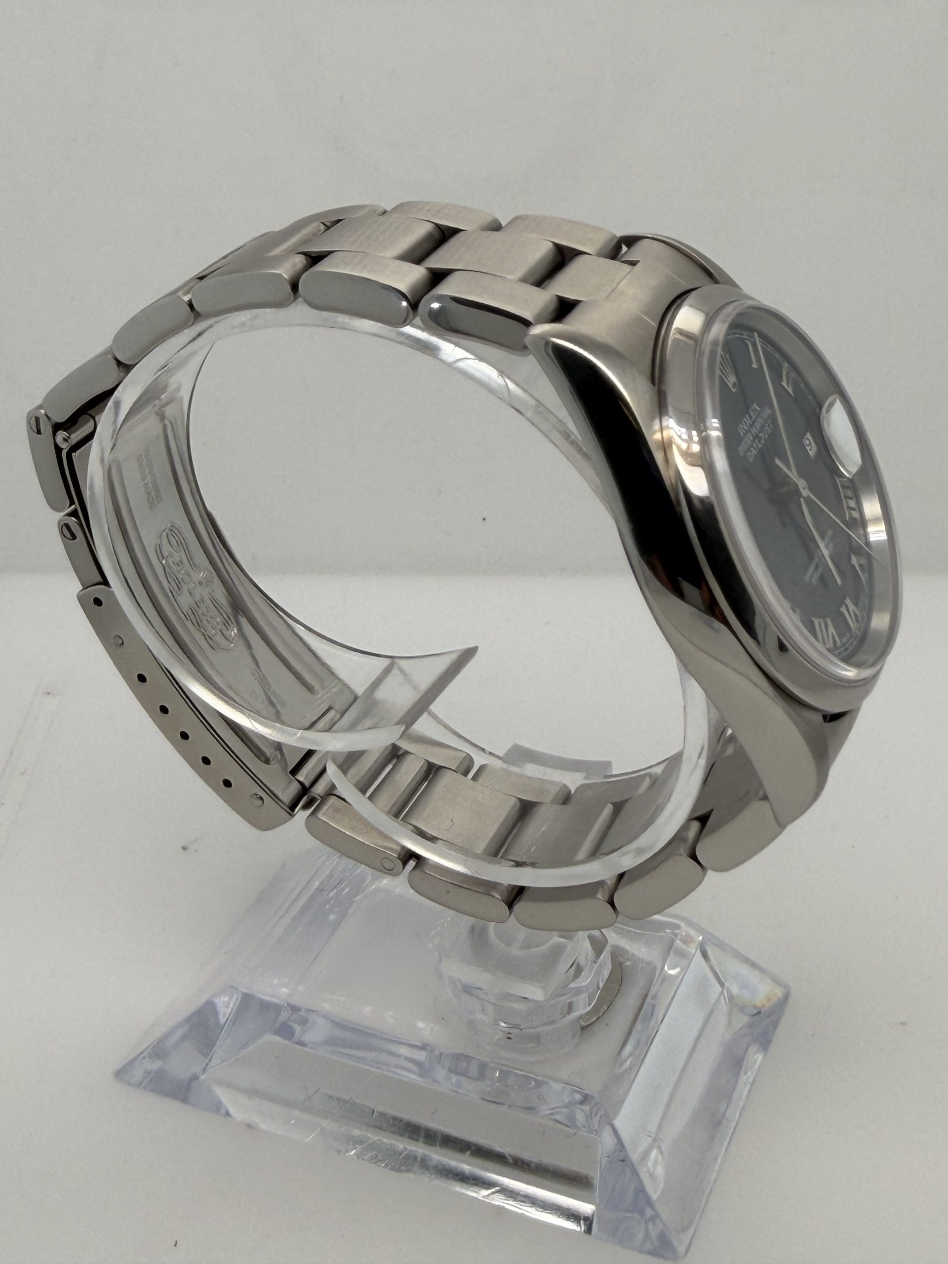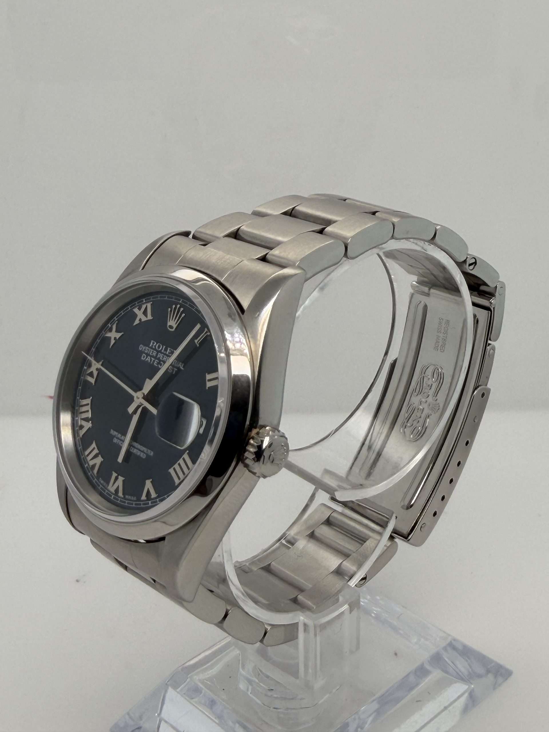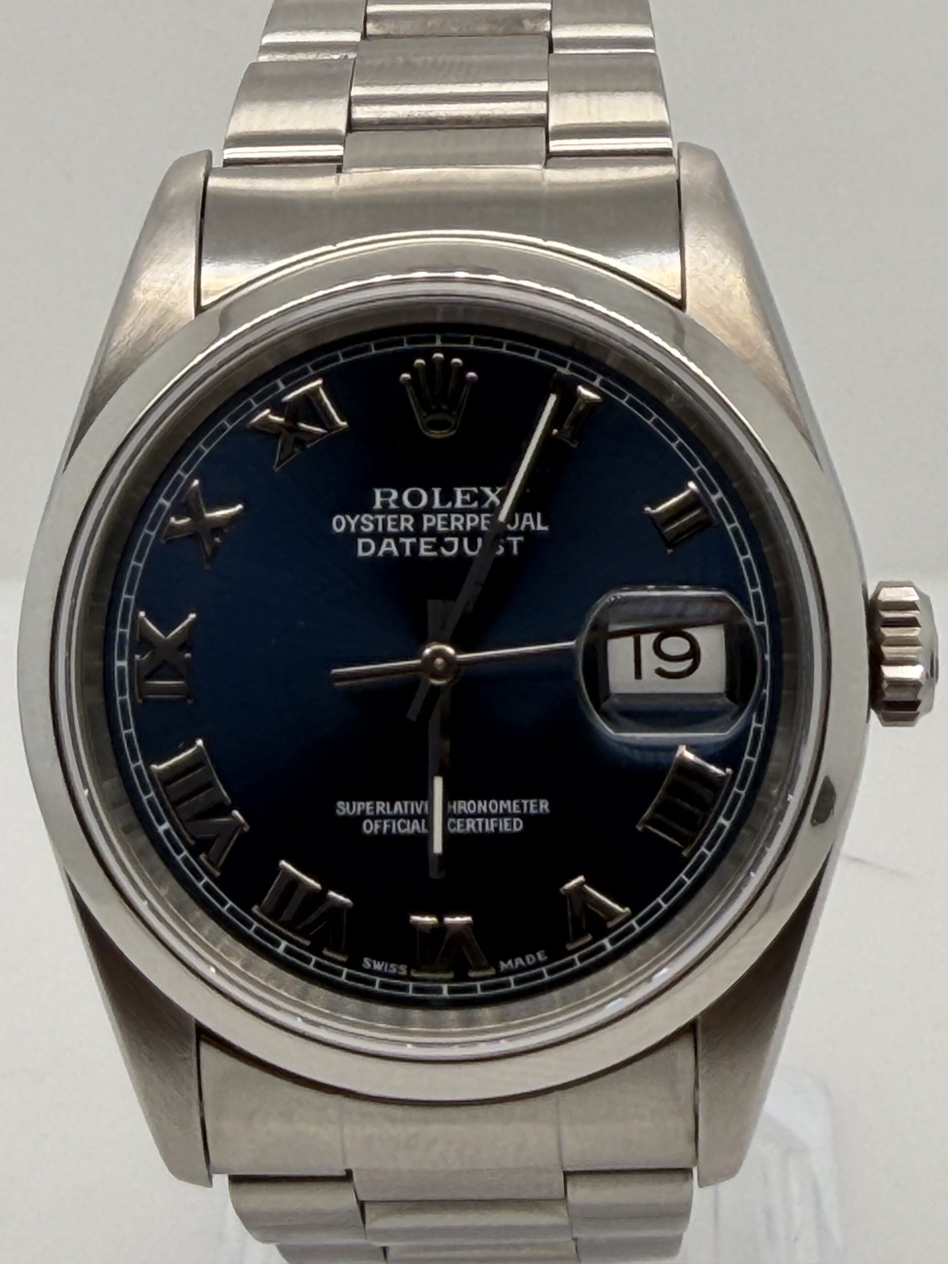 De Rolex Datejust met referentie 16200 is een van Rolex meest tijdloze en veelzijdige horloge ,automatisch uurwerk met caliber 3135, COSC gecertificeerd chronometer , gangreserve van circa ~48 uur , roestvrij stalen kast van 36 mm , saffierglas met datum vergrotende cycloop lens, oyster bracelet roestvrij , blauwe wijzerplaat met Roemeinse cijfers , serienummer W* dus productie jaar 1995 helaas geen certificaat wel winkelgarantie €4.999