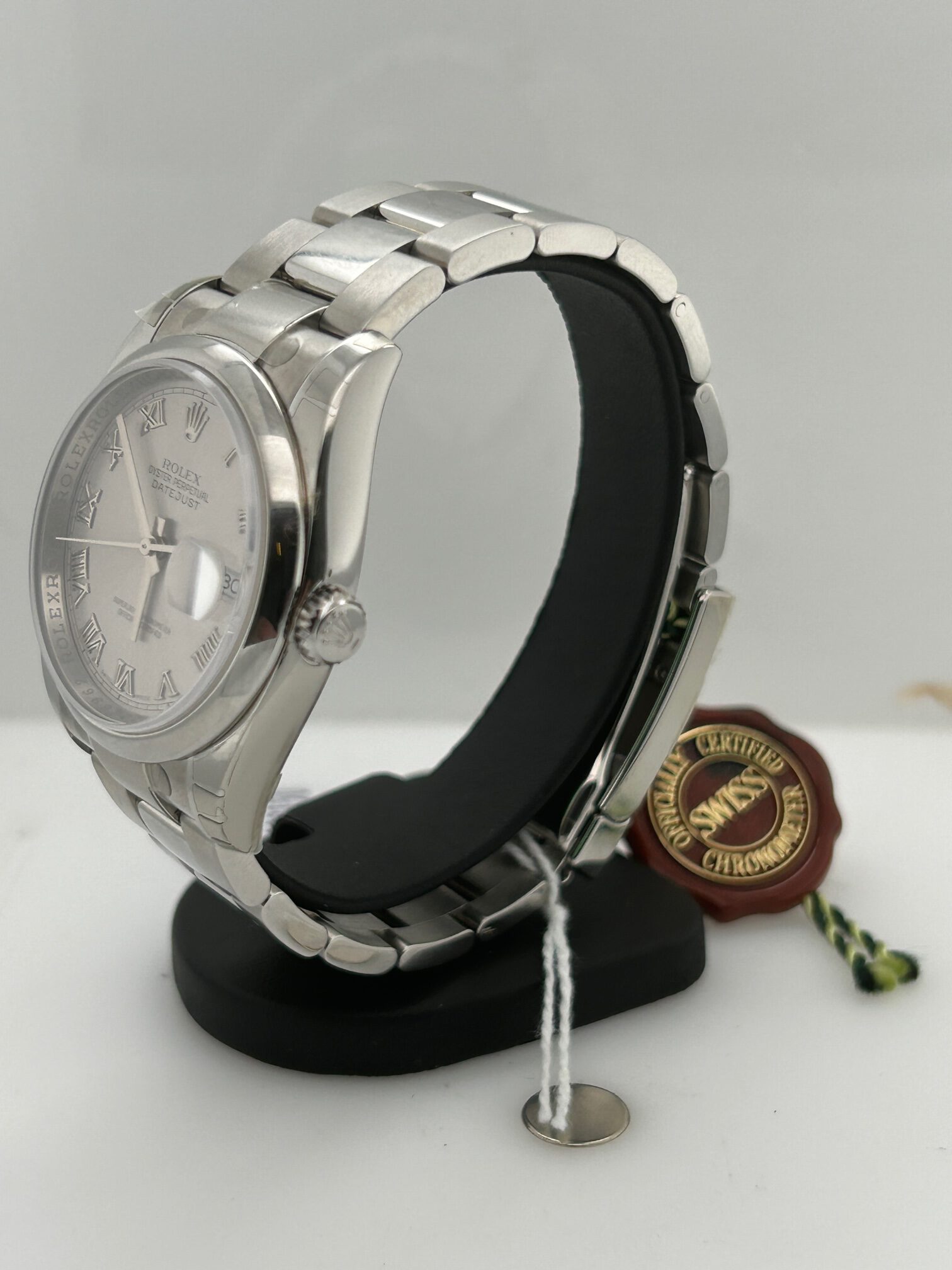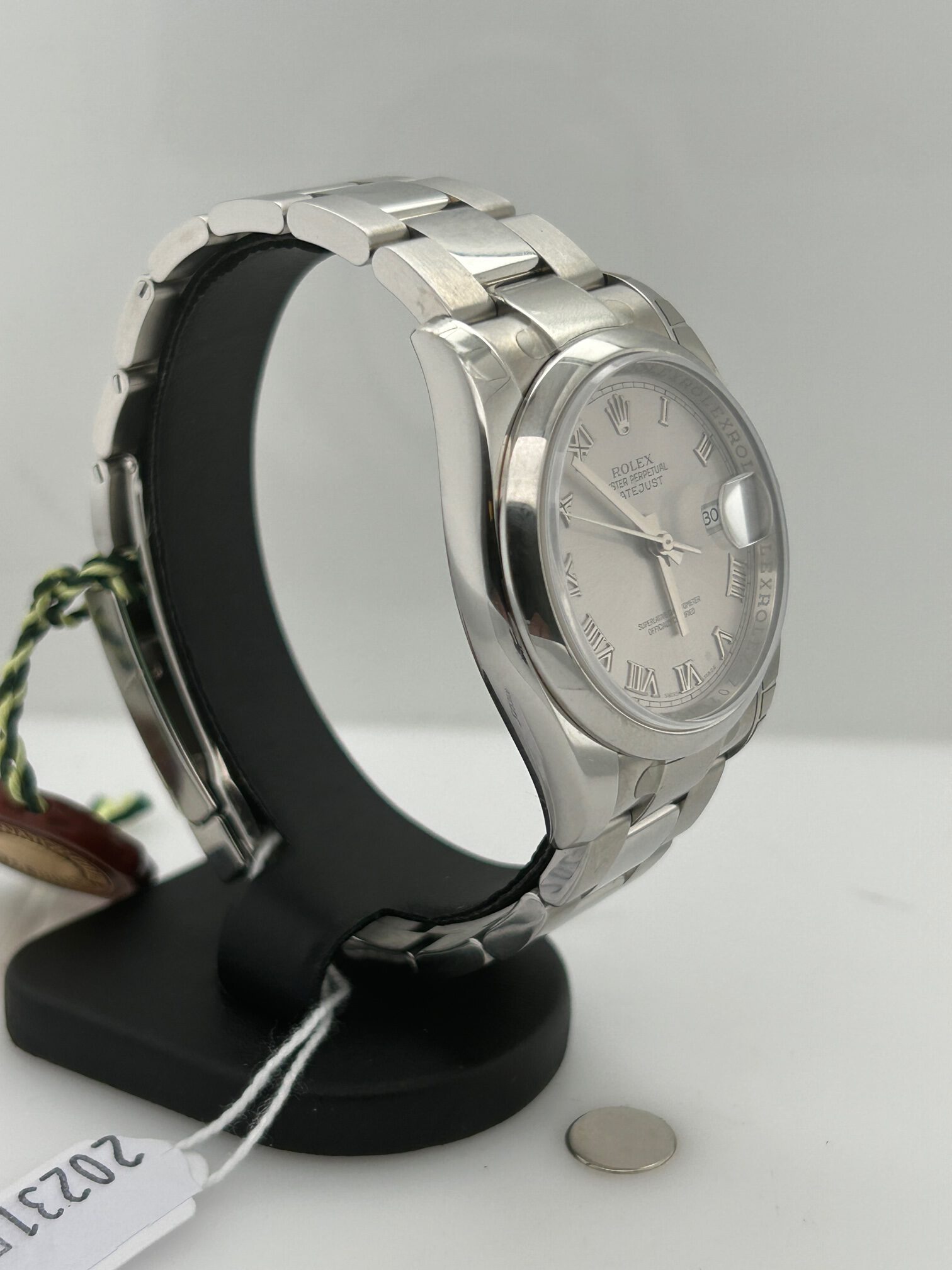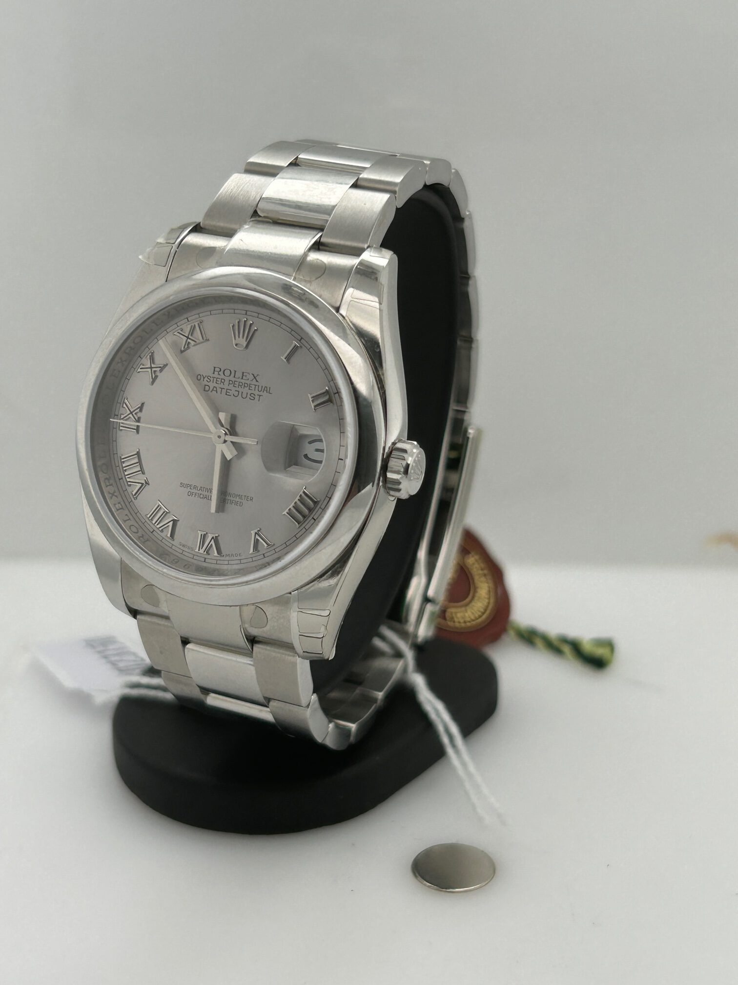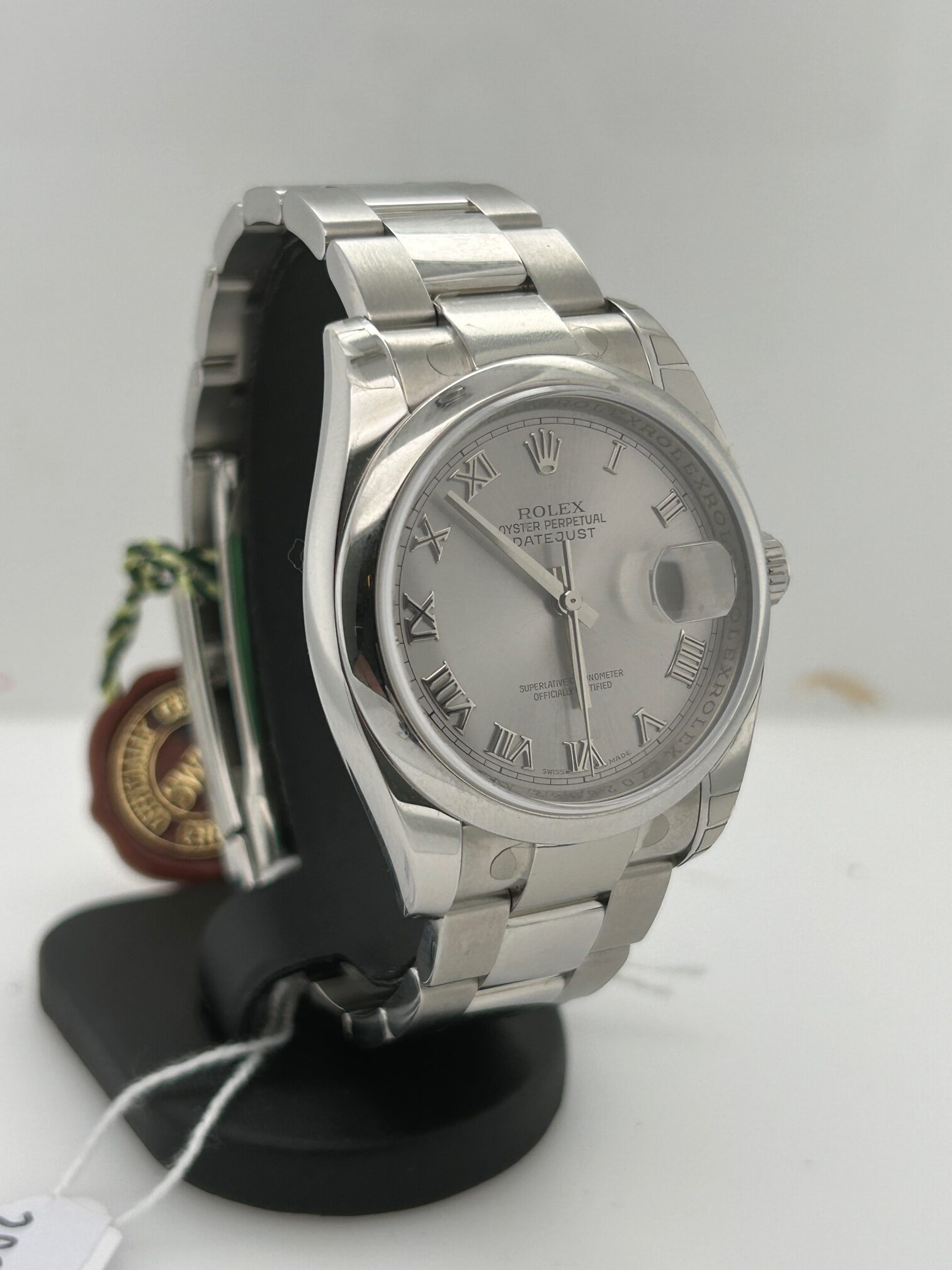 Rolex Oyster Perpetual Datejust 36 mm ,chronometer in staal .oyster bracelet ,silver dial met Roemeense cijfersrs ,mechanisch gangwerk met automatische opwinding ,direct verspringende datum met snelle instelling ,paramagnetische blauwe parachroom -spiraalveer .Met certificaat 2006 en doos voor de prijs van 7.000,00 euro