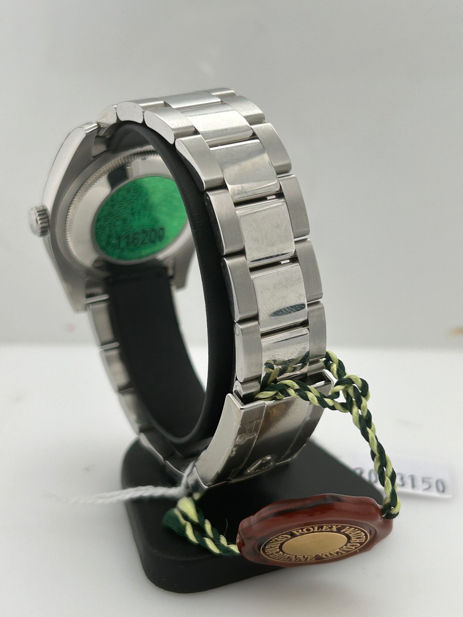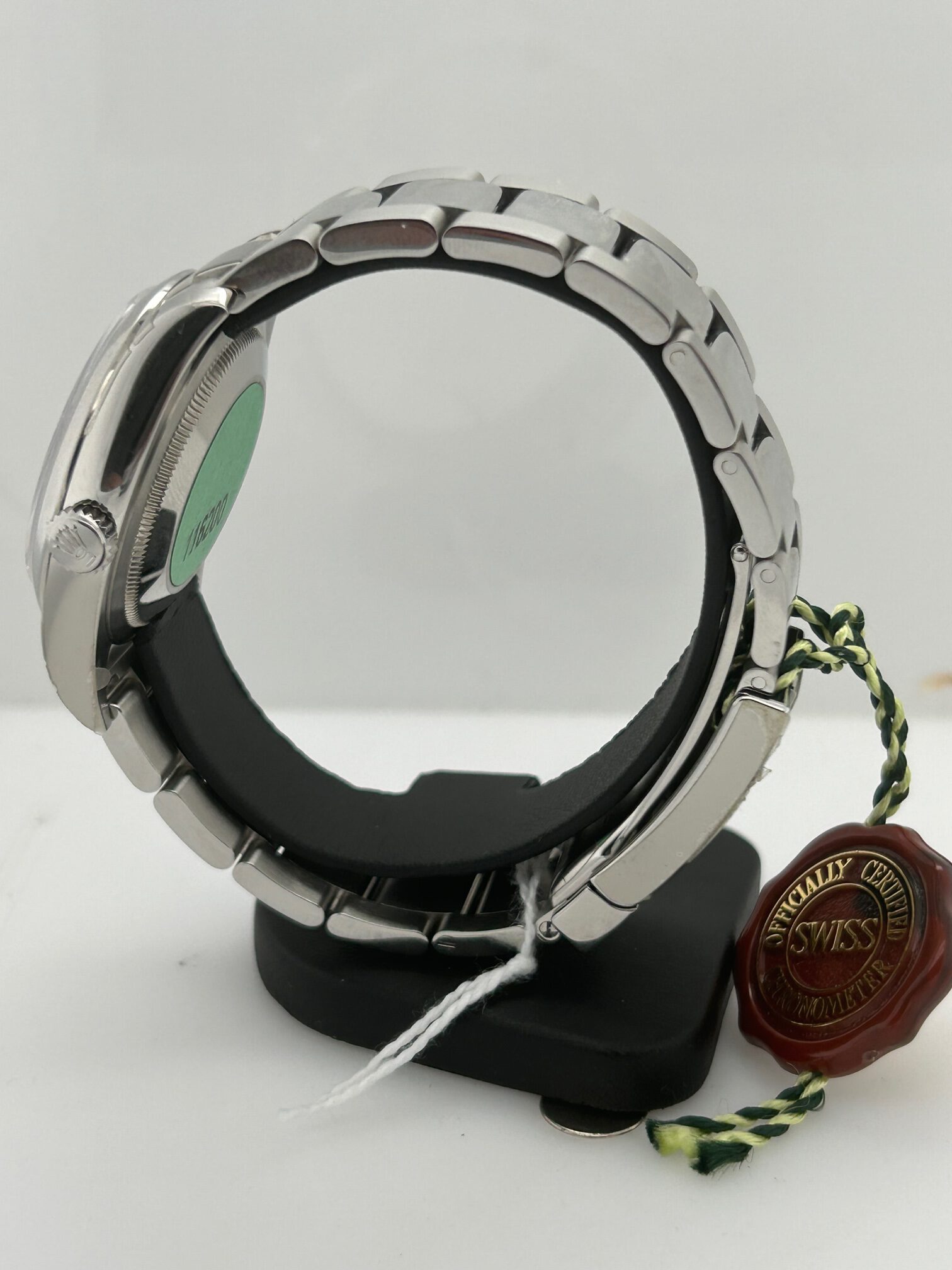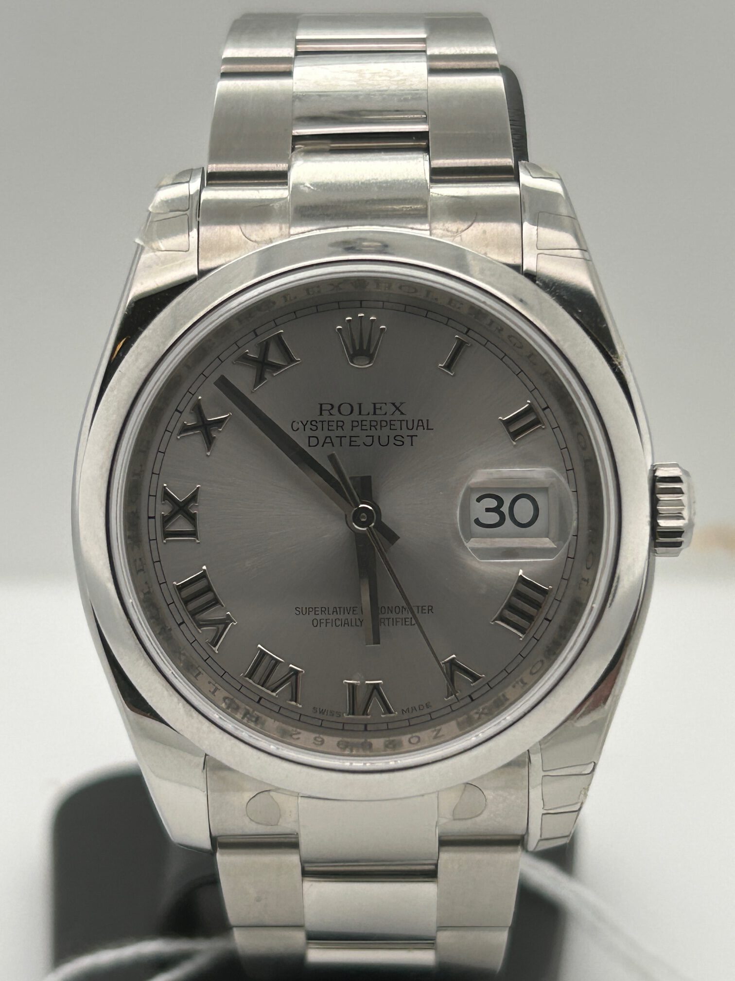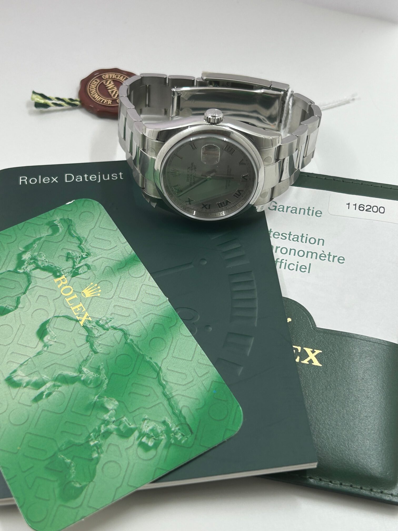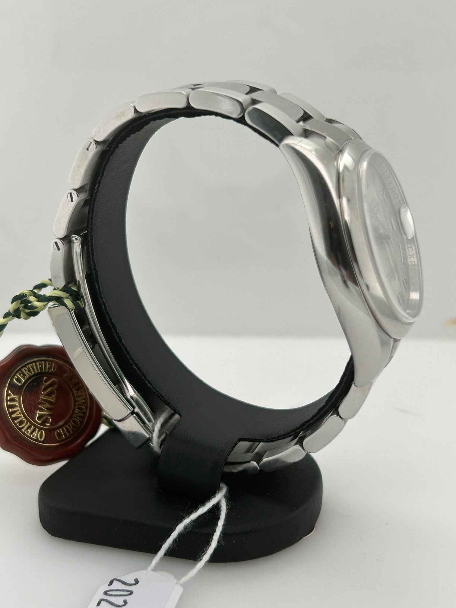 Rolex Oyster Perpetual Datejust 36 mm ,chronometer in staal .oyster bracelet ,silver dial met Roemeense cijfersrs ,mechanisch gangwerk met automatische opwinding ,direct verspringende datum met snelle instelling ,paramagnetische blauwe parachroom -spiraalveer .Met certificaat 2006 en doos voor de prijs van 7.000,00 euro