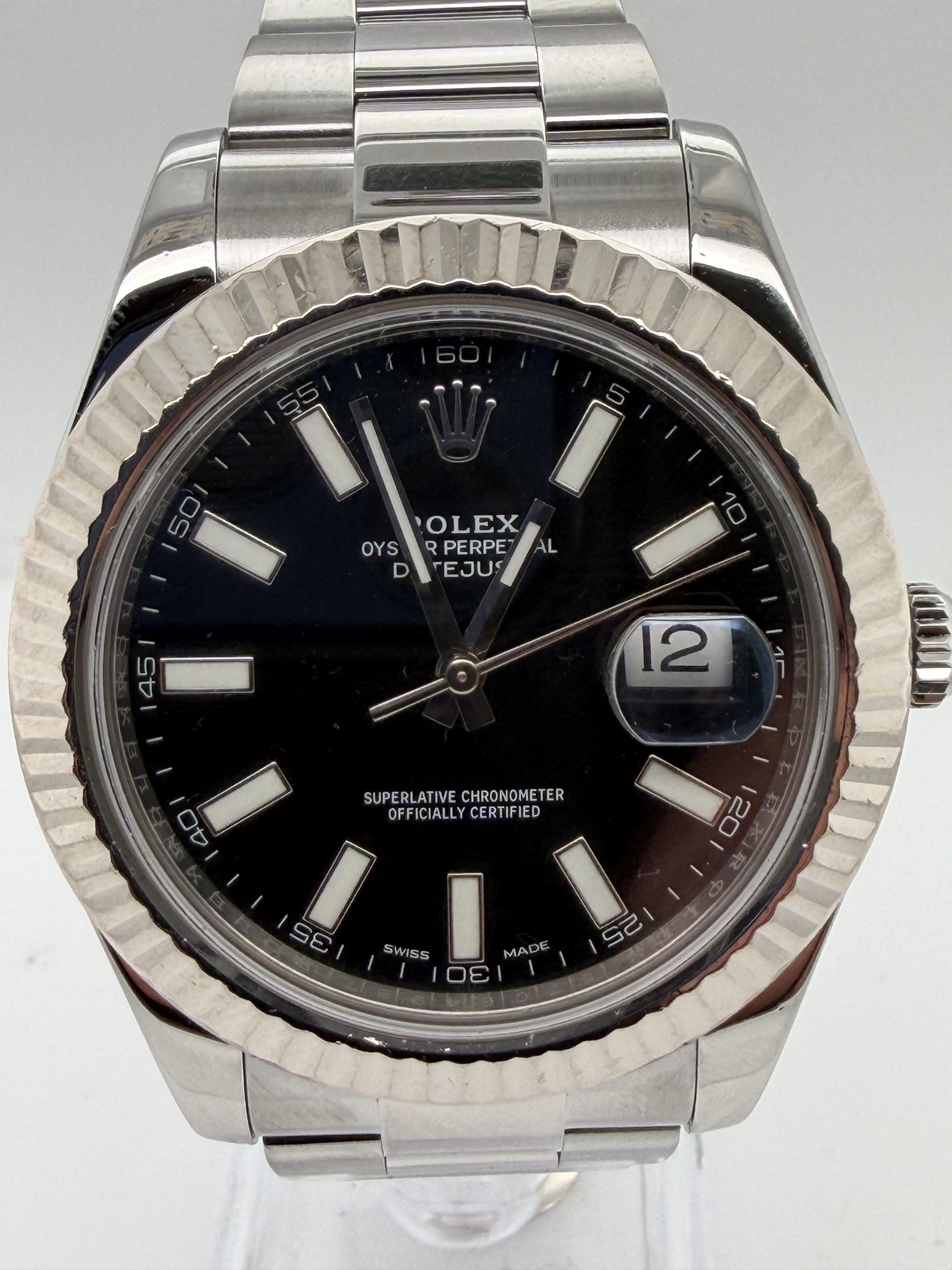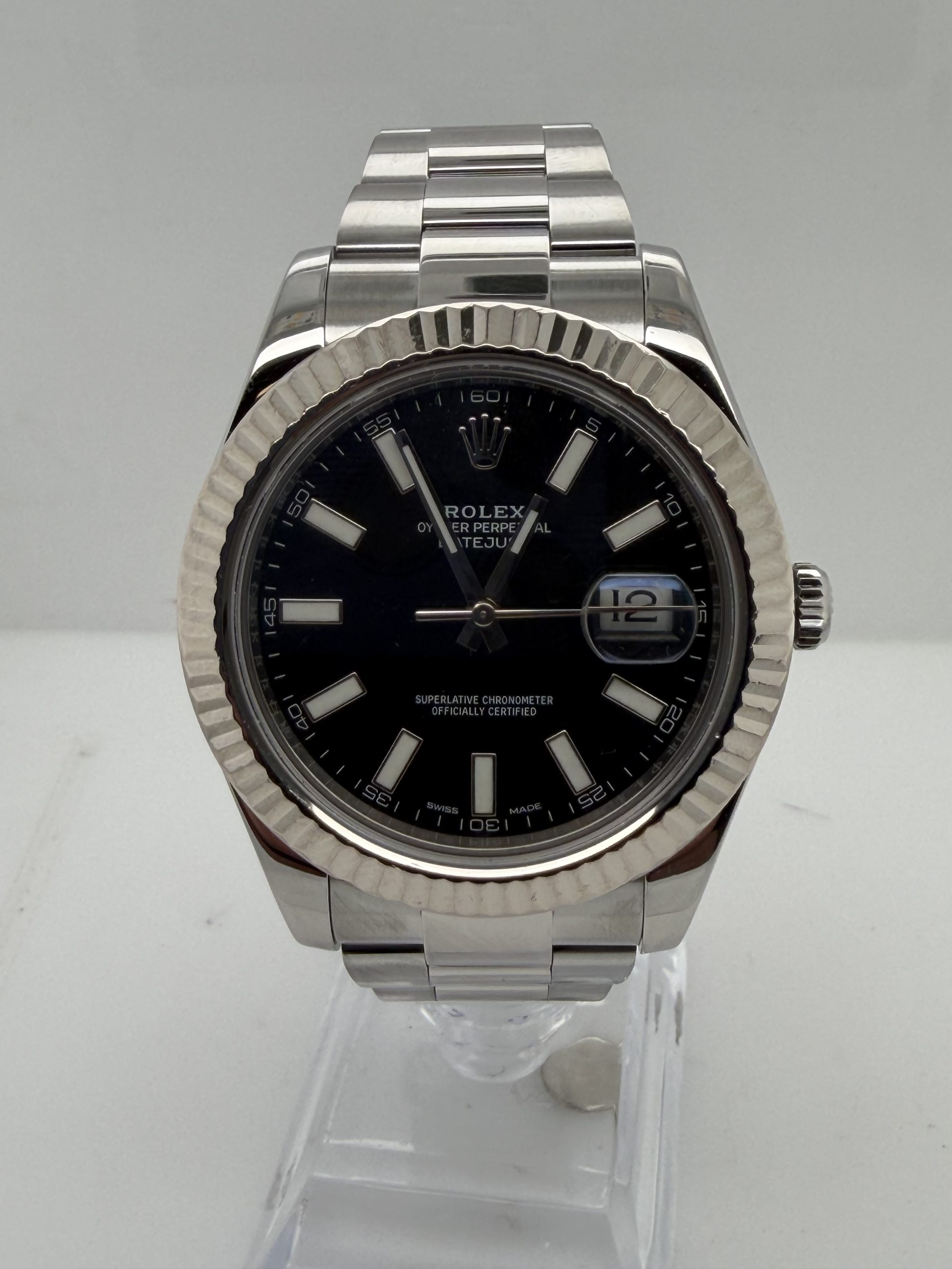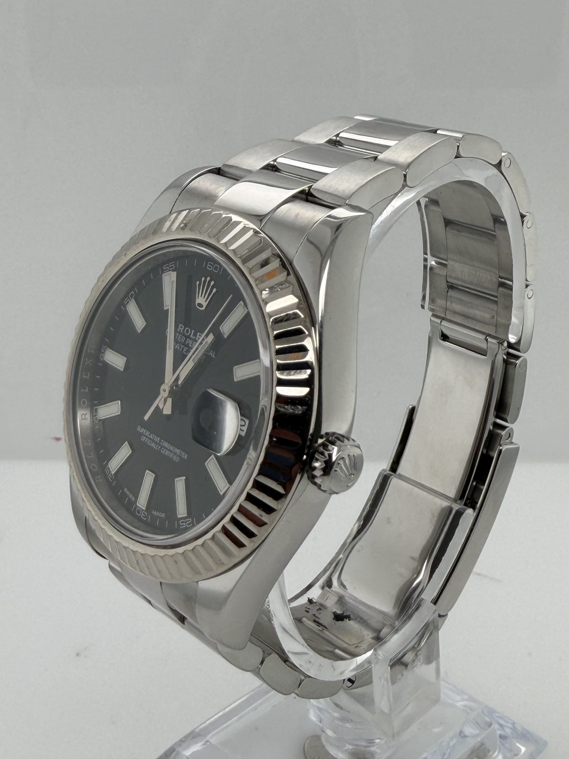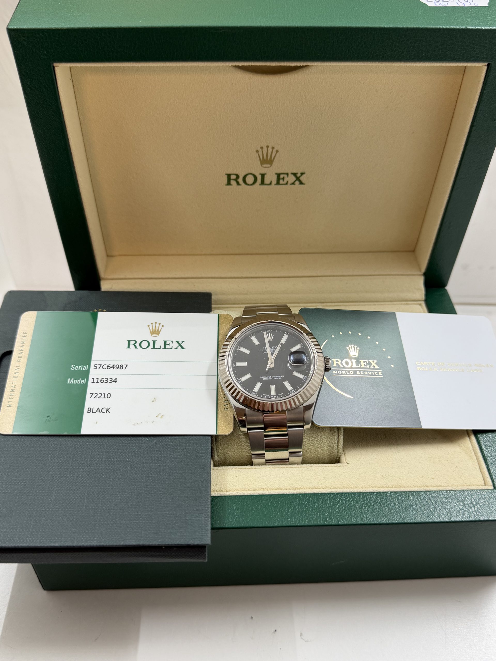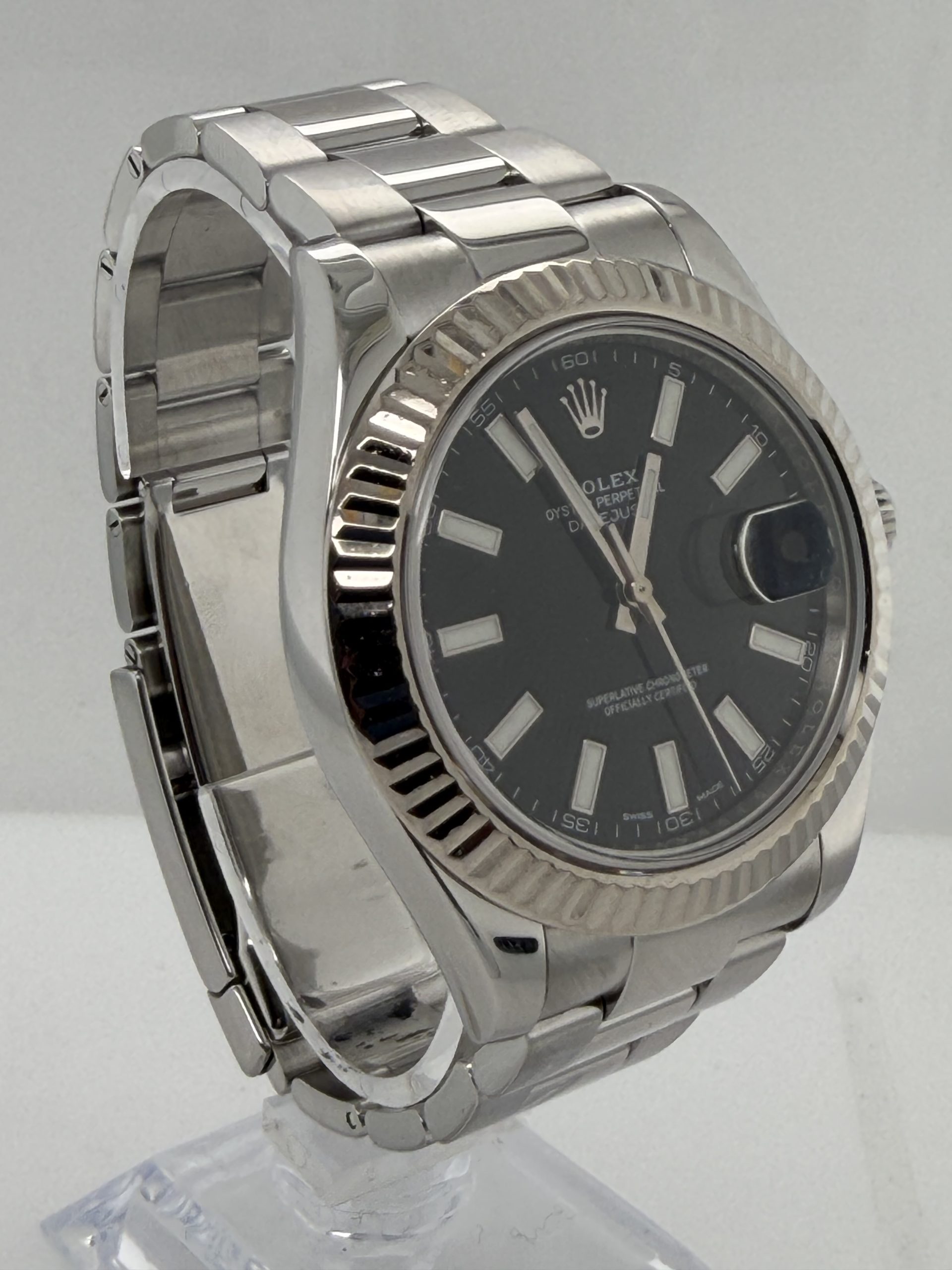 De Rolex Datejust II met referentie 116334 deze versie met de zwarte wijzerplaat geeft het horloge een meer sportieve en krachtige uitstraling , de roestvrijstalen kast is 41 mm en heeft een 18 karaat witgouden lunette , saffierglas met cyclops datumvergroting ,wijzers en streep indexen met lichtgevend materiaal (super luminova) automatisch uurwerk met Rolex kaliber 3136 met een gangreserve van circa ~48-50 uur , dit horloge is bekend om zijn betrouwbaarheid, precisie en duurzaamheid compleet met doos en certificaat en servicekaart voor de prijs van € 9306