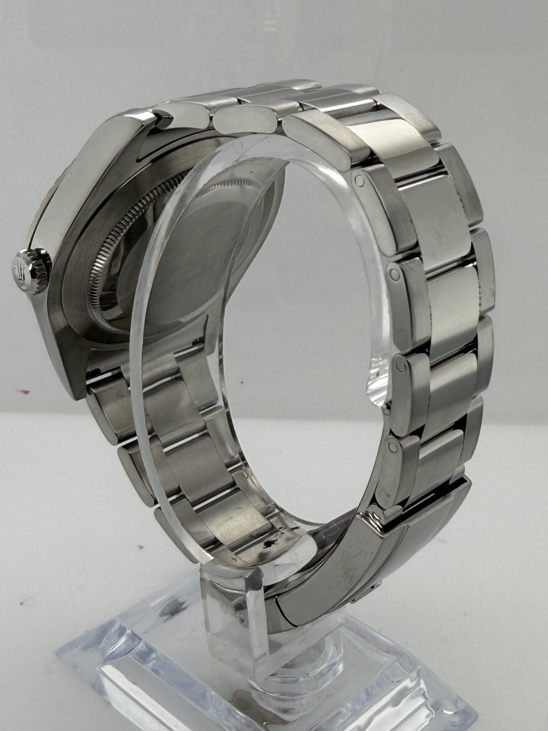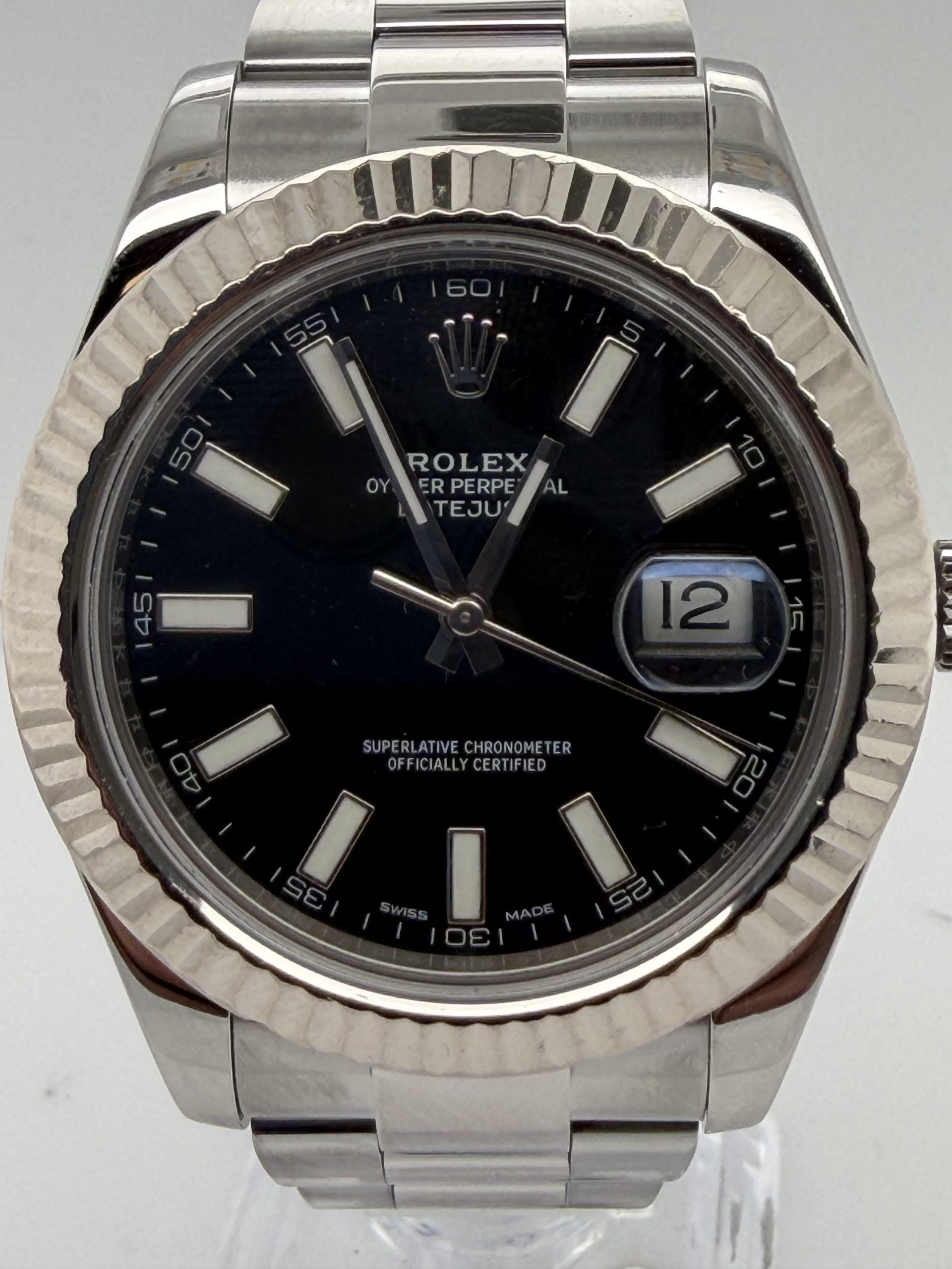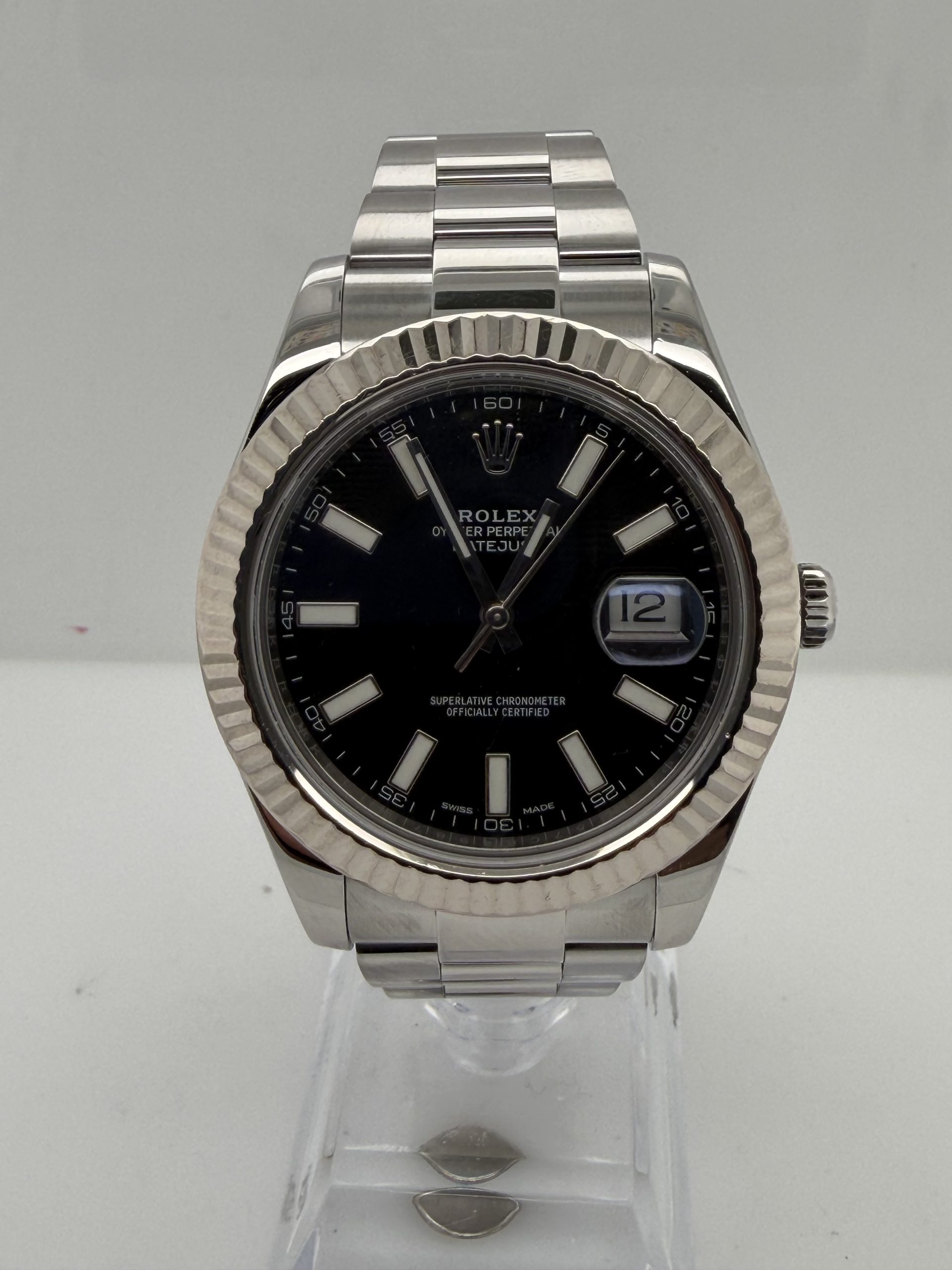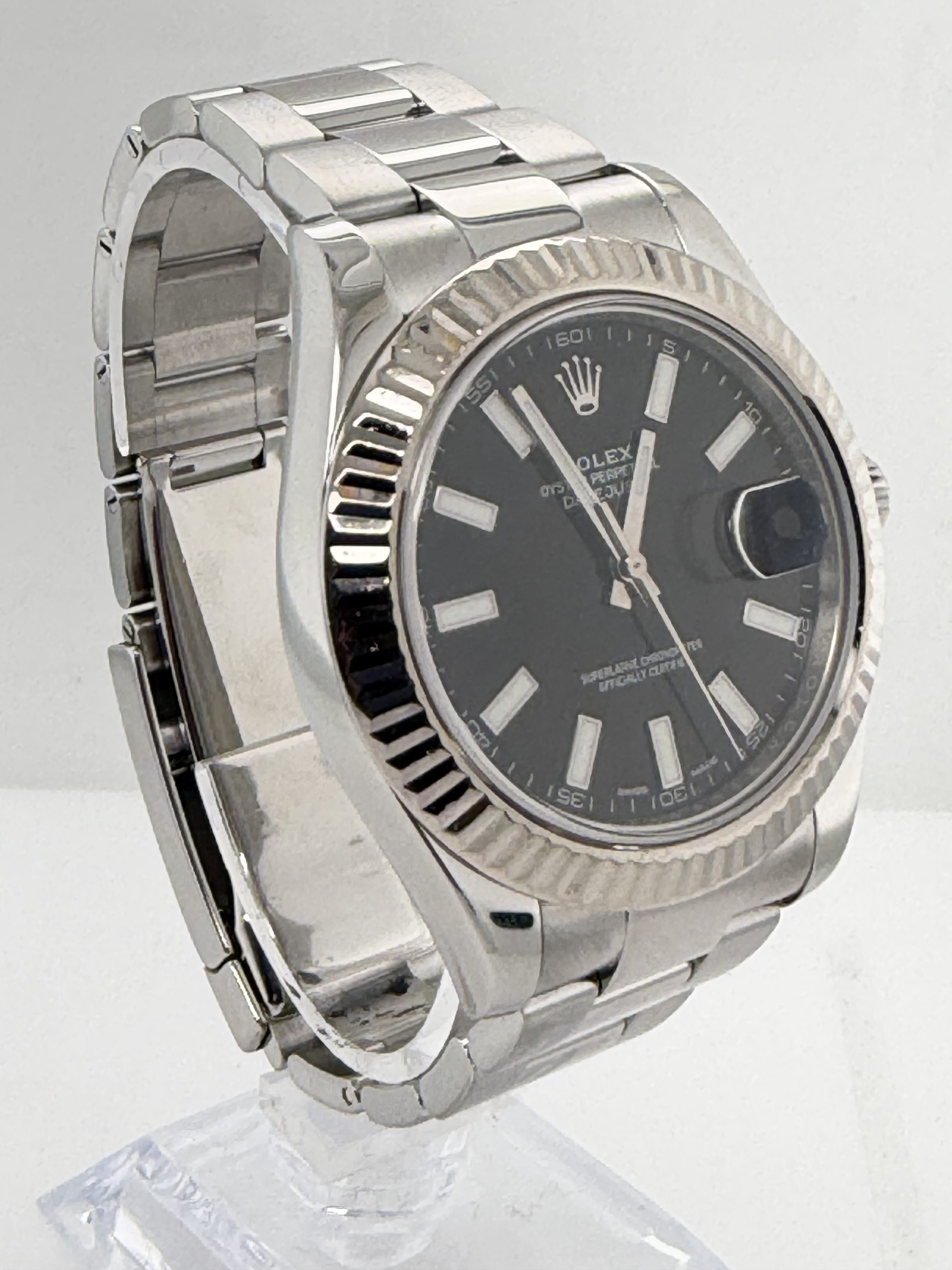 De Rolex Datejust II met referentie 116334 deze versie met de zwarte wijzerplaat geeft het horloge een meer sportieve en krachtige uitstraling , de roestvrijstalen kast is 41 mm en heeft een 18 karaat witgouden lunette , saffierglas met cyclops datumvergroting ,wijzers en streep indexen met lichtgevend materiaal (super luminova) automatisch uurwerk met Rolex kaliber 3136 met een gangreserve van circa ~48-50 uur , dit horloge is bekend om zijn betrouwbaarheid, precisie en duurzaamheid compleet met doos en certificaat en servicekaart voor de prijs van € 9306