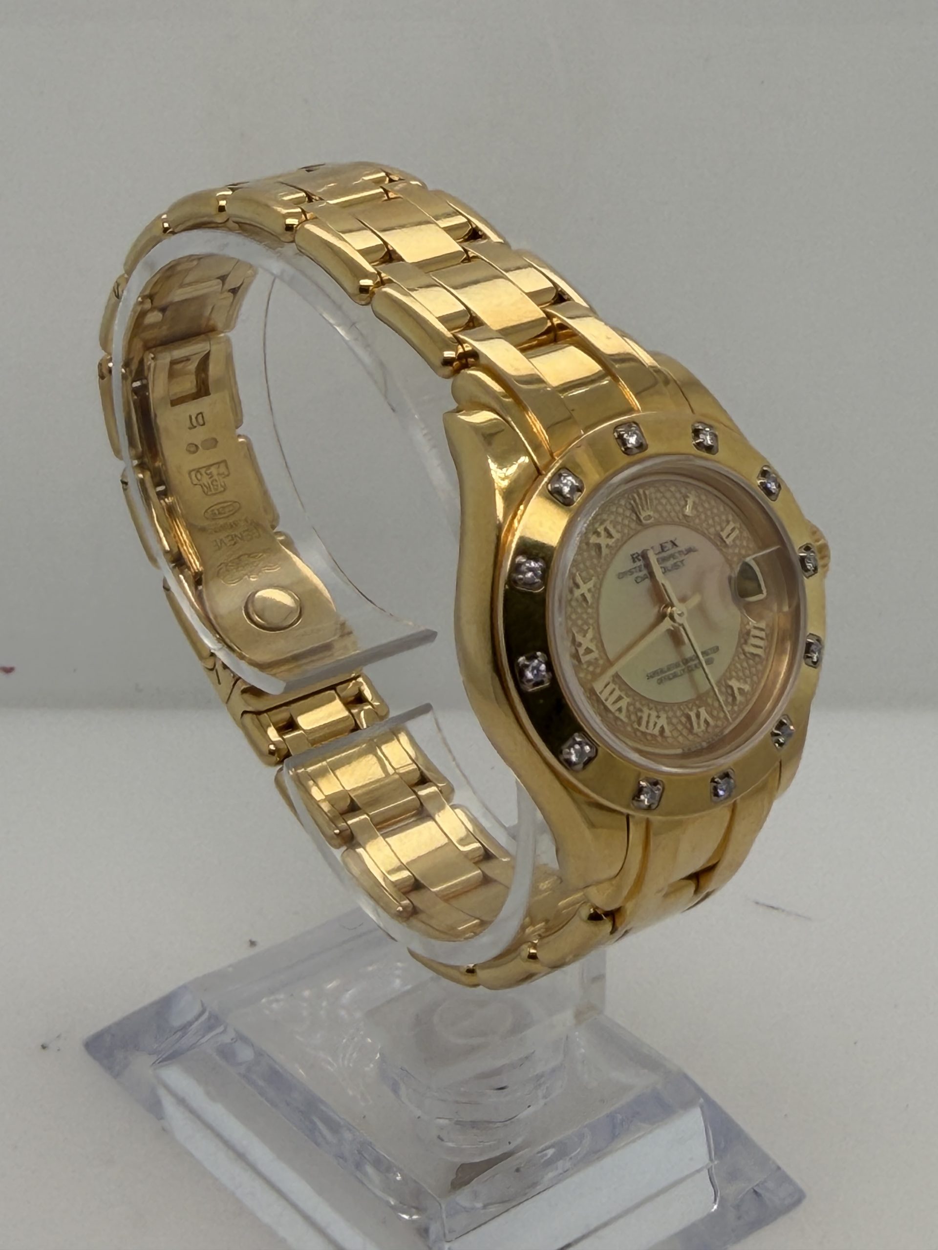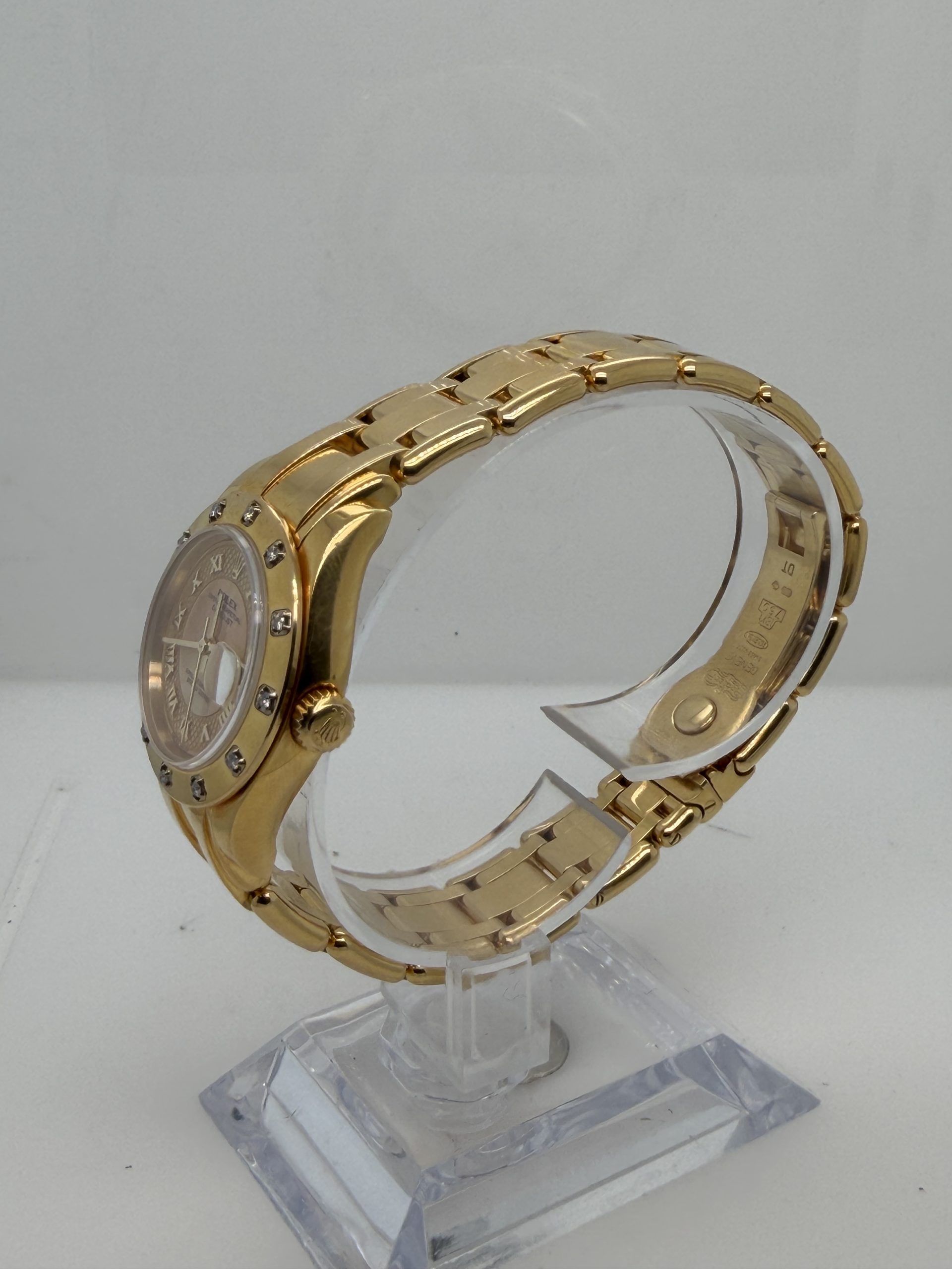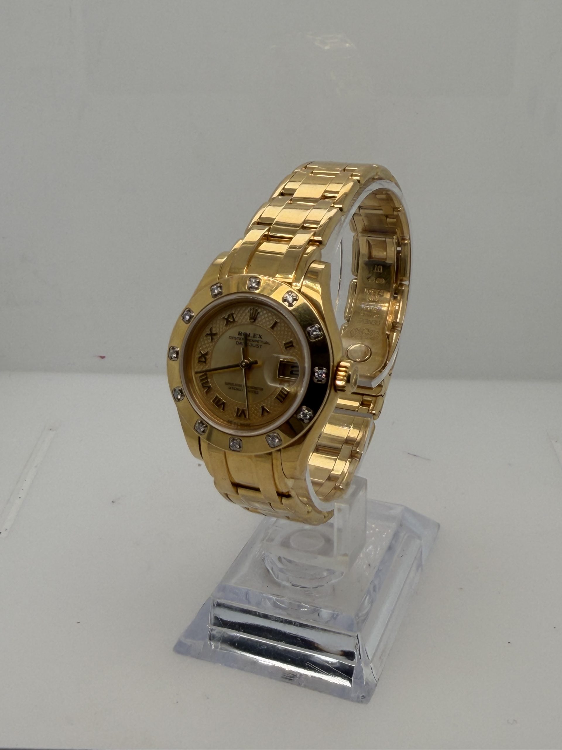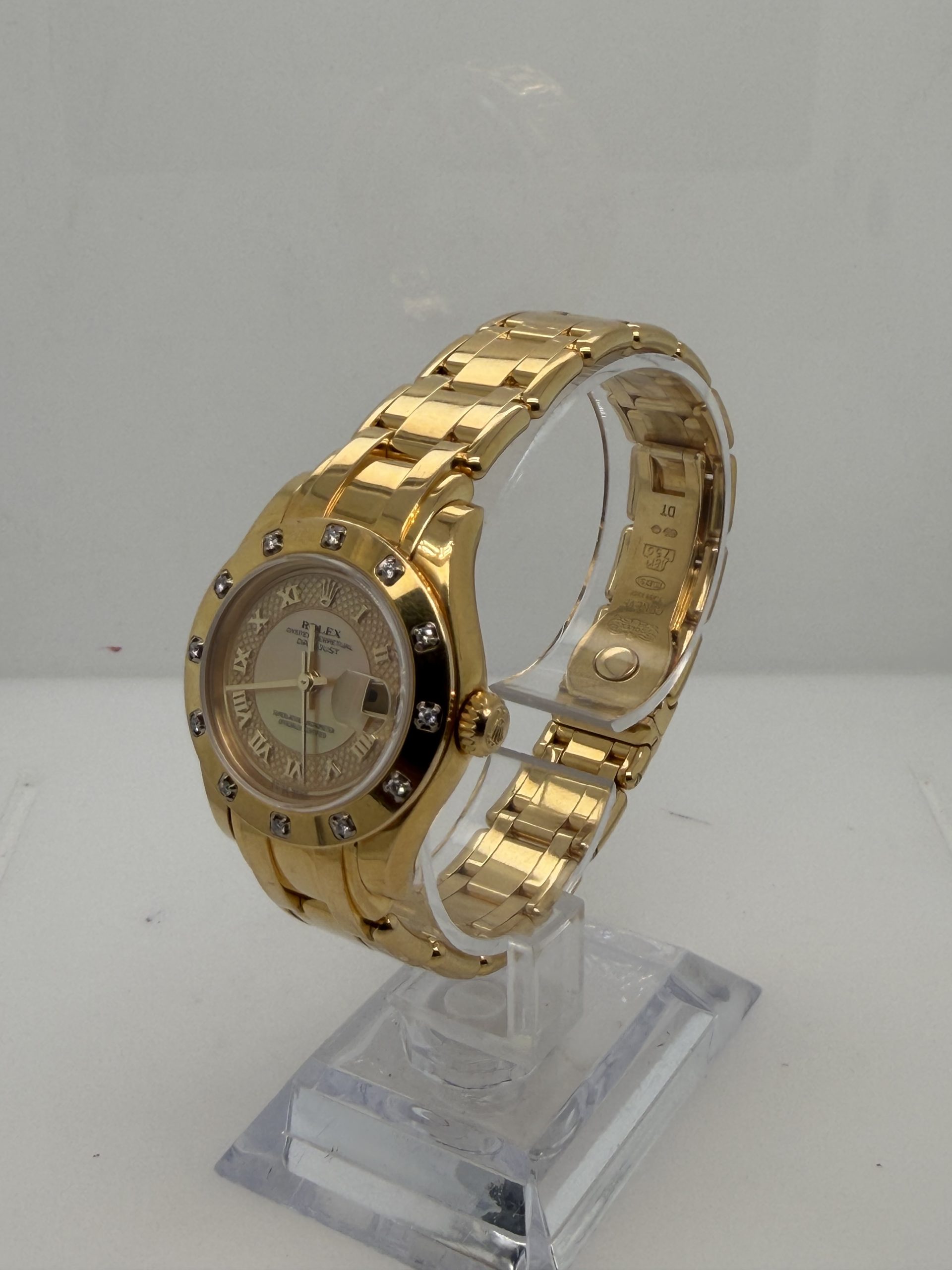 ROLEX Lady Datejust PEARLMASTER met als referentie 80318 , heeft een 18 karaat geelgouden kast van 29 mm , automatisch uurwerk kaliber 2235, speciale champagne wijzerplaat ,parelmoer middenstuk,mother of pearl,lunette gezet met factory diamonds, 18 kt geelgouden pearlmaster bracelet ,saffierglas, datum (date window) typische “Oyster perpetual+date functie” zoals bij de datejust -lijn ,waterbestendig , compleet met doos en booklets ,tags,certificaat 2004, sl 1 eigenaress,nog nooit gepolijst geweest,voor de prijs van 13.999