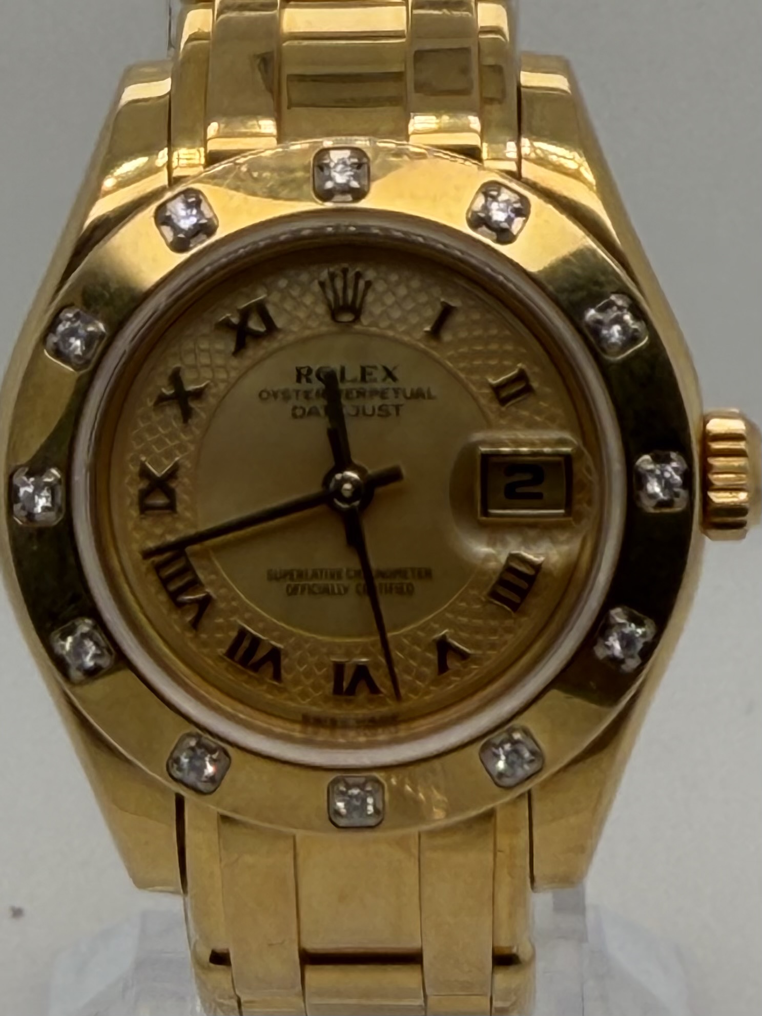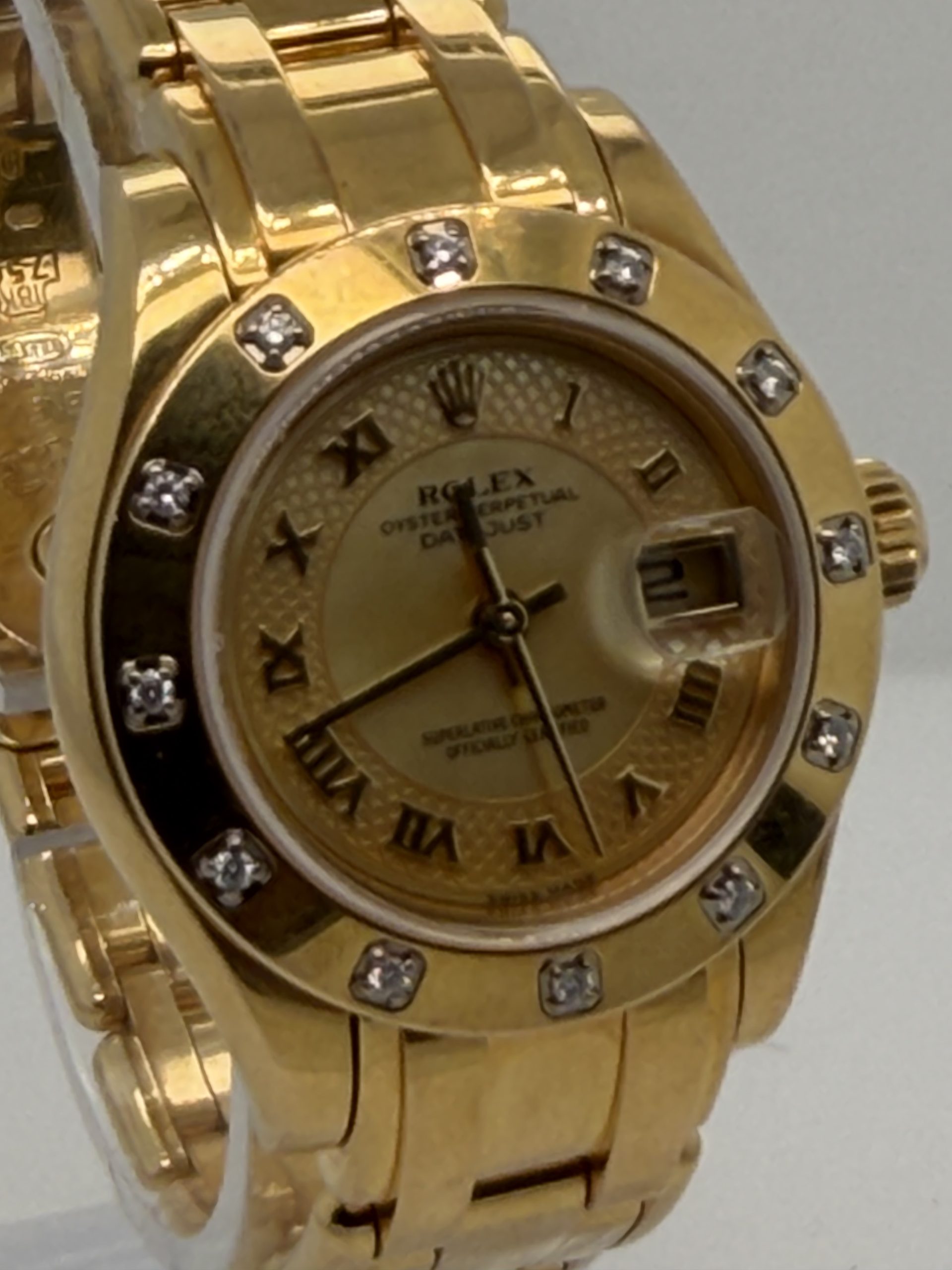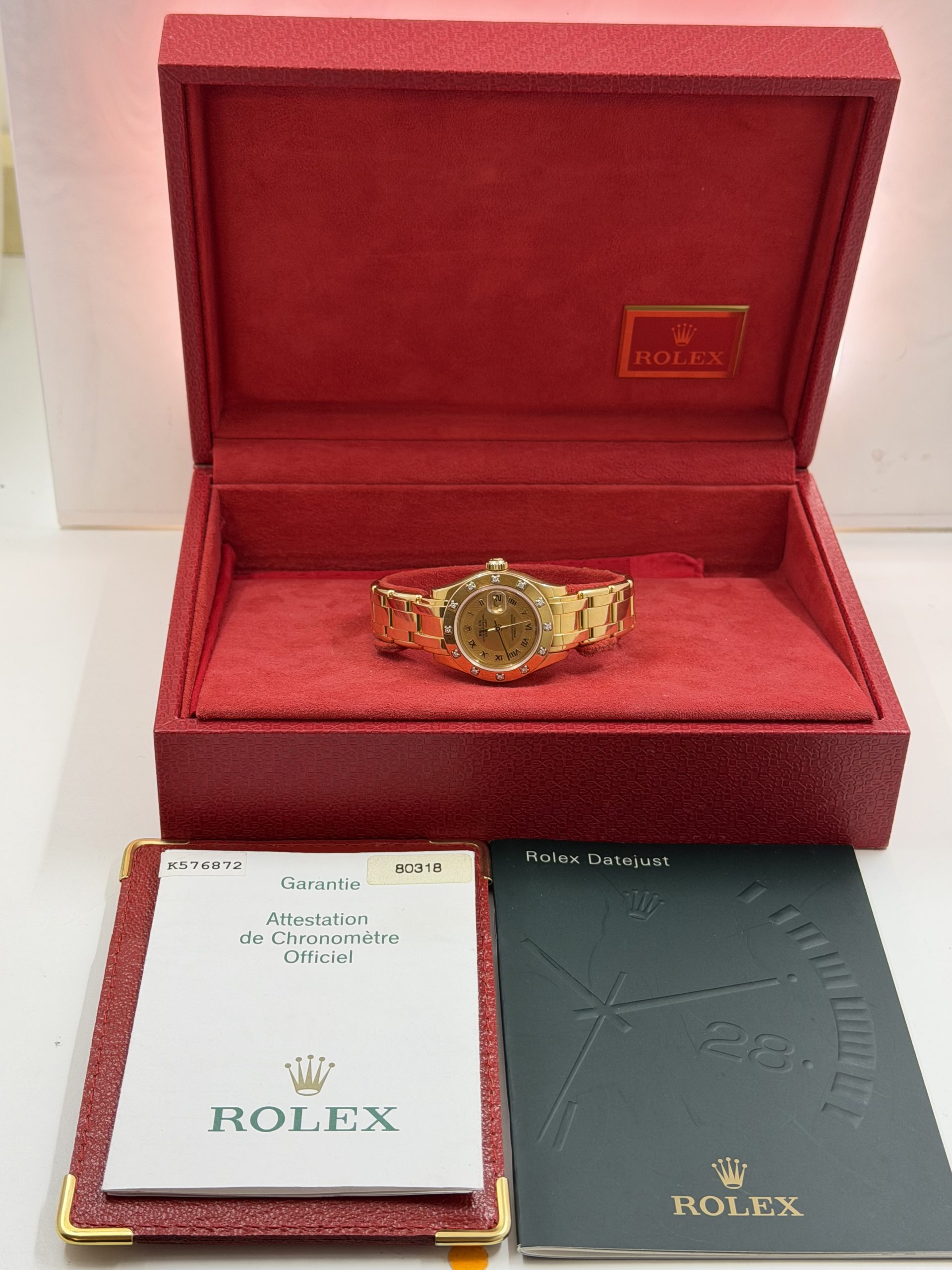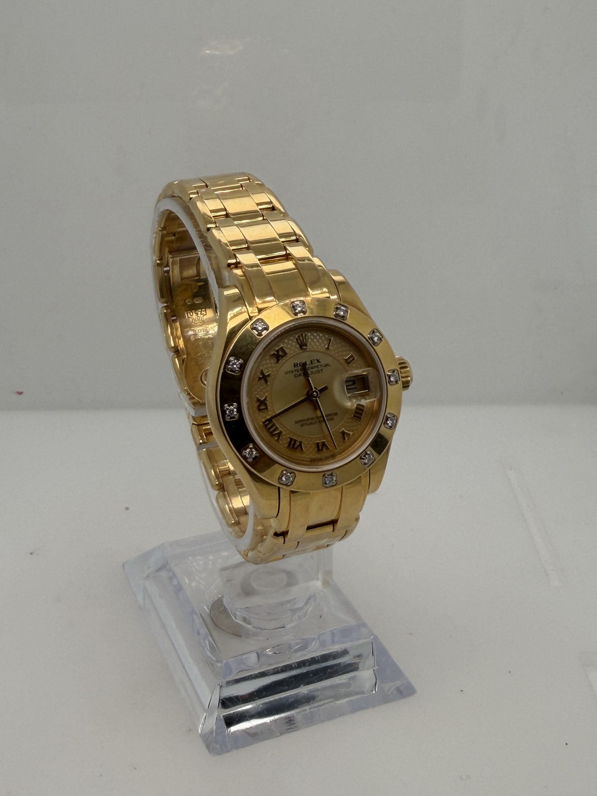 ROLEX Lady Datejust PEARLMASTER met als referentie 80318 , heeft een 18 karaat geelgouden kast van 29 mm , automatisch uurwerk kaliber 2235, speciale champagne wijzerplaat ,parelmoer middenstuk,mother of pearl,lunette gezet met factory diamonds, 18 kt geelgouden pearlmaster bracelet ,saffierglas, datum (date window) typische “Oyster perpetual+date functie” zoals bij de datejust -lijn ,waterbestendig , compleet met doos en booklets ,tags,certificaat 2004, sl 1 eigenaress,nog nooit gepolijst geweest,voor de prijs van 13.999