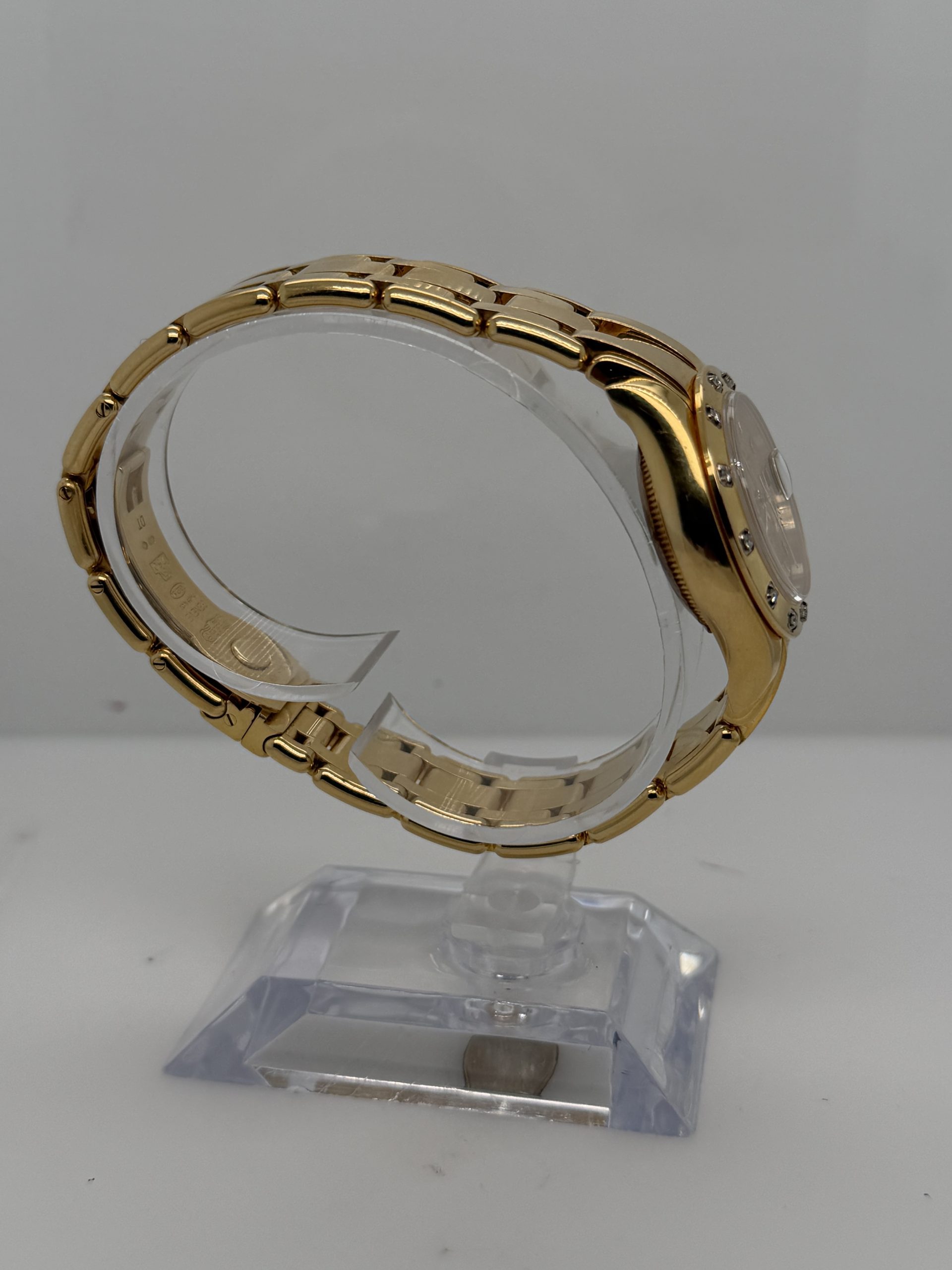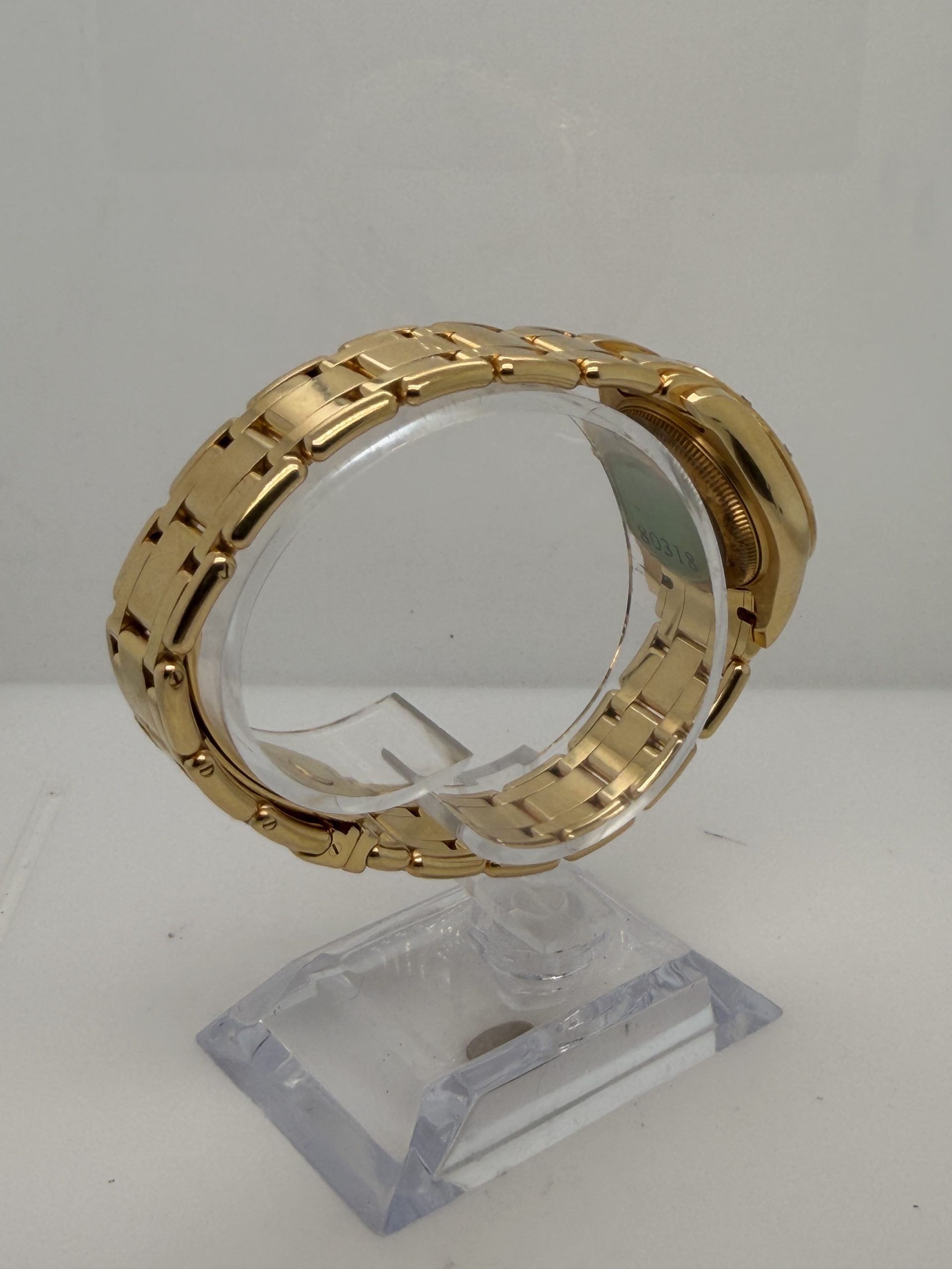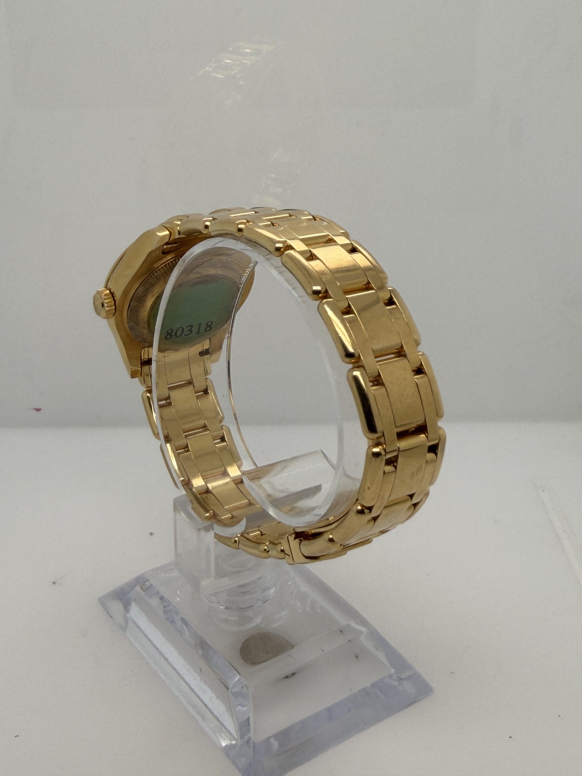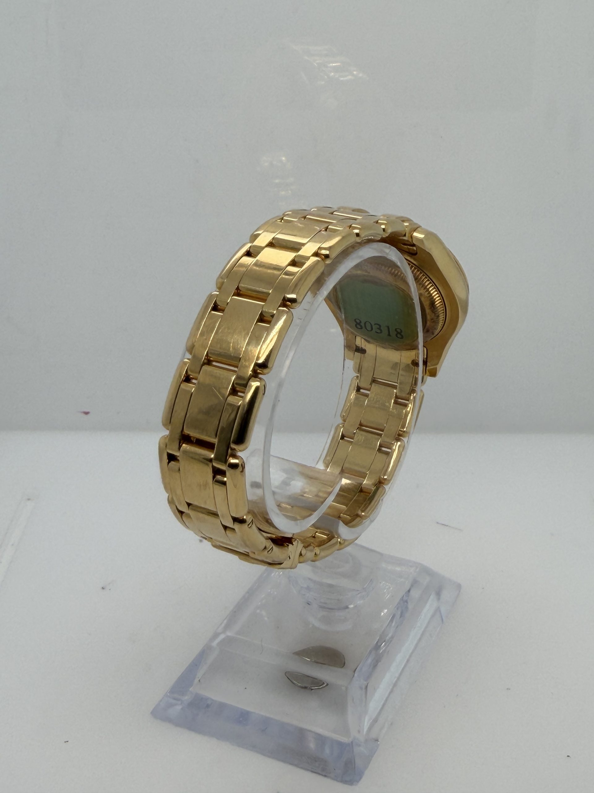 ROLEX Lady Datejust PEARLMASTER met als referentie 80318 , heeft een 18 karaat geelgouden kast van 29 mm , automatisch uurwerk kaliber 2235, speciale champagne wijzerplaat ,parelmoer middenstuk,mother of pearl,lunette gezet met factory diamonds, 18 kt geelgouden pearlmaster bracelet ,saffierglas, datum (date window) typische “Oyster perpetual+date functie” zoals bij de datejust -lijn ,waterbestendig , compleet met doos en booklets ,tags,certificaat 2004, sl 1 eigenaress,nog nooit gepolijst geweest,voor de prijs van 13.999