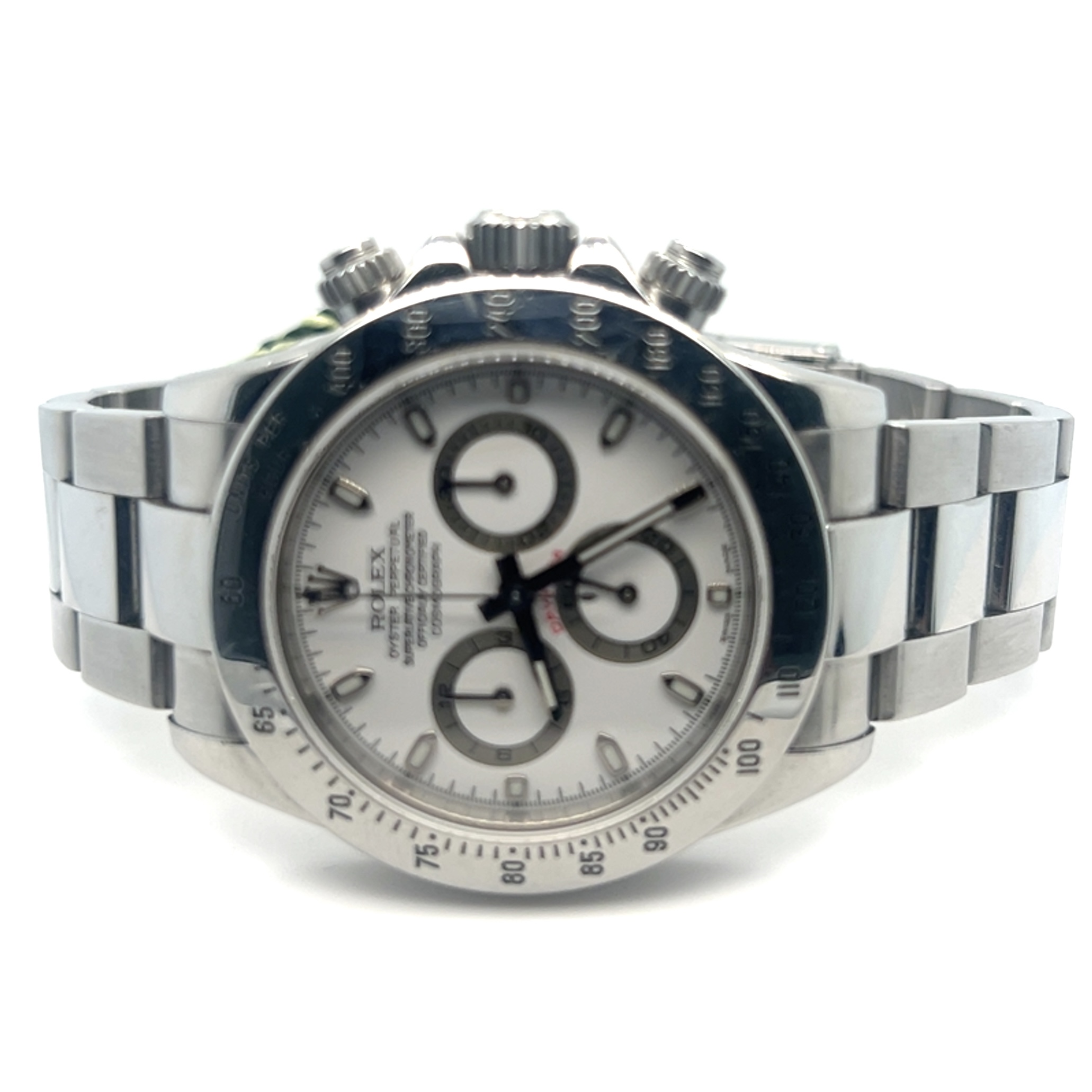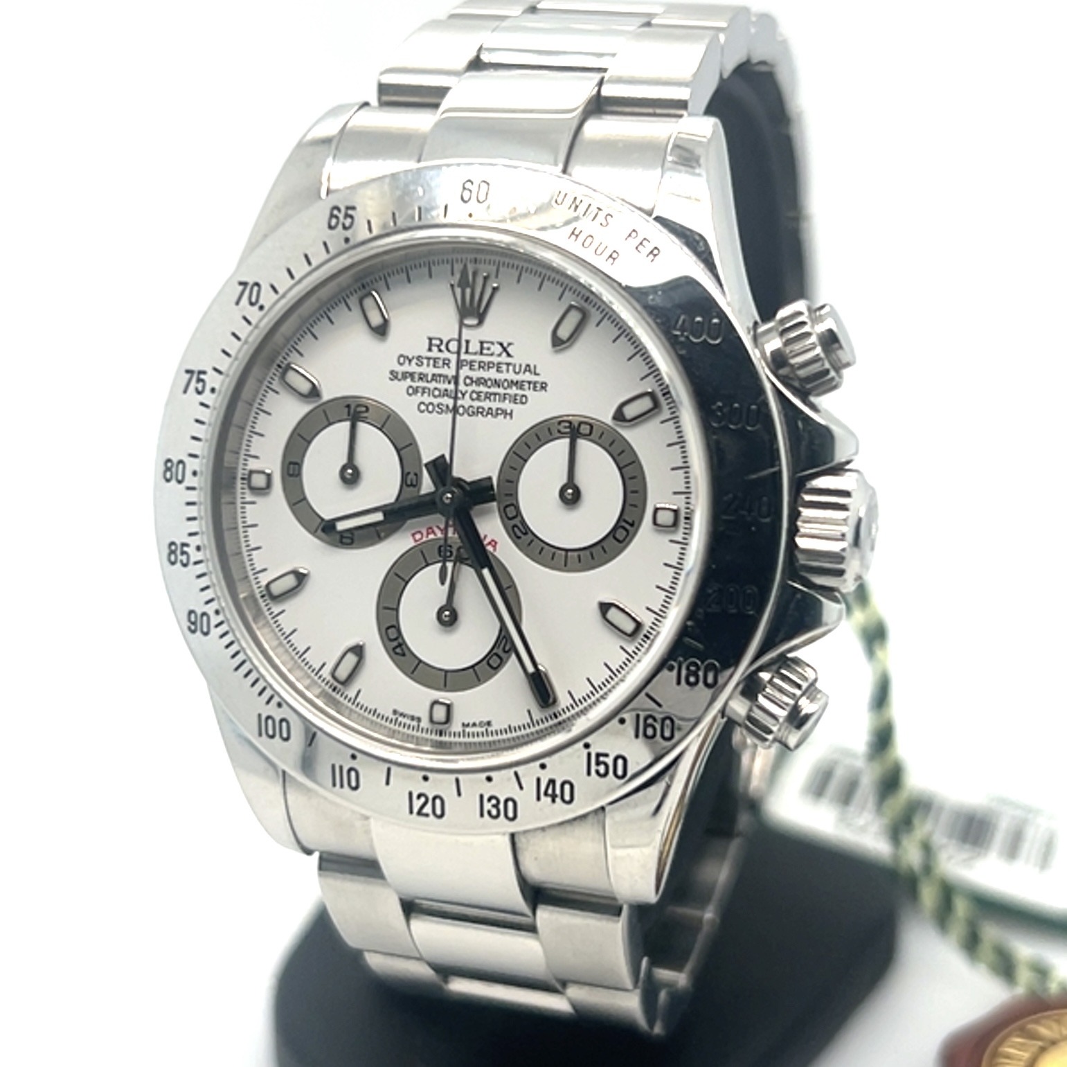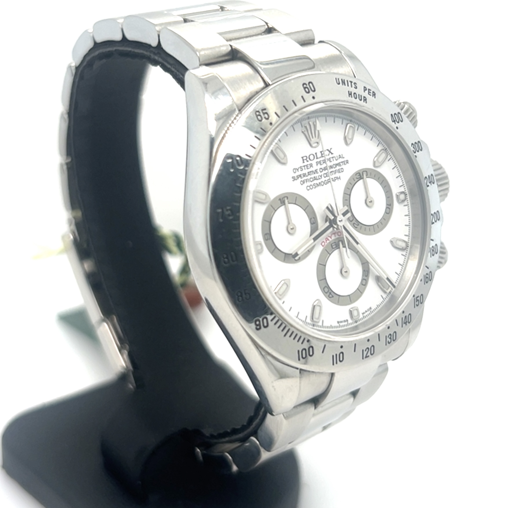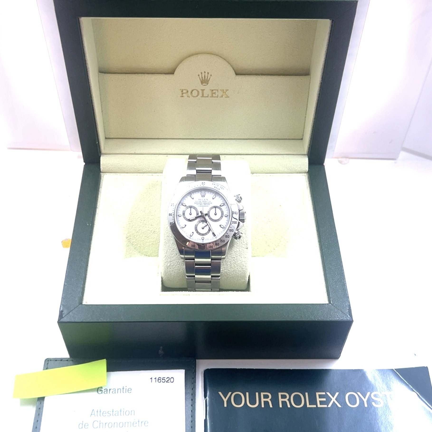 In exceptionele goede staat ROLEX Oyster Perpetual COSMOGRAPH DAYTONA PANDA Super Luminova,chronometer in staalreferentie 116520,saffierglas,automatischeuurwerk,stopwatchfunctie,gegradueerde lunette voor direct aflezen van snelheden per uur, eenheden/uur enz,geschroefde drukknoppen, waterdicht tot 100 m,sl 1 eigenaar, FULL SET,originele doos, originele certificaat,2006,Nederlands geleverd, tags,booklets etc, nog nooit gepolijst,de groene sticker nog geheel op de achterdeksel, wordt u aangeboden met onze factuur en garantie,prijs 21.700 euro
