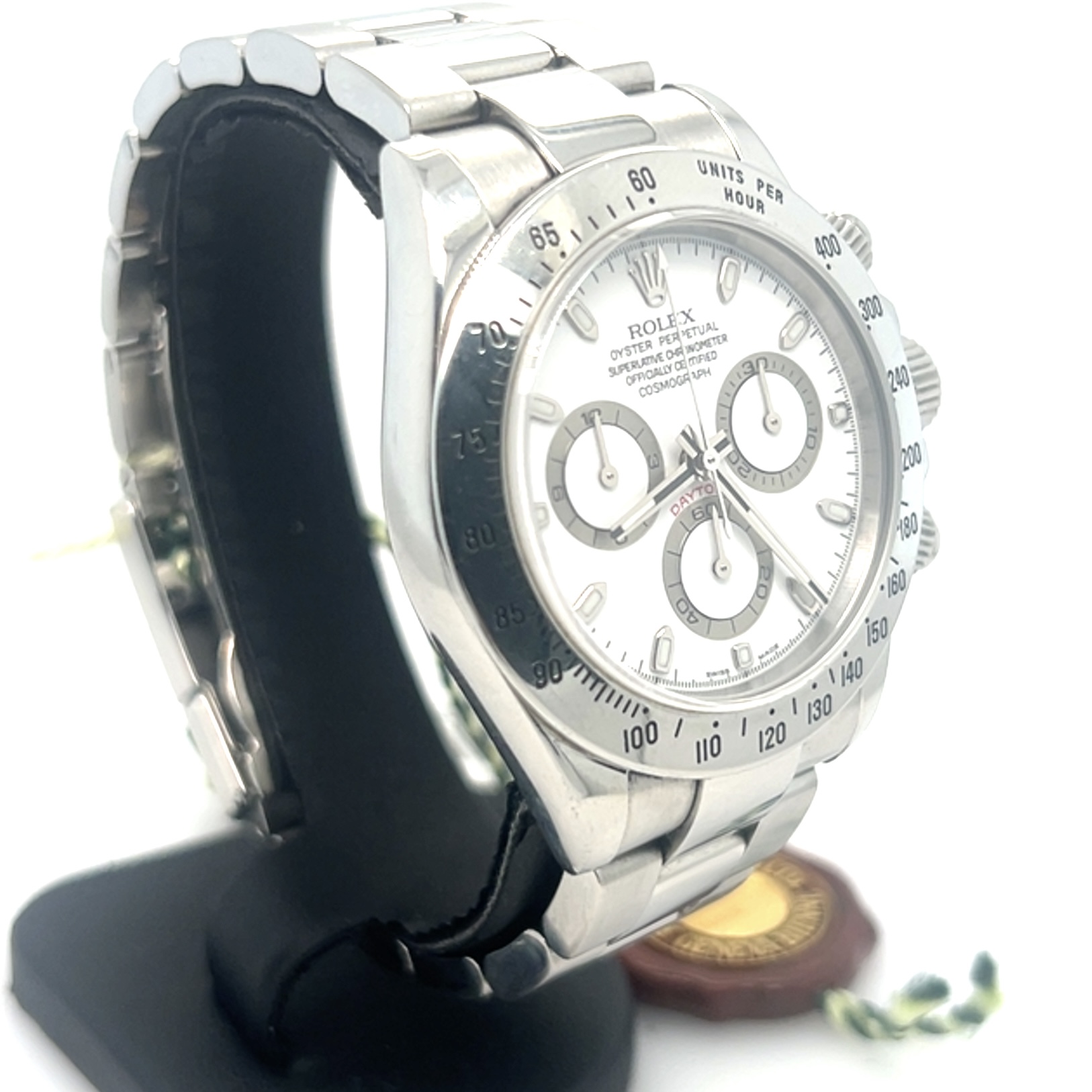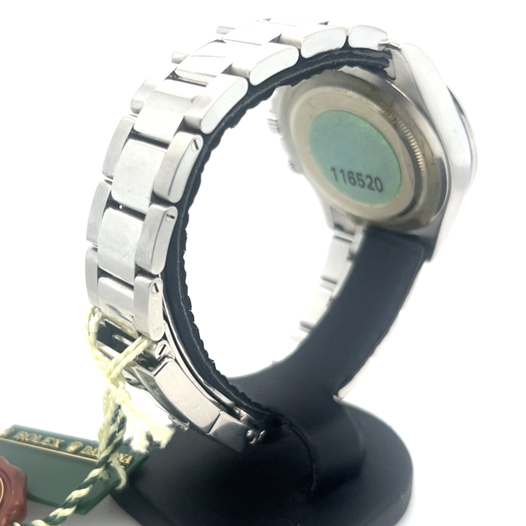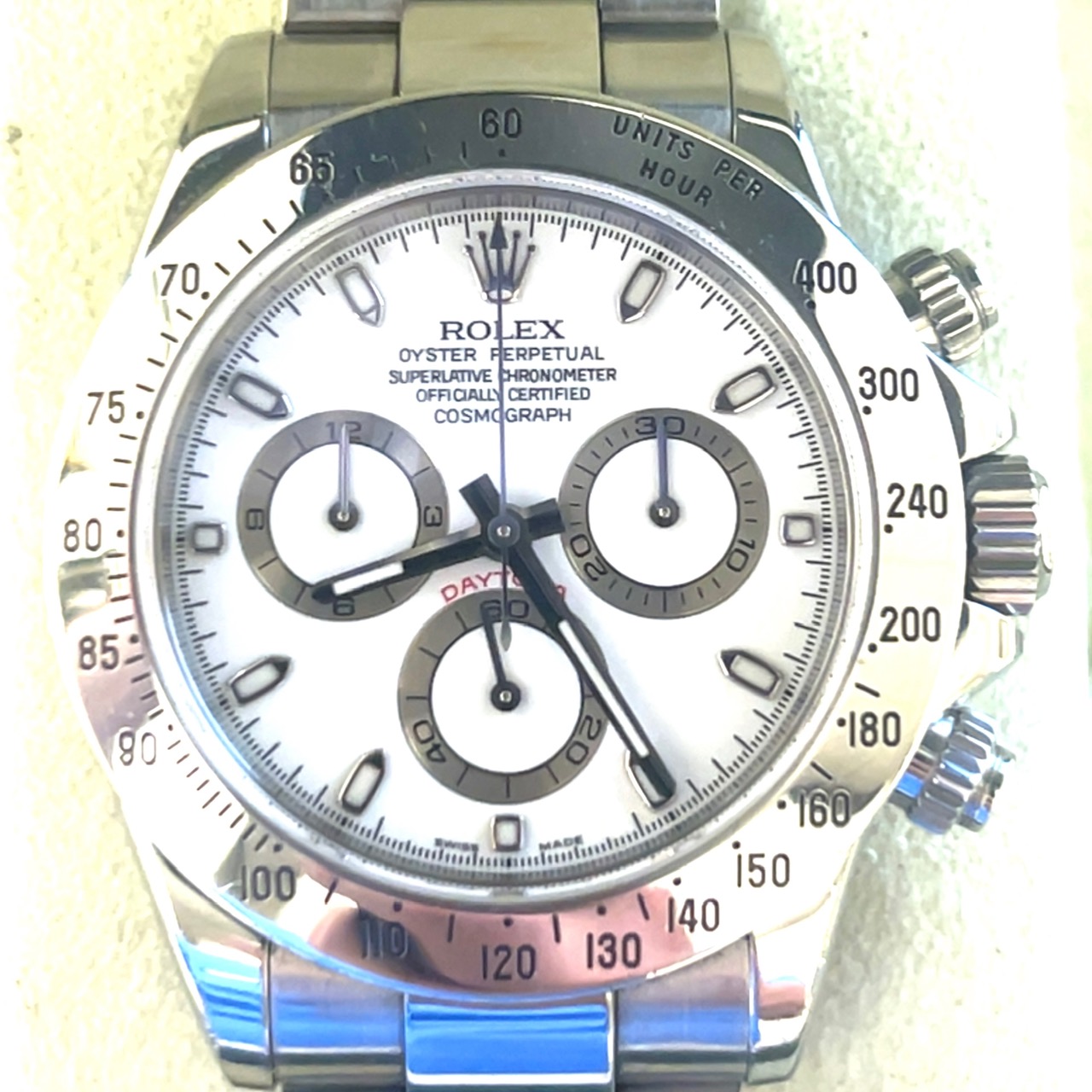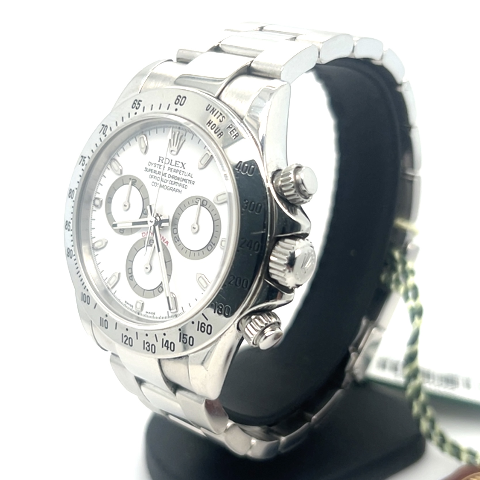 In exceptionele goede staat ROLEX Oyster Perpetual COSMOGRAPH DAYTONA PANDA Super Luminova,chronometer in staalreferentie 116520,saffierglas,automatischeuurwerk,stopwatchfunctie,gegradueerde lunette voor direct aflezen van snelheden per uur, eenheden/uur enz,geschroefde drukknoppen, waterdicht tot 100 m,sl 1 eigenaar, FULL SET,originele doos, originele certificaat,2006,Nederlands geleverd, tags,booklets etc, nog nooit gepolijst,de groene sticker nog geheel op de achterdeksel, wordt u aangeboden met onze factuur en garantie,prijs 21.700 euro