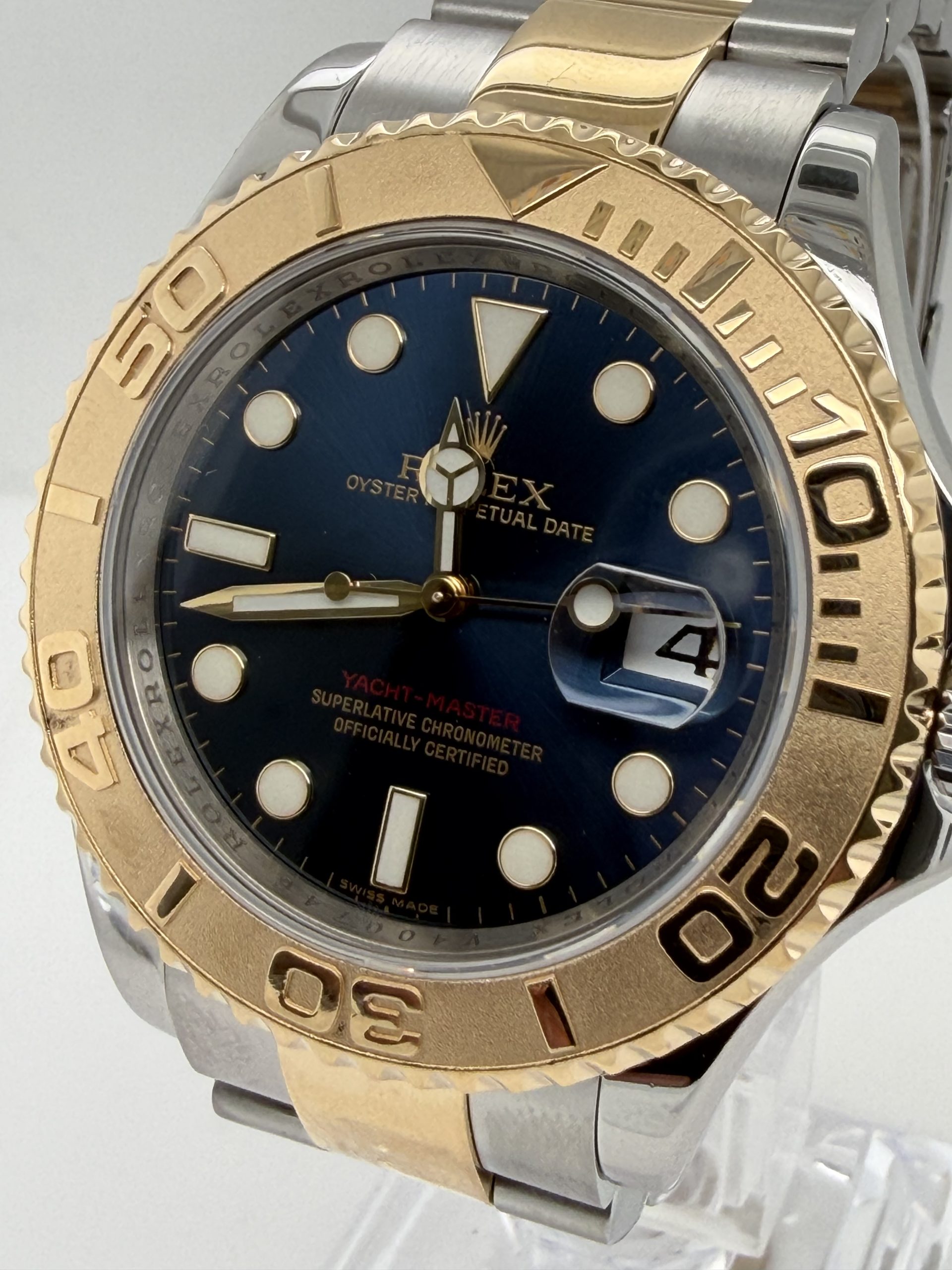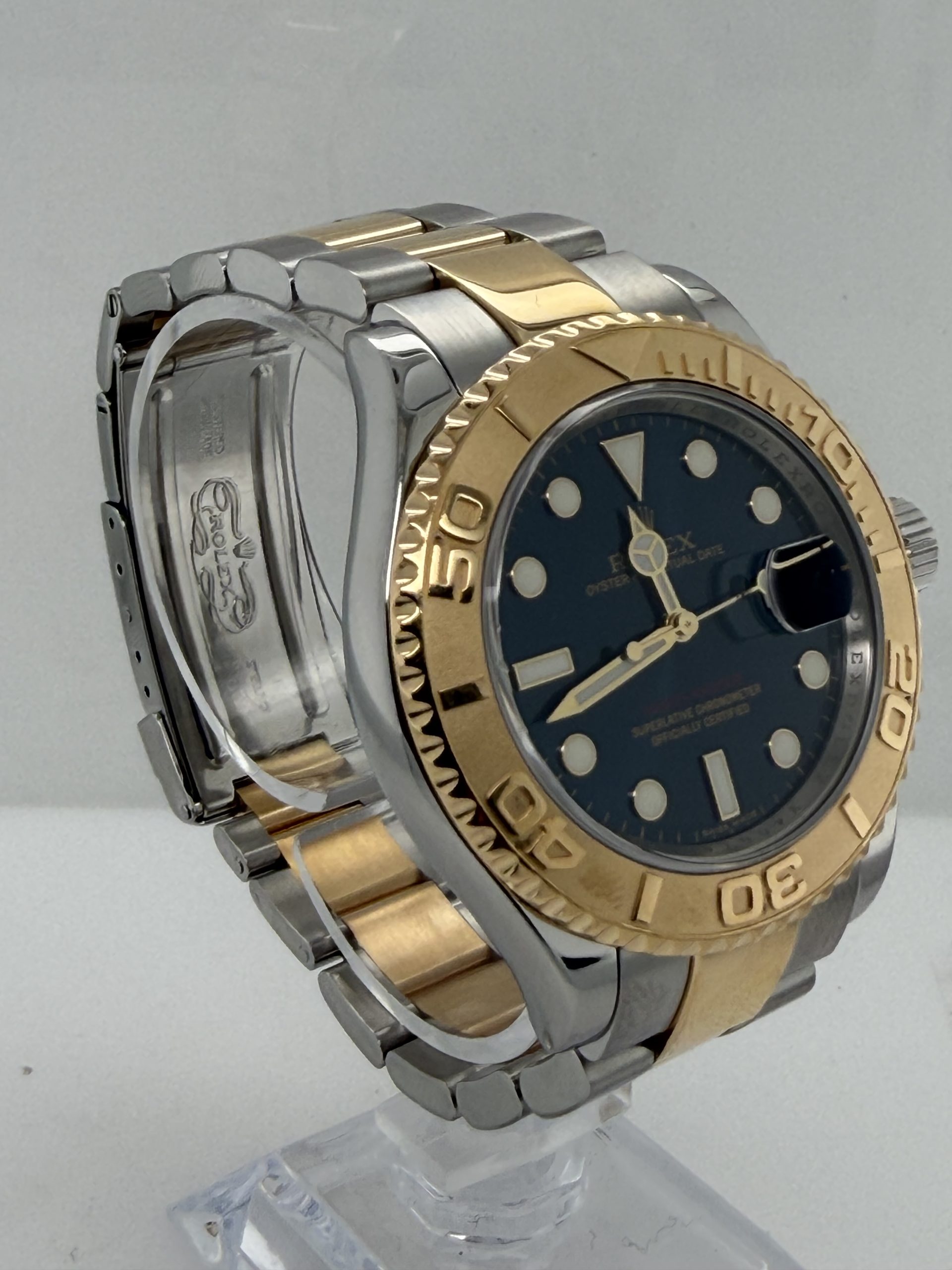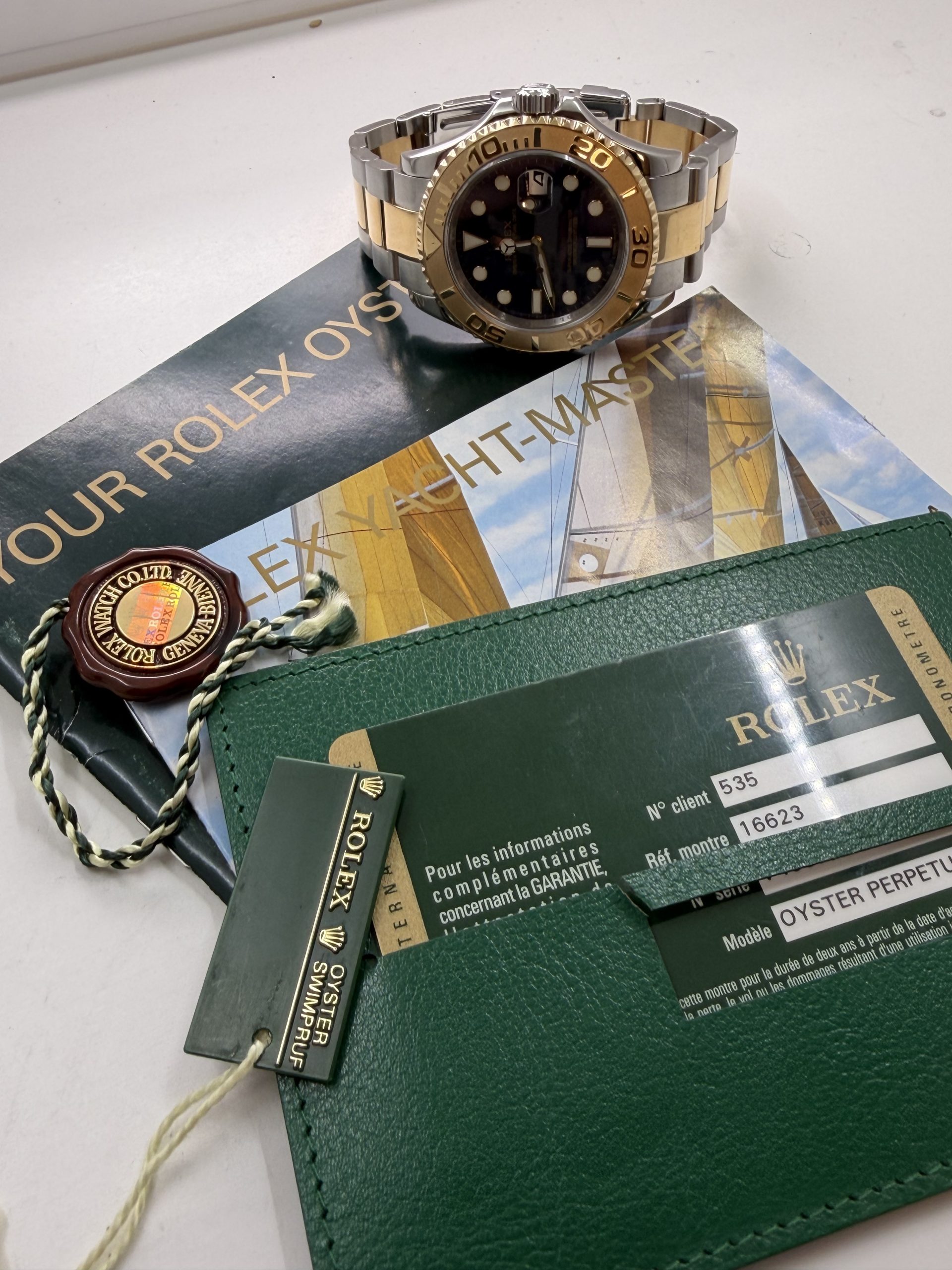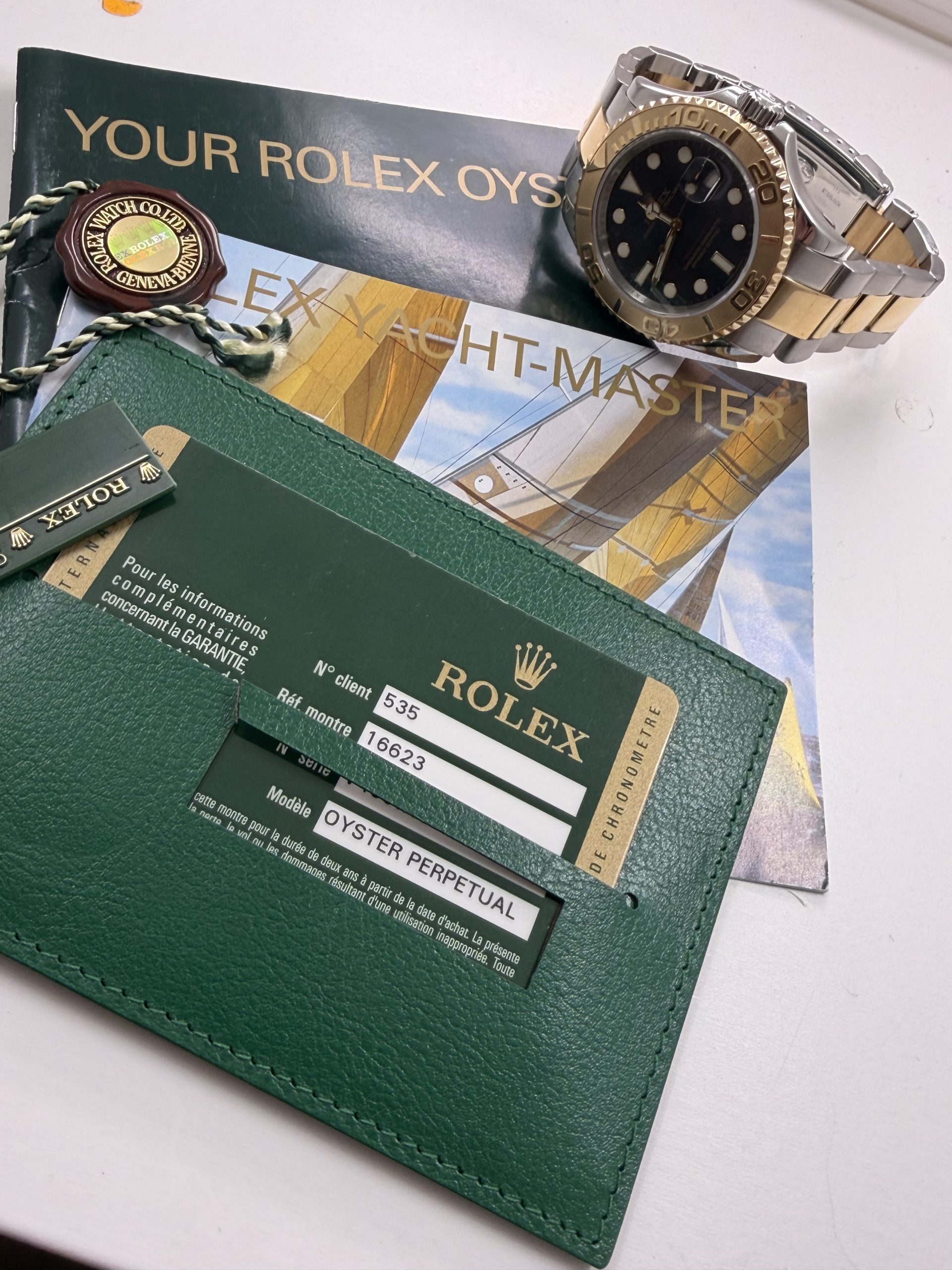 De Rolex Yacht-Master met referentie 16623 is een uitvoering in Oystersteel en 18k geelgoud (Rolesor ) de diameter van de kast is 40mm , de lunette is draaiend en massief goud , saffierglas , automatisch uurwerk kaliber 3135 ( dit uurwerk staat bekend als een van de meest betrouwbare Rolex kaliber ooit) met een gangreserve van circa 48 uur , blauwe wijzerplaat met sunburst effect met Mercedes wijzers met lume , Oyster bracelet met fliplocksluiting geheel compleet met certificaat 2011 met booklets etc voor de prijs van €10481