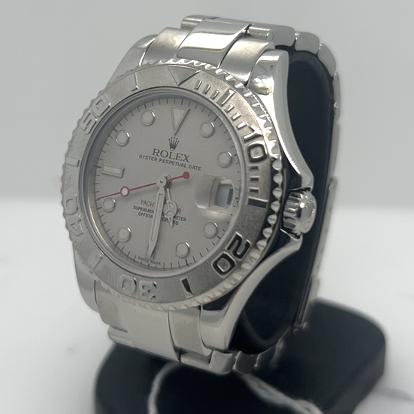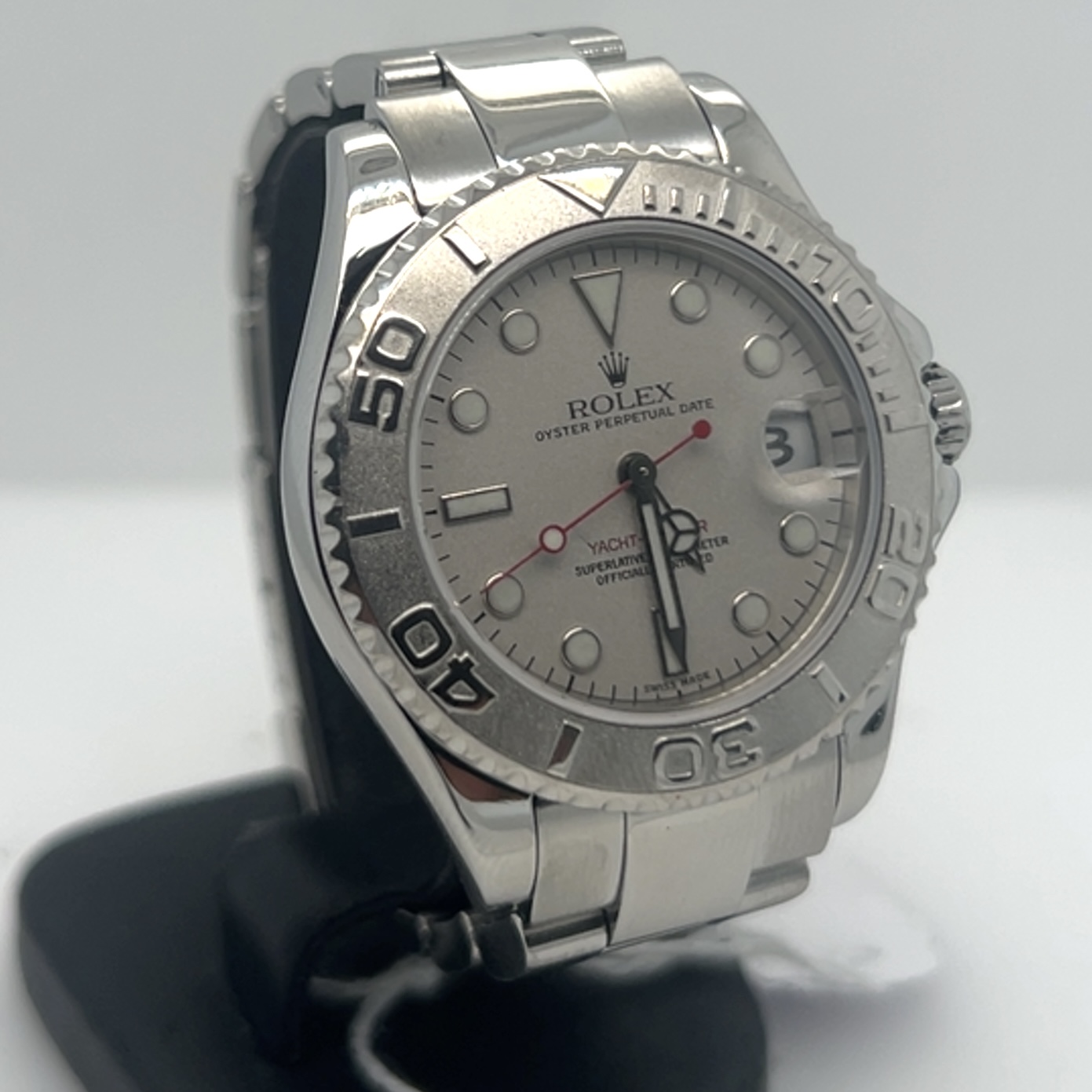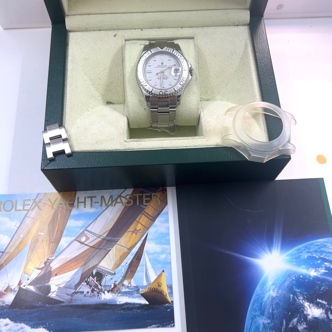 De Rolex Yacht- master “midsize” heeft referentie 168622 met een kastdiameter van 35 mm, combineert roestvrij staal met platina ,Rolex noemt deze combinatie Rolesium ,dat betekent dat de kast en band van staal zijn en de bezel en wijzerplaat van platina zijn. Saffierglas, automatisch uurwerk caliber 2235,luminescente uurmarkeringen en wijzers,de beroemde Oyster bracelet met vouwsluiting , Dit exemplaar komt met een servicekaart van rolex en de originele doos voor de prijs van 6.200 euro