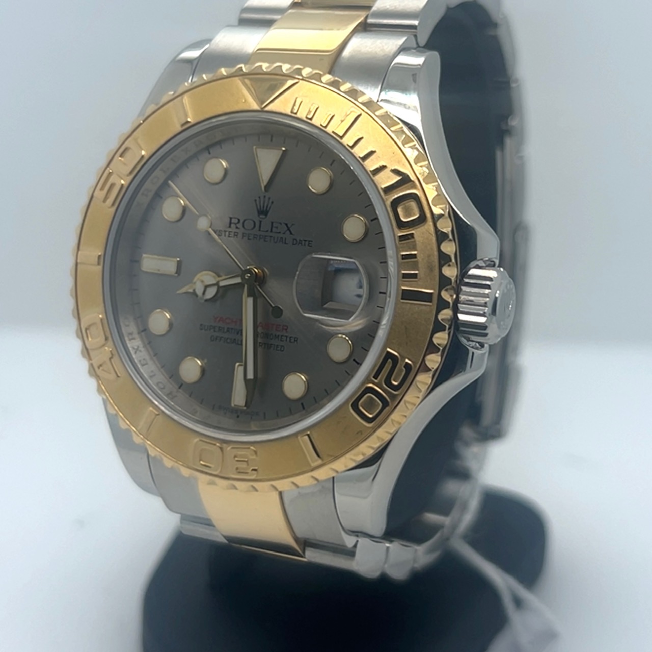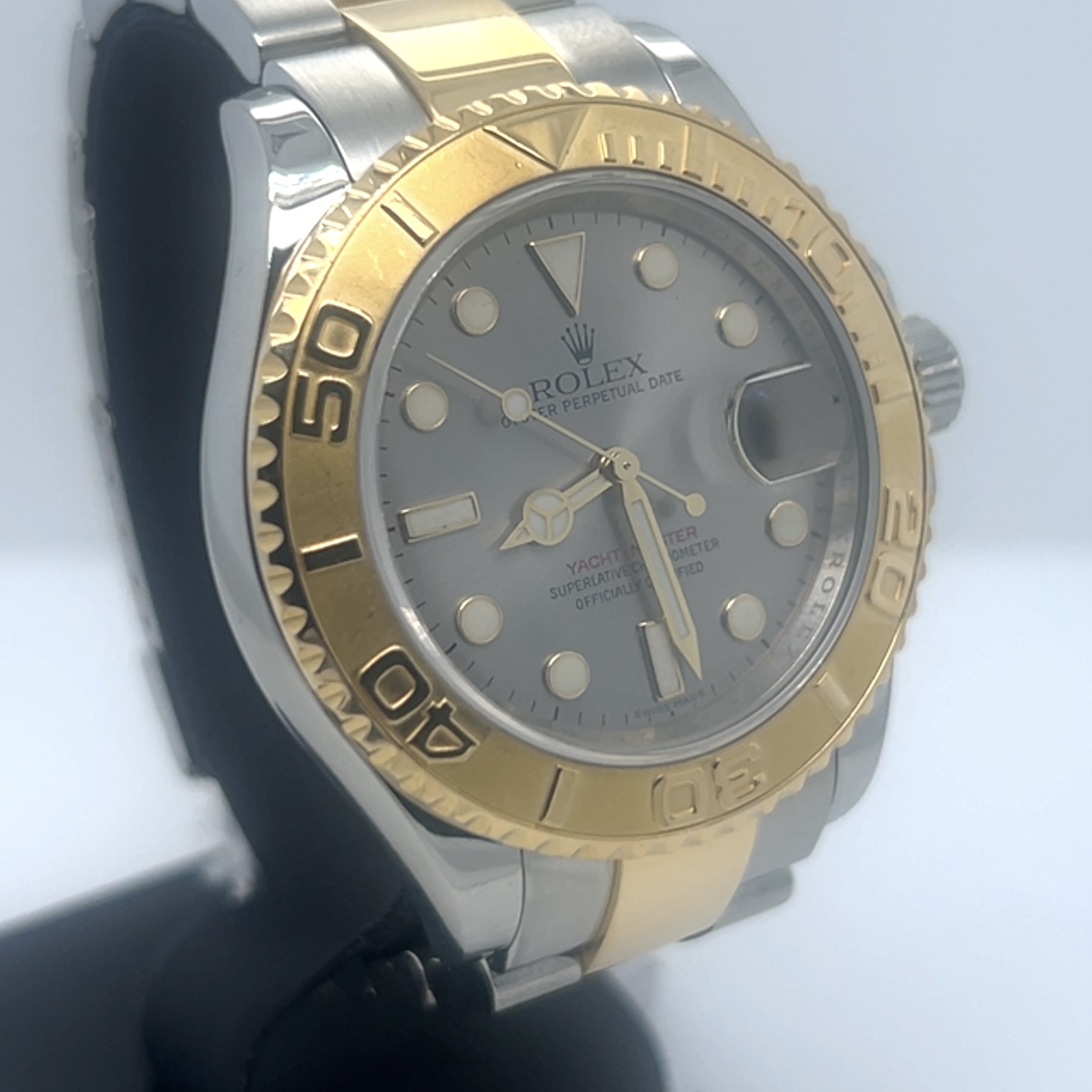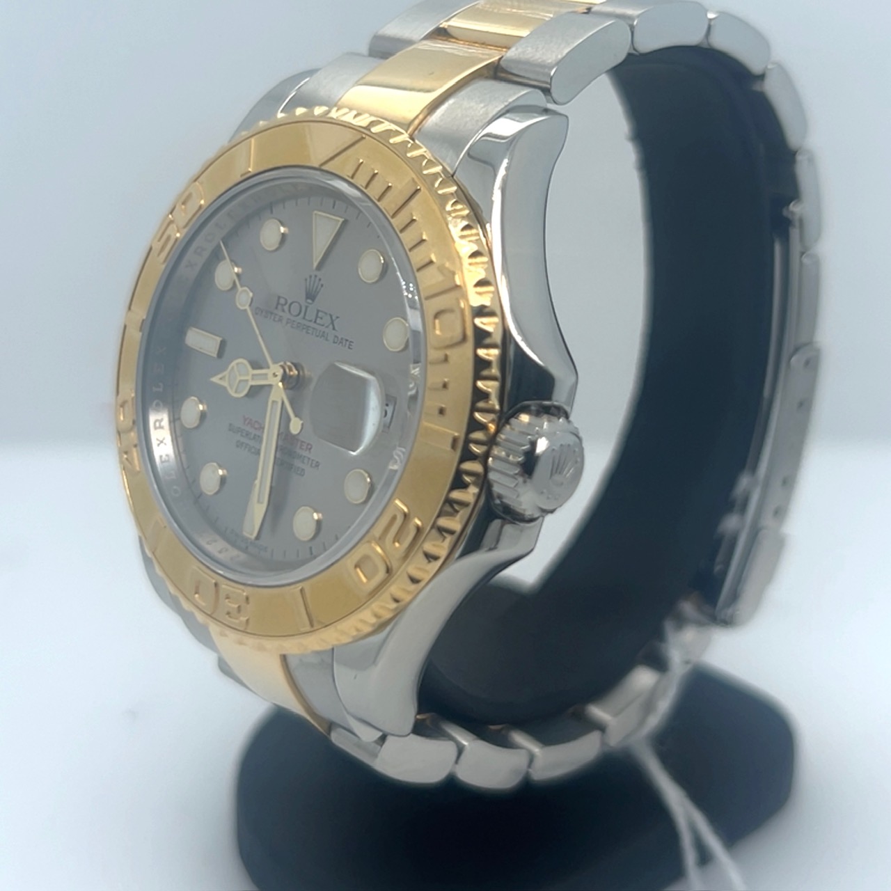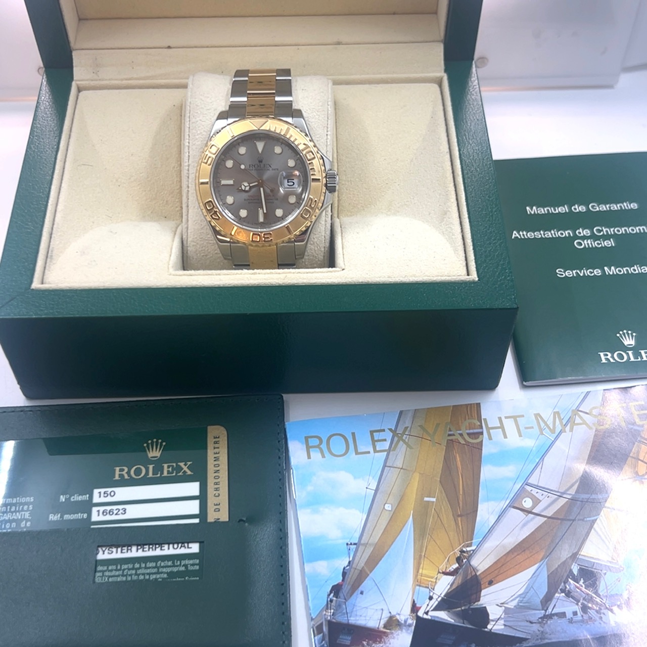 Deze populaire tweekleurige Rolex Yacht-Master met referentie 16623 , de roestvrij stalen kast heeft een diameter van 40 mm lunette in 18 k geel goud ,automatisch uurwerk Rolex calibre 3135 (COSC- gecertificeerd), gangreserve van ca 48 uur, grijze sunburst dial ,Oyster-armband gecombineerd staal en 18 k geel goud (Rolesor) met een vouwsluiting en veiligheidsclip ,in zeer goede staat komt met booklets ,certificaat 2011, de originele doos voor de prijs van 10.384 euro met garantie