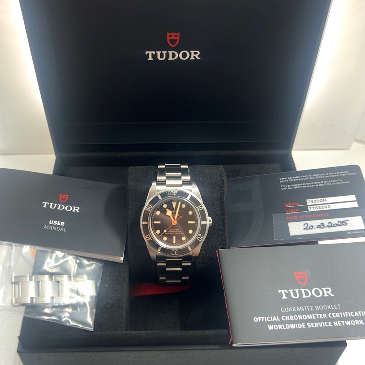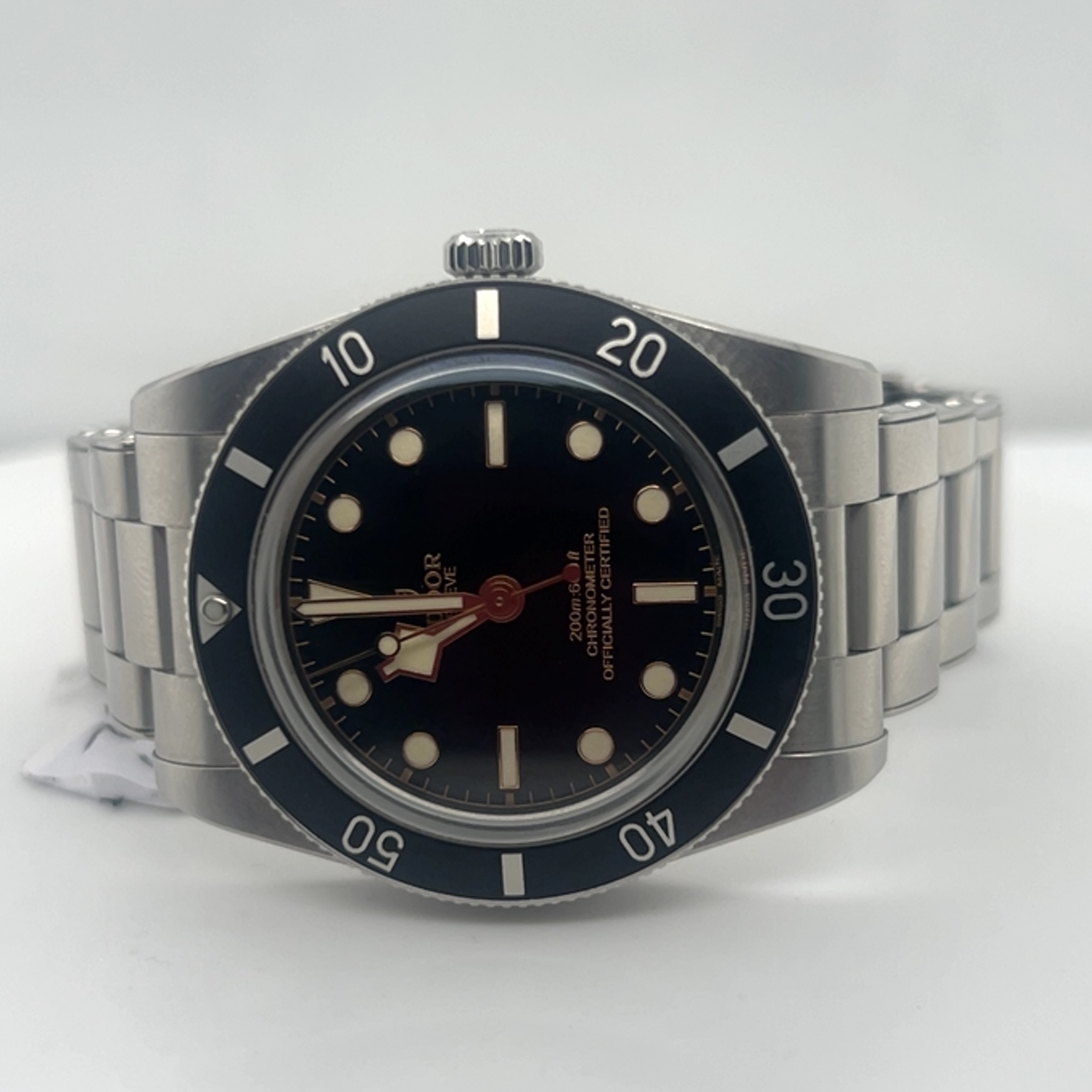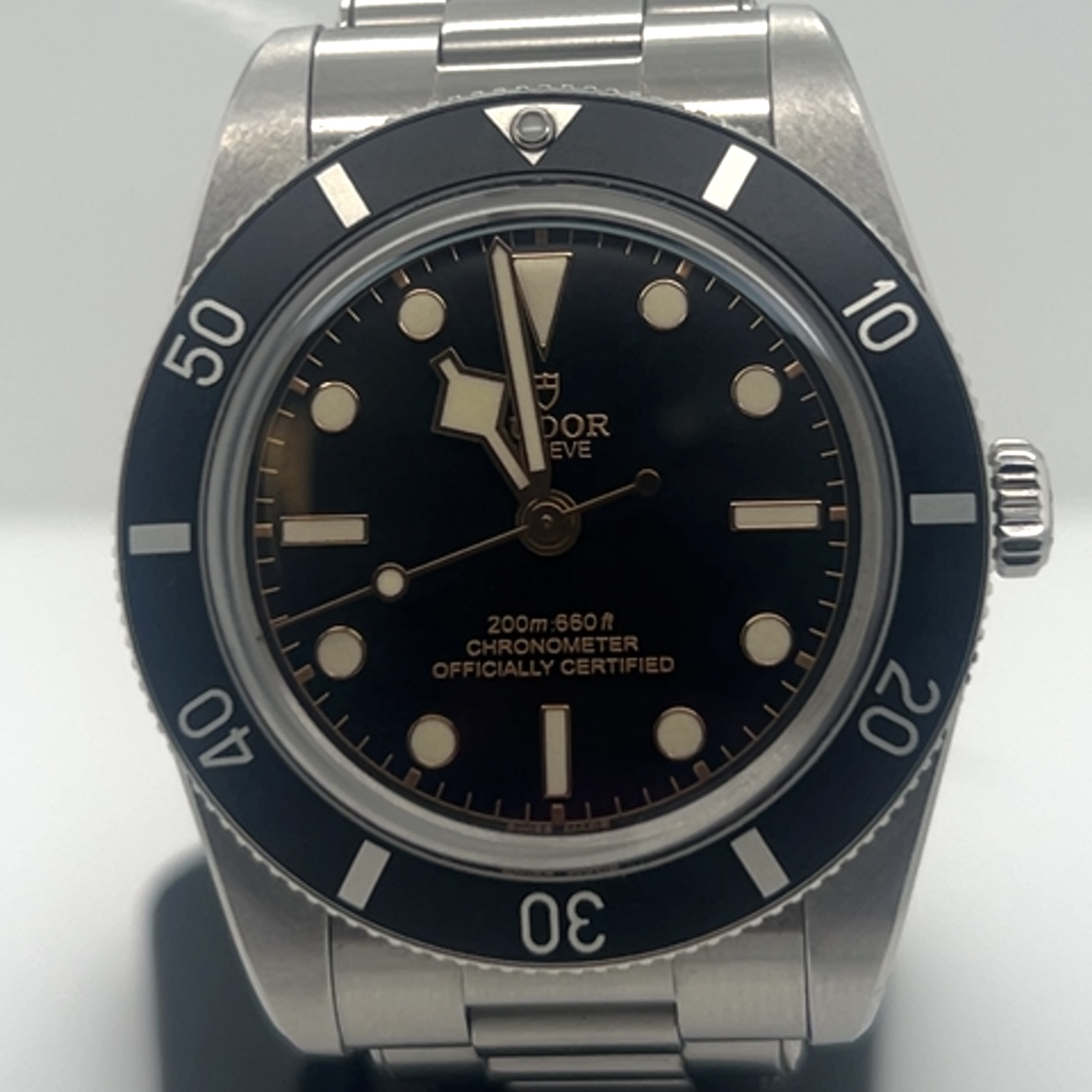 Tudor Black Bay54 met referentie 79000N (de nieuwste Black Bay-lijn), roestvrij stalen kast 37 mm, glas bol(domed) saffierkristal , lunette unidirectionele (duikring)met een aluminium inleg zonder minuut markering , Automatisch uurwerk Kaliber Manufacture Calibre MT5400 (COSC gecertificeerds) met een gangreserve ~70uur , zwarte wijzerplaat ,indexen opstaande uurmarkers met super-luminova , wijzers Typische snowflake uurwijzersminutenwijzer en lollipops secondewijzer ,schroefkroon van staal , 3-link stalen armband met vouwsluiting , geheel compleet met doos ,booklets , certificaat voor de prijs van 3.485 euro