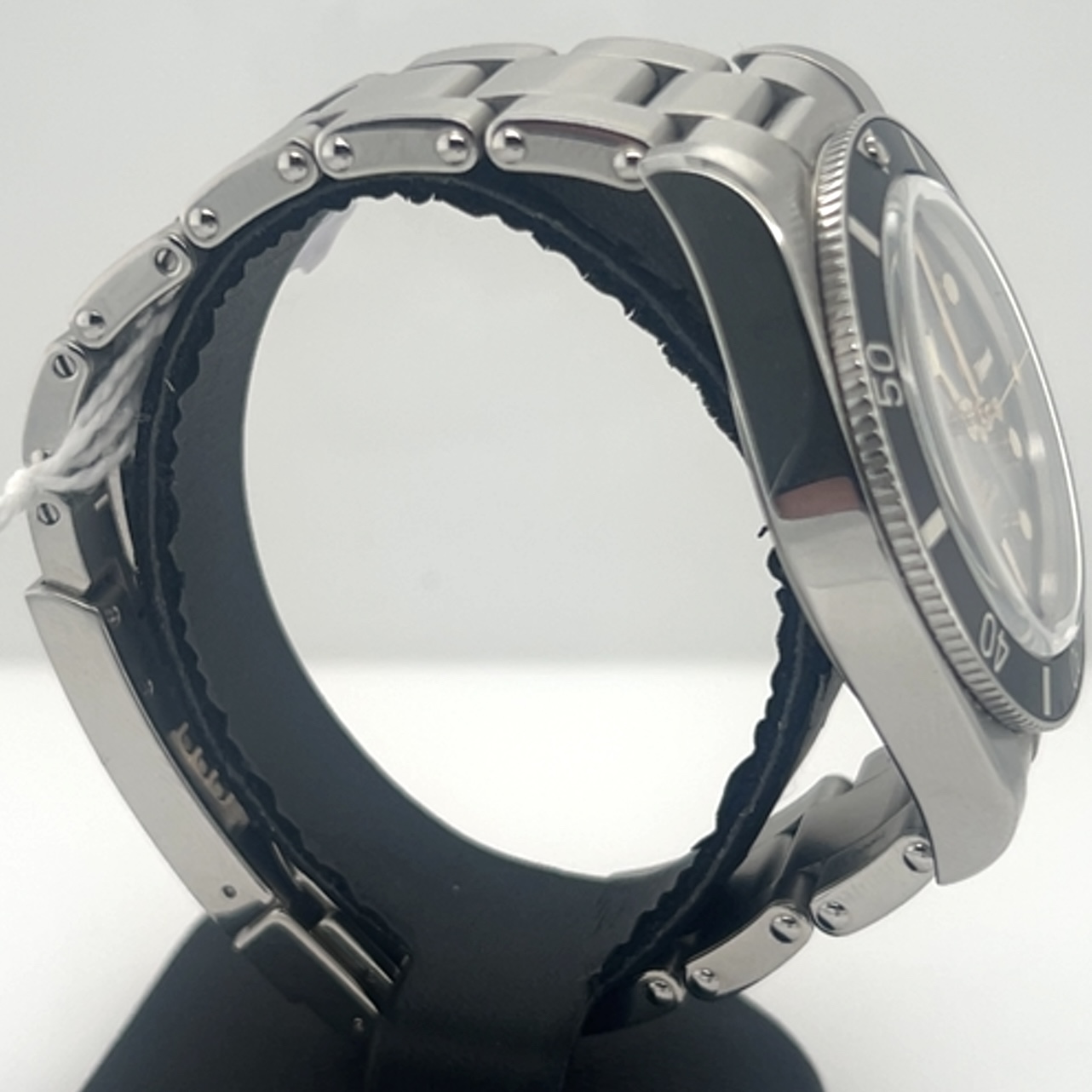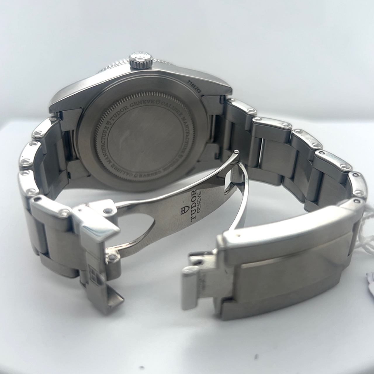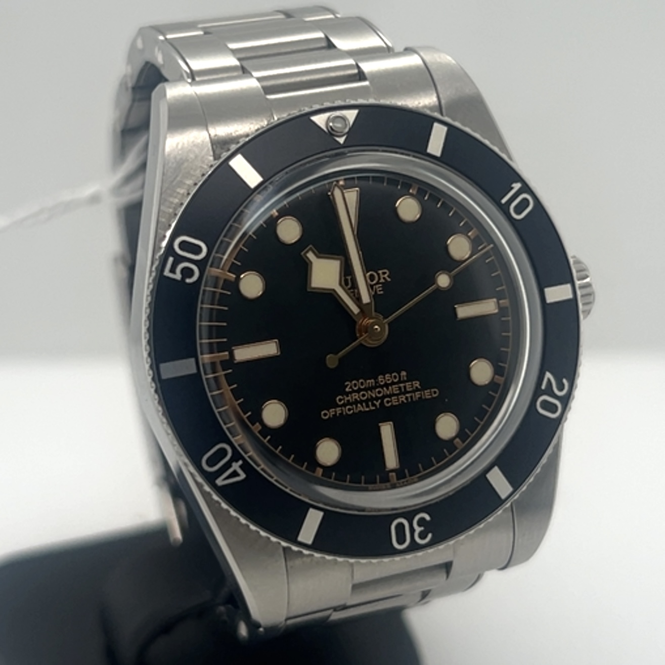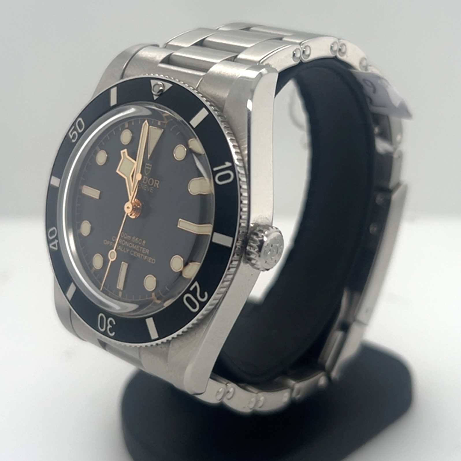 Tudor Black Bay54 met referentie 79000N (de nieuwste Black Bay-lijn), roestvrij stalen kast 37 mm, glas bol(domed) saffierkristal , lunette unidirectionele (duikring)met een aluminium inleg zonder minuut markering , Automatisch uurwerk Kaliber Manufacture Calibre MT5400 (COSC gecertificeerds) met een gangreserve ~70uur , zwarte wijzerplaat ,indexen opstaande uurmarkers met super-luminova , wijzers Typische snowflake uurwijzersminutenwijzer en lollipops secondewijzer ,schroefkroon van staal , 3-link stalen armband met vouwsluiting , geheel compleet met doos ,booklets , certificaat voor de prijs van 3.485 euro
